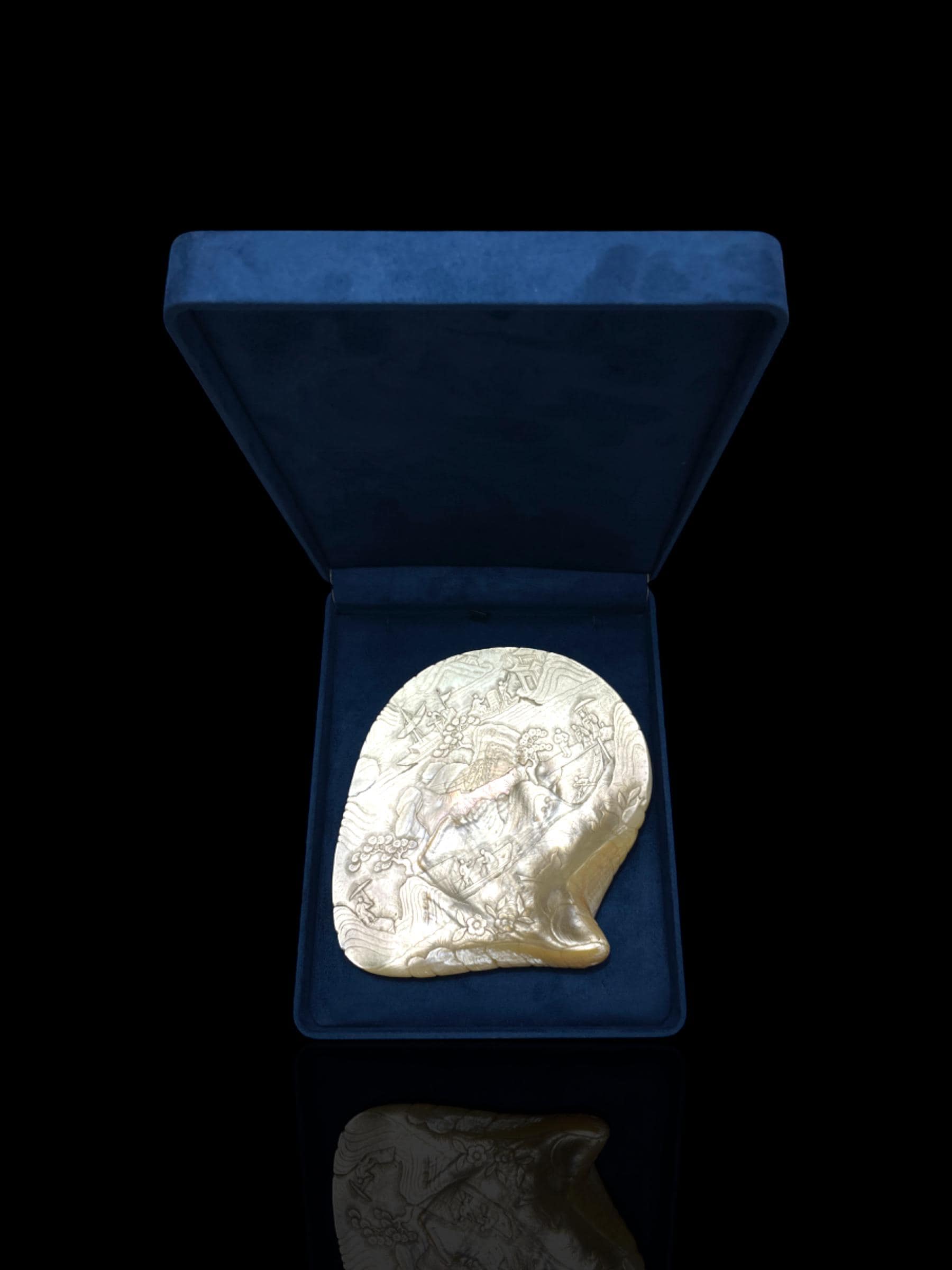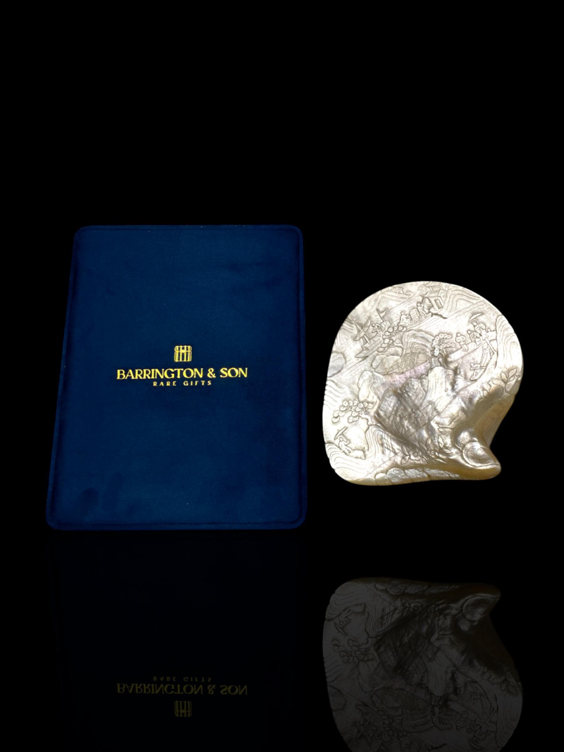 The shell has been traded to China where it has been hand-carved in the early 1800s. The Chinese carvers were the best in the world and this is a fine example of the very best of their craftsmen. The artwork depicts trading between islands and is boarded by mountians and trees.