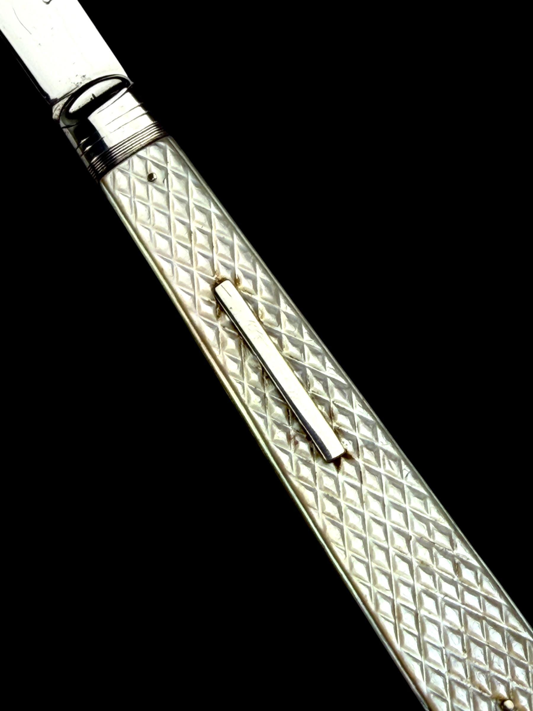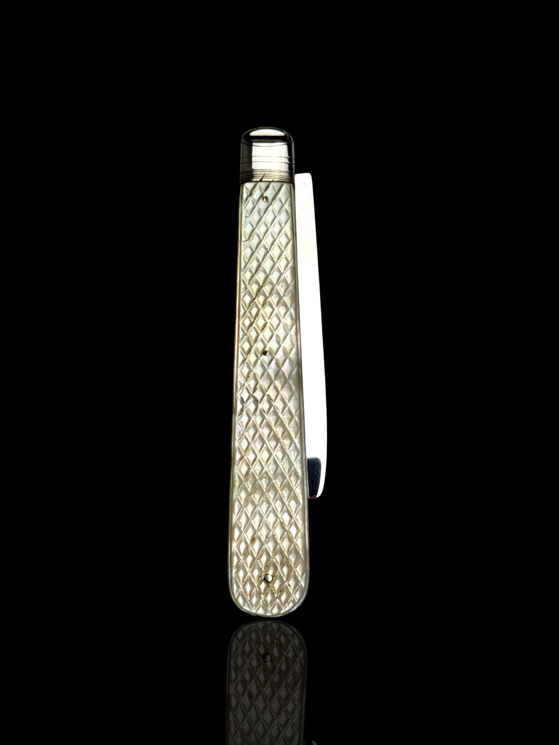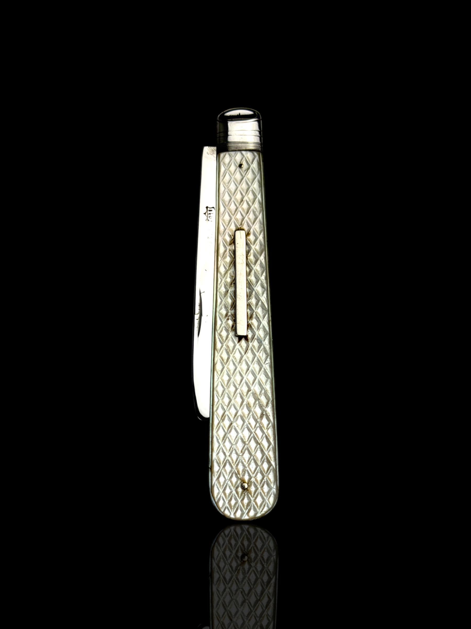 The standout feature of this knife is finely carved mother of pearl handle. It is high quality mother of pearl which almost certainly would have been carved from Australian pearl shell which were exported to England from the 1800s. The handle has a clean sterling silver name plate which will allow the new owner to apply their own initials.