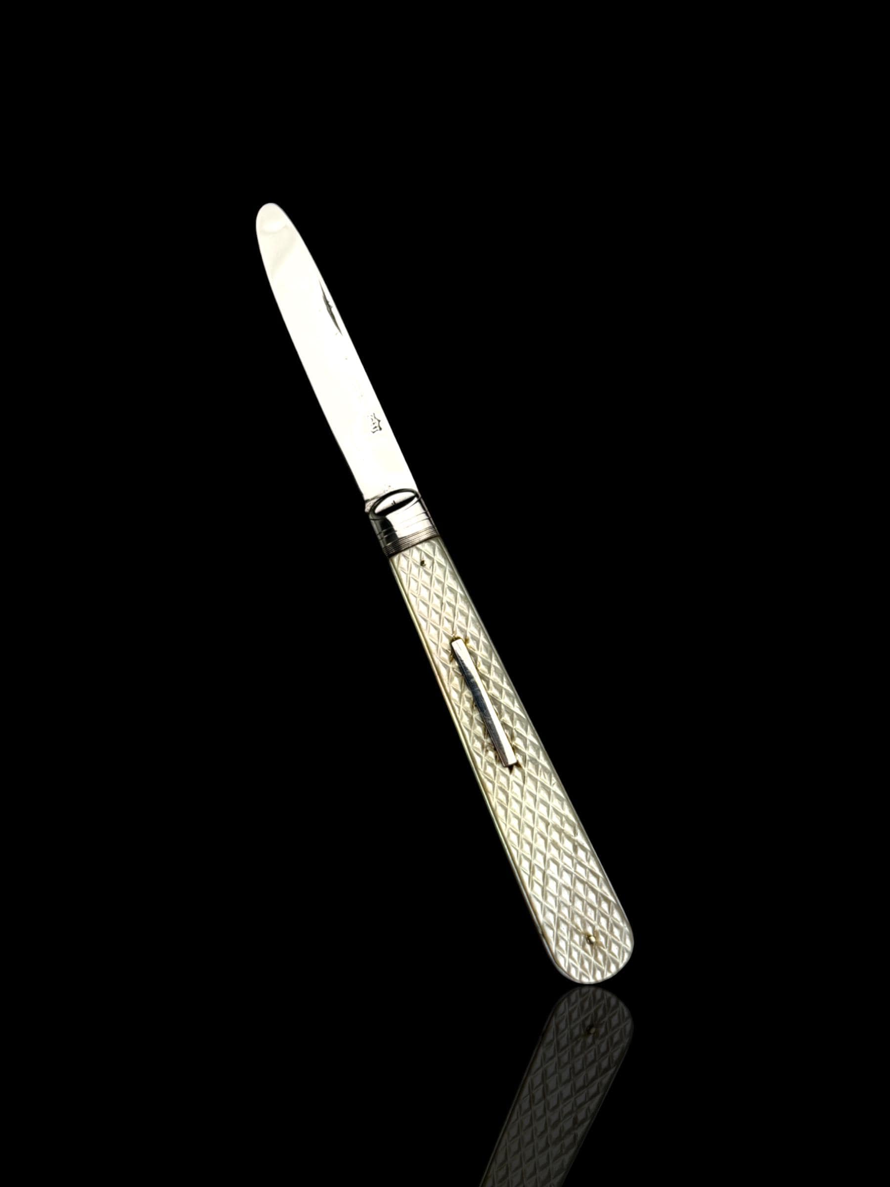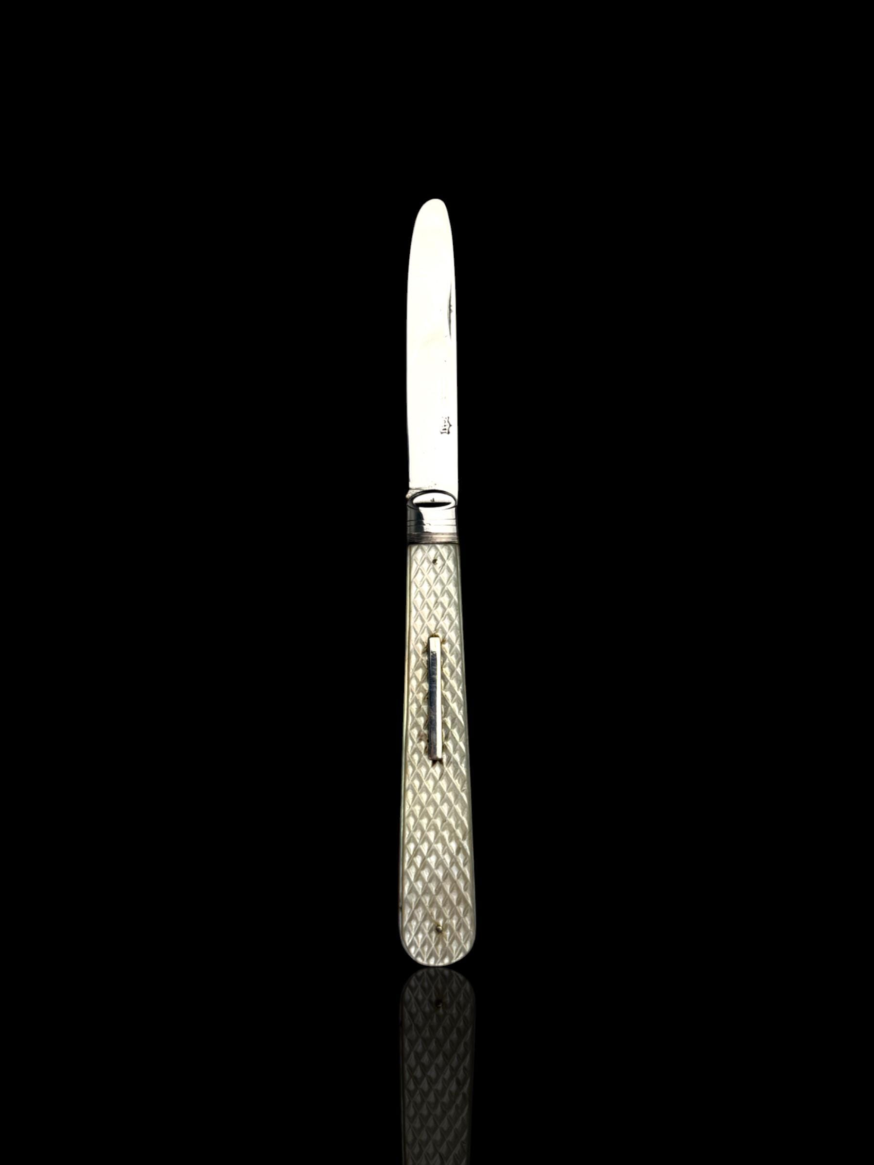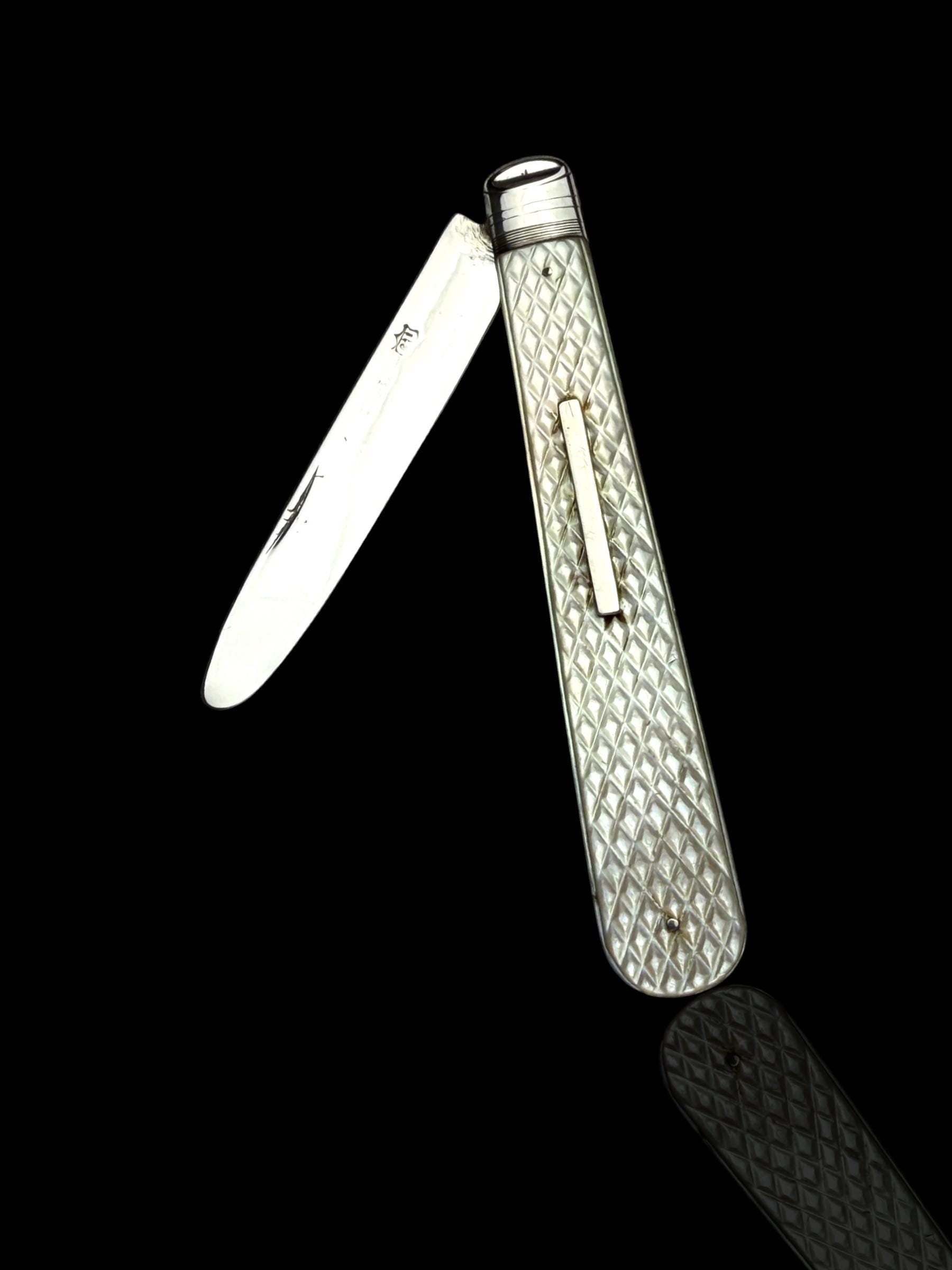 The standout feature of this knife is finely carved mother of pearl handle. It is high quality mother of pearl which almost certainly would have been carved from Australian pearl shell which were exported to England from the 1800s. The handle has a clean sterling silver name plate which will allow the new owner to apply their own initials.