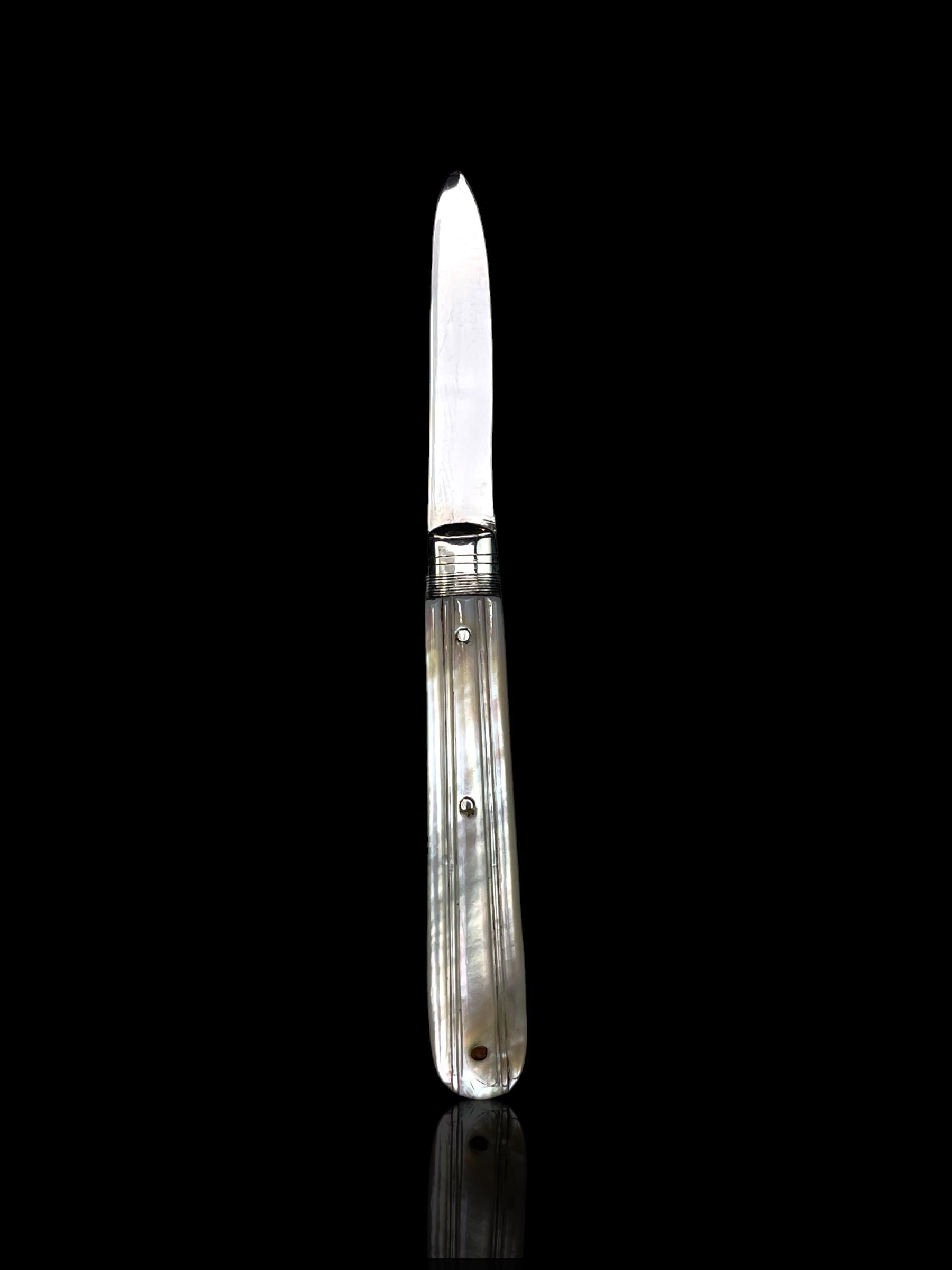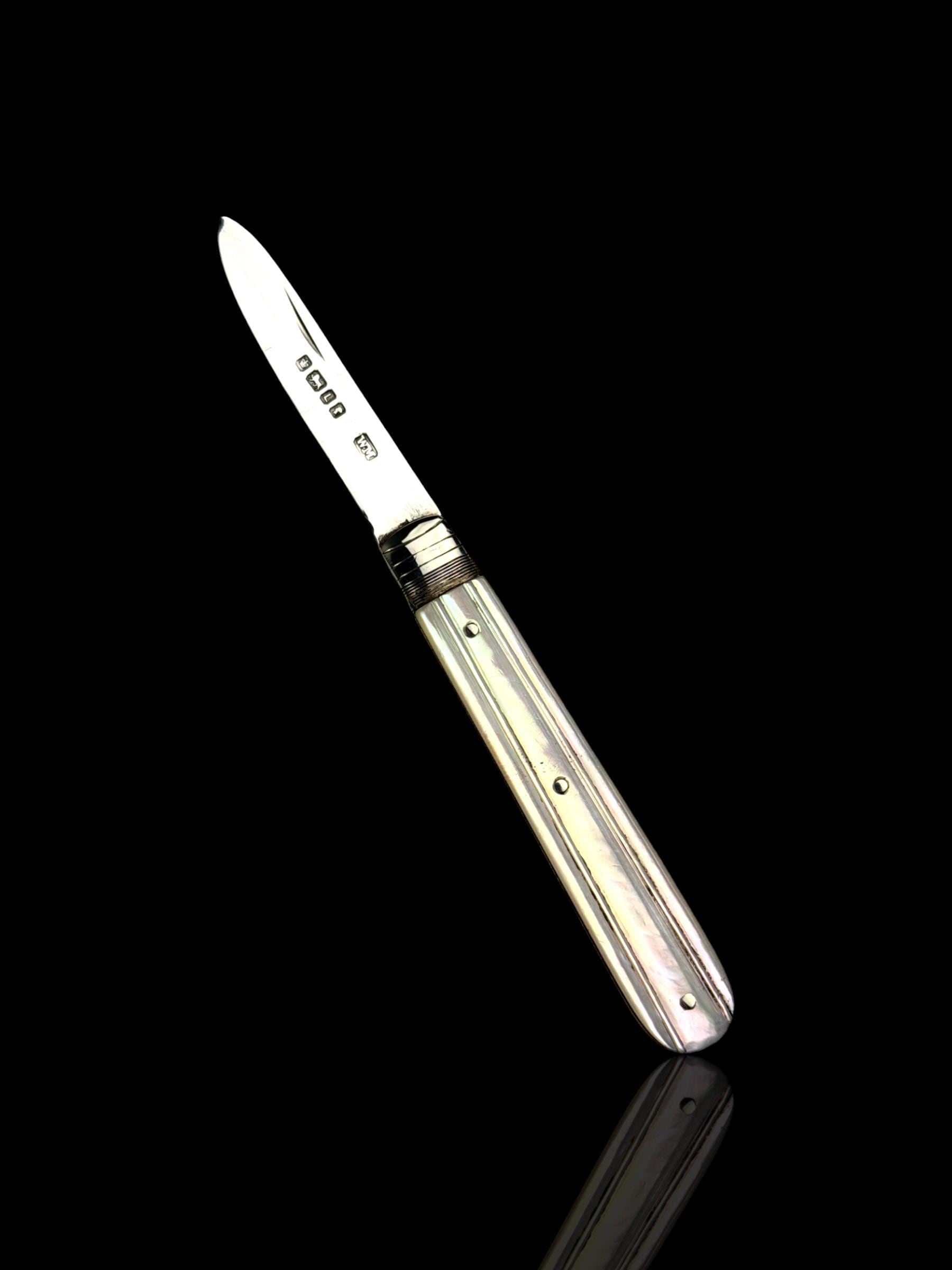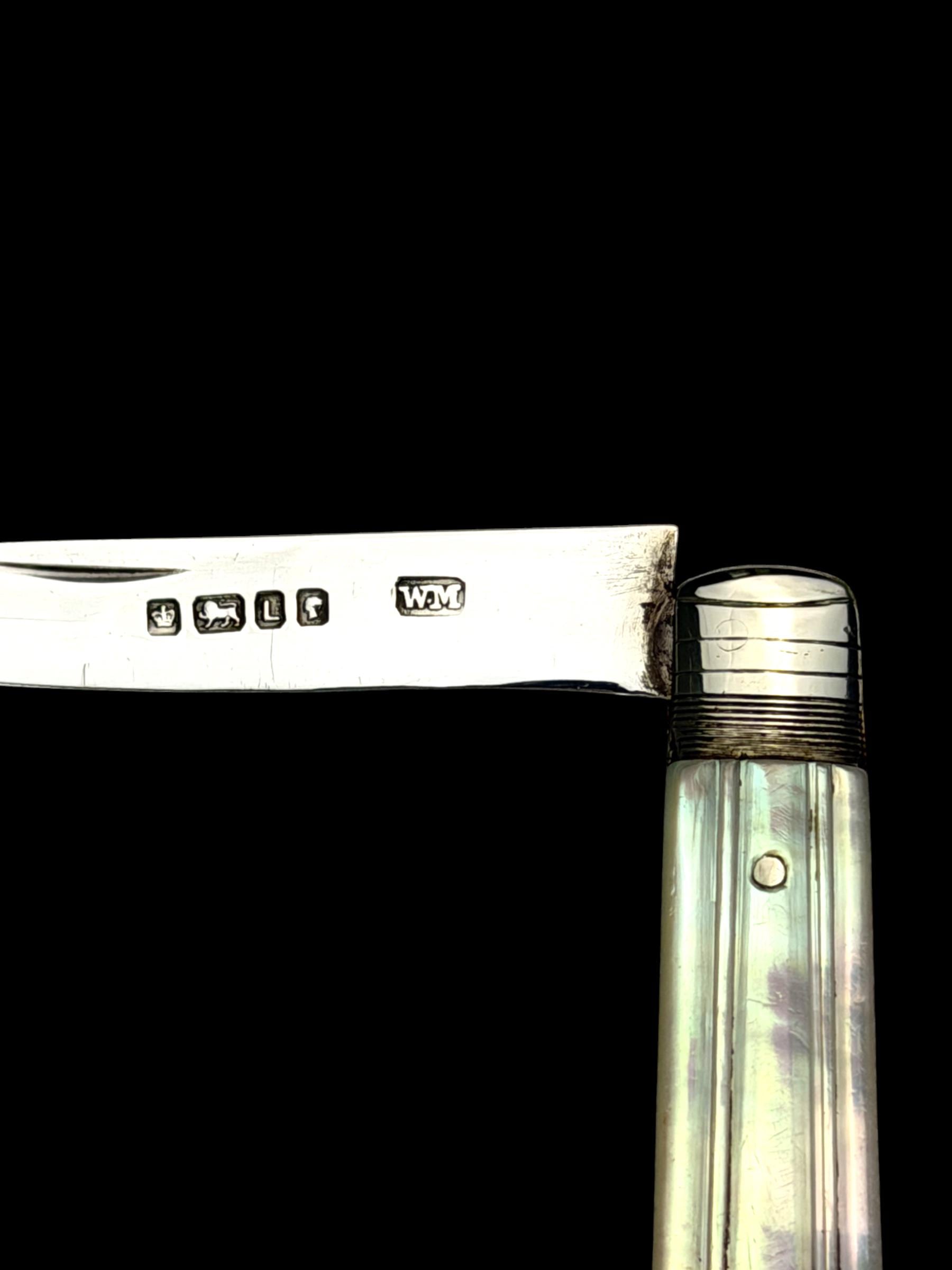 The elegantly carved handle is the feature of this knife. It is high quality mother of pearl which would likely have been carved from Australian pearl shell which were exported to England from the 1800s.