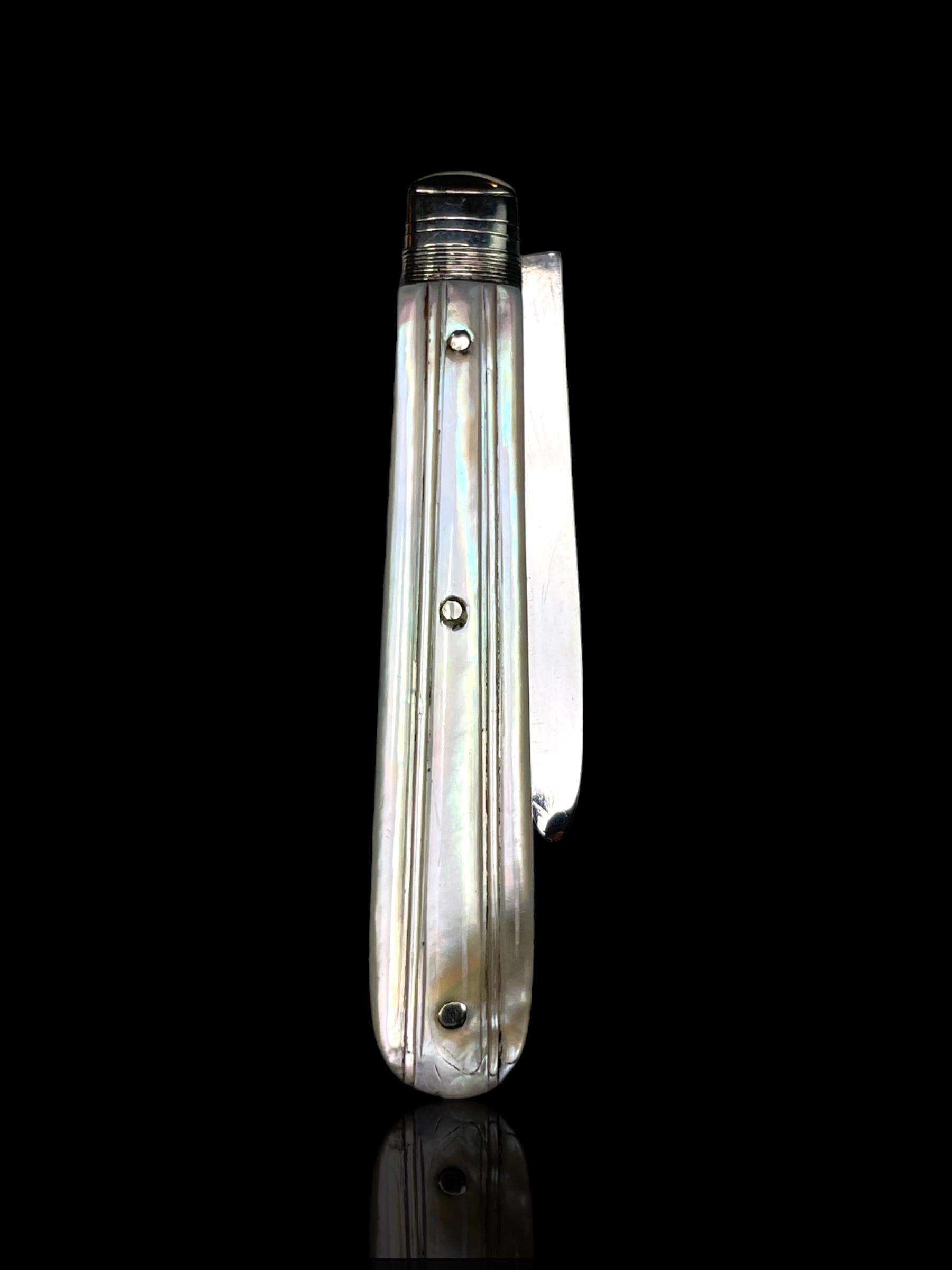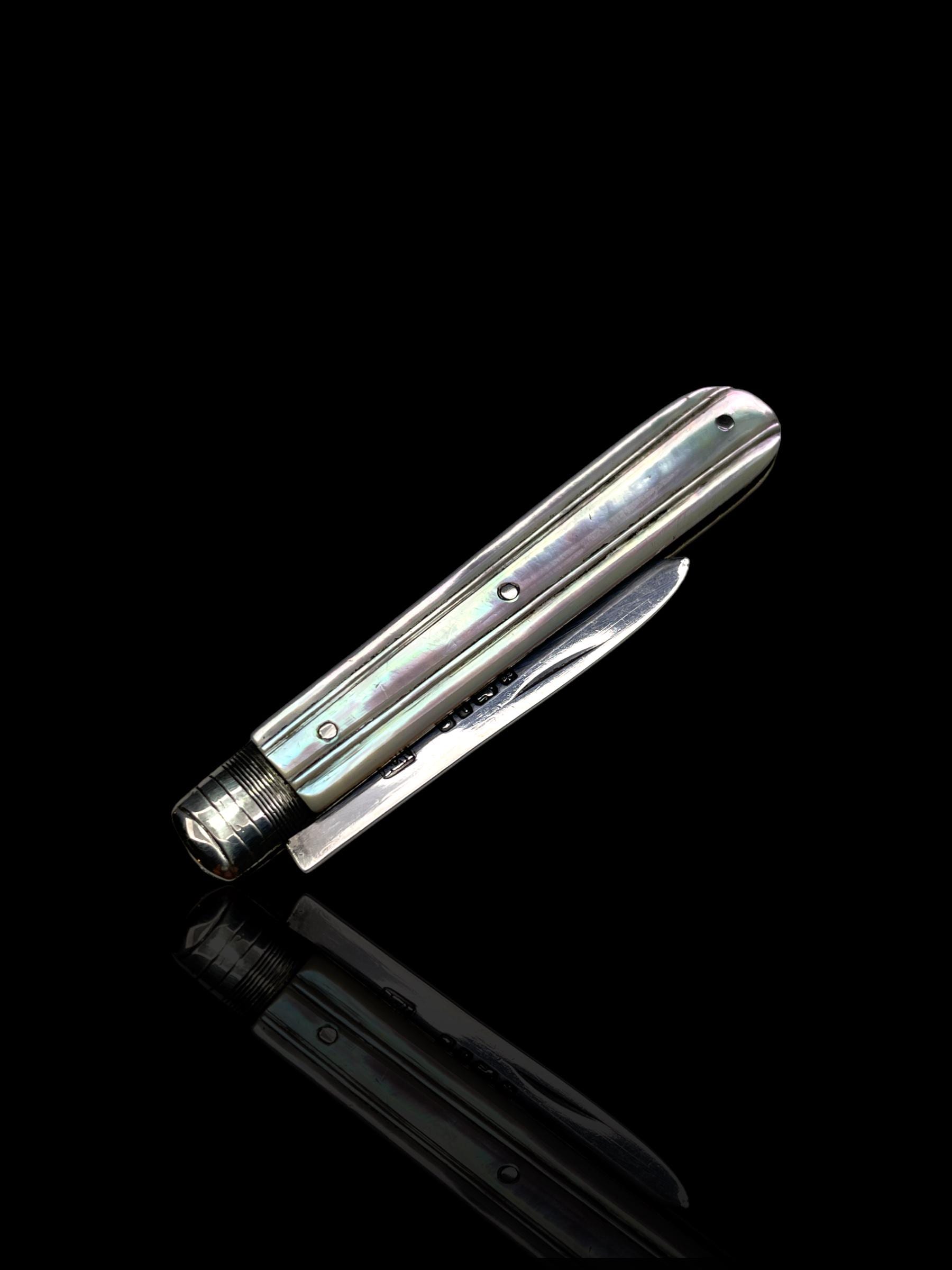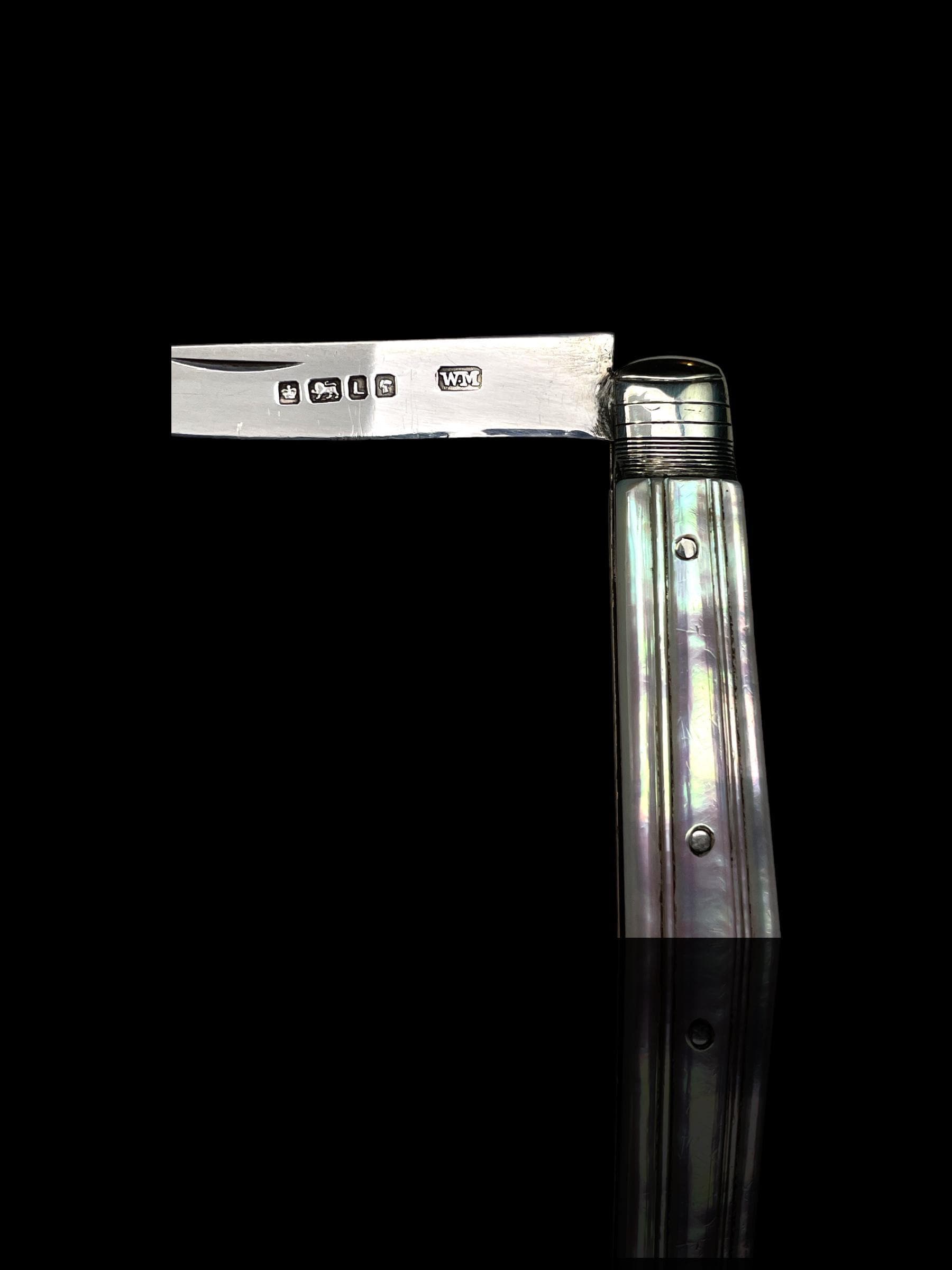 The elegantly carved handle is the feature of this knife. It is high quality mother of pearl which would likely have been carved from Australian pearl shell which were exported to England from the 1800s.