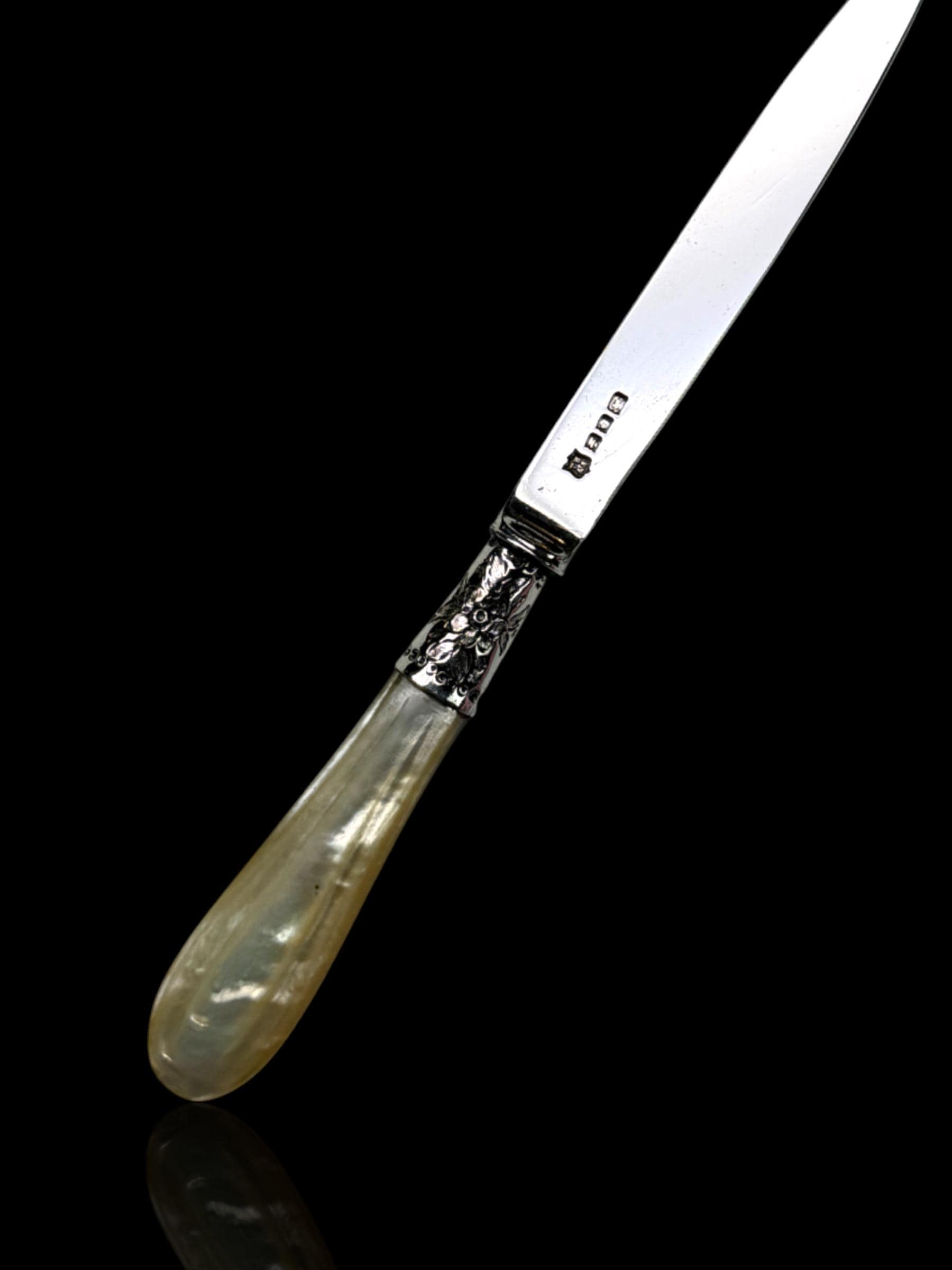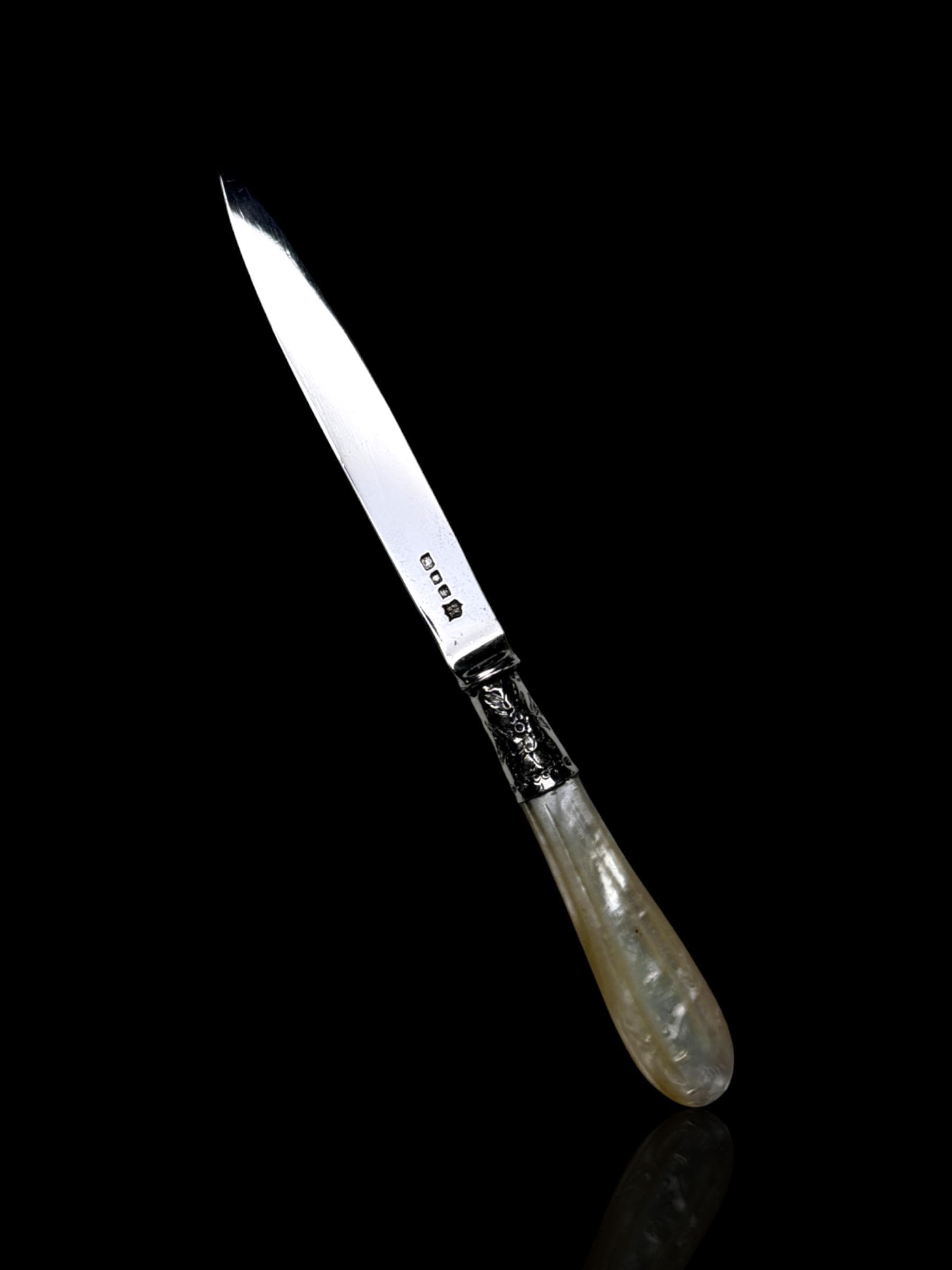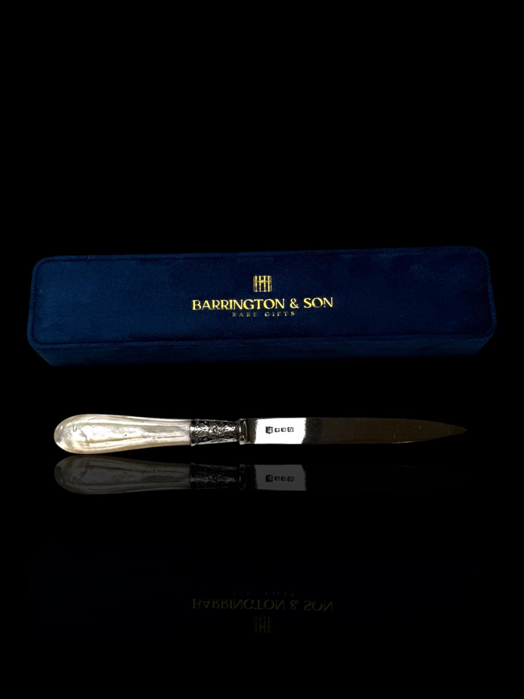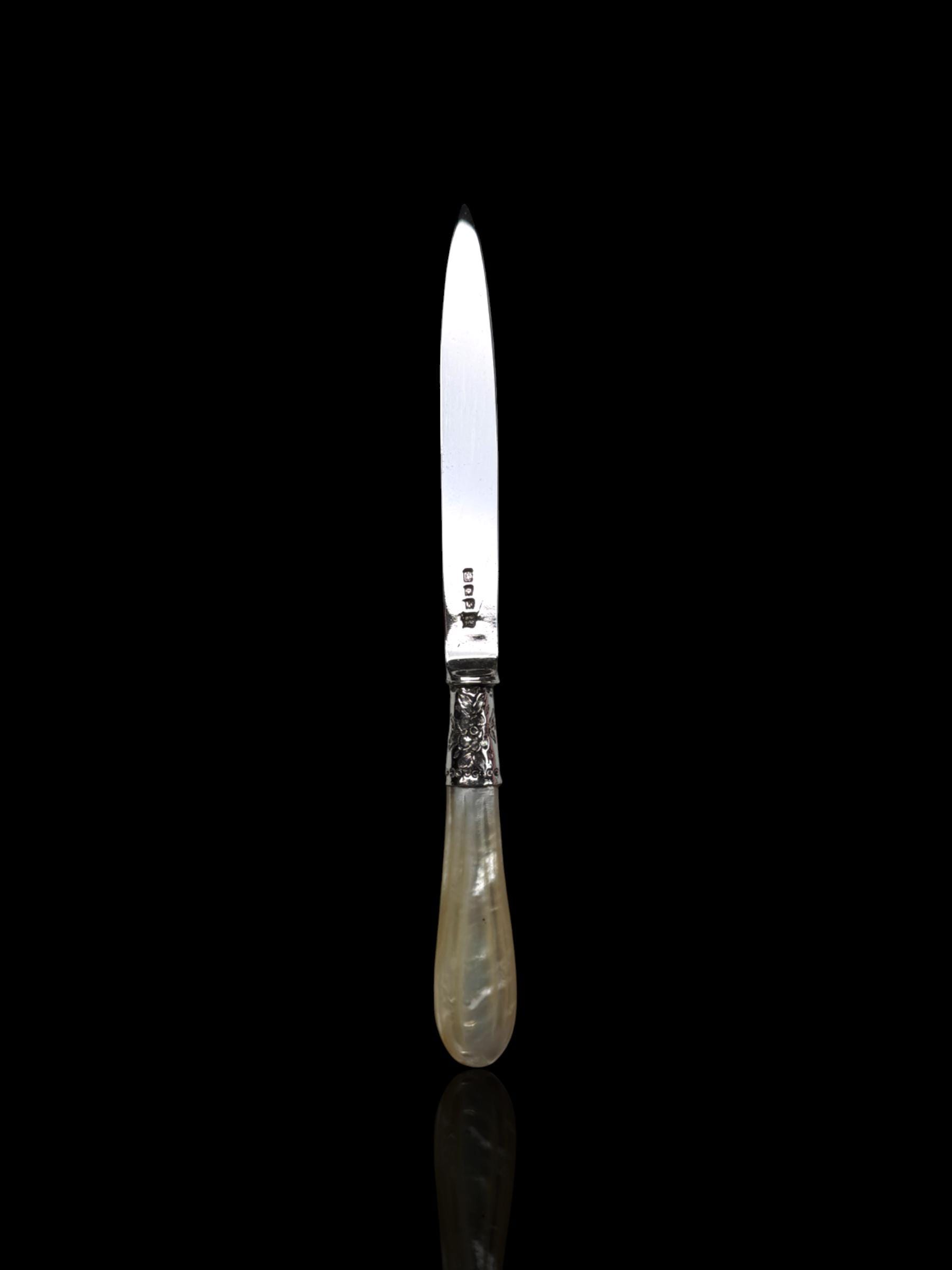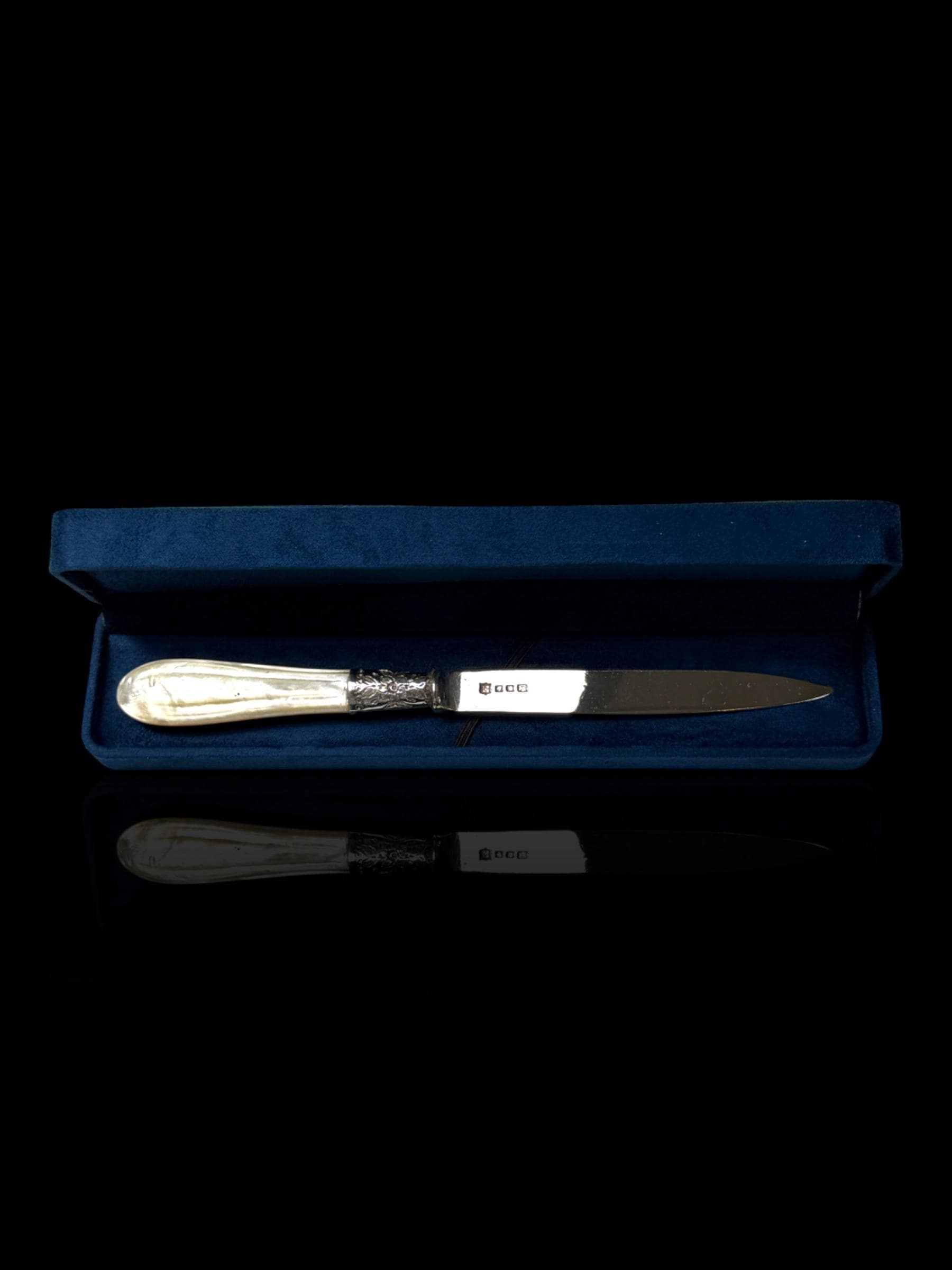 A lovely object to have on a desk or dining table. The hand-carved handle is high quality mother of pearl which almost certainly would have been carved from Australian pearl shell which were exported to England from the 1800s.