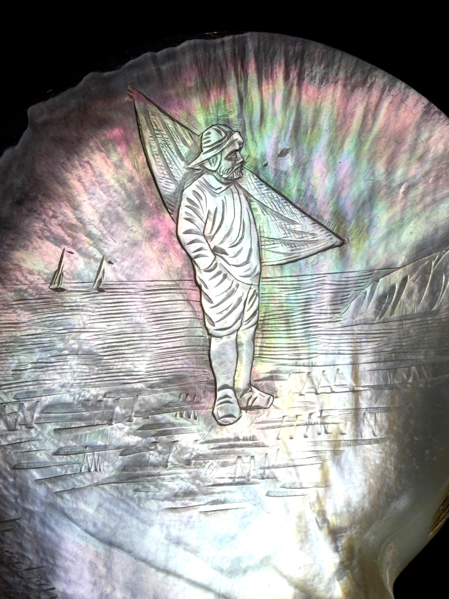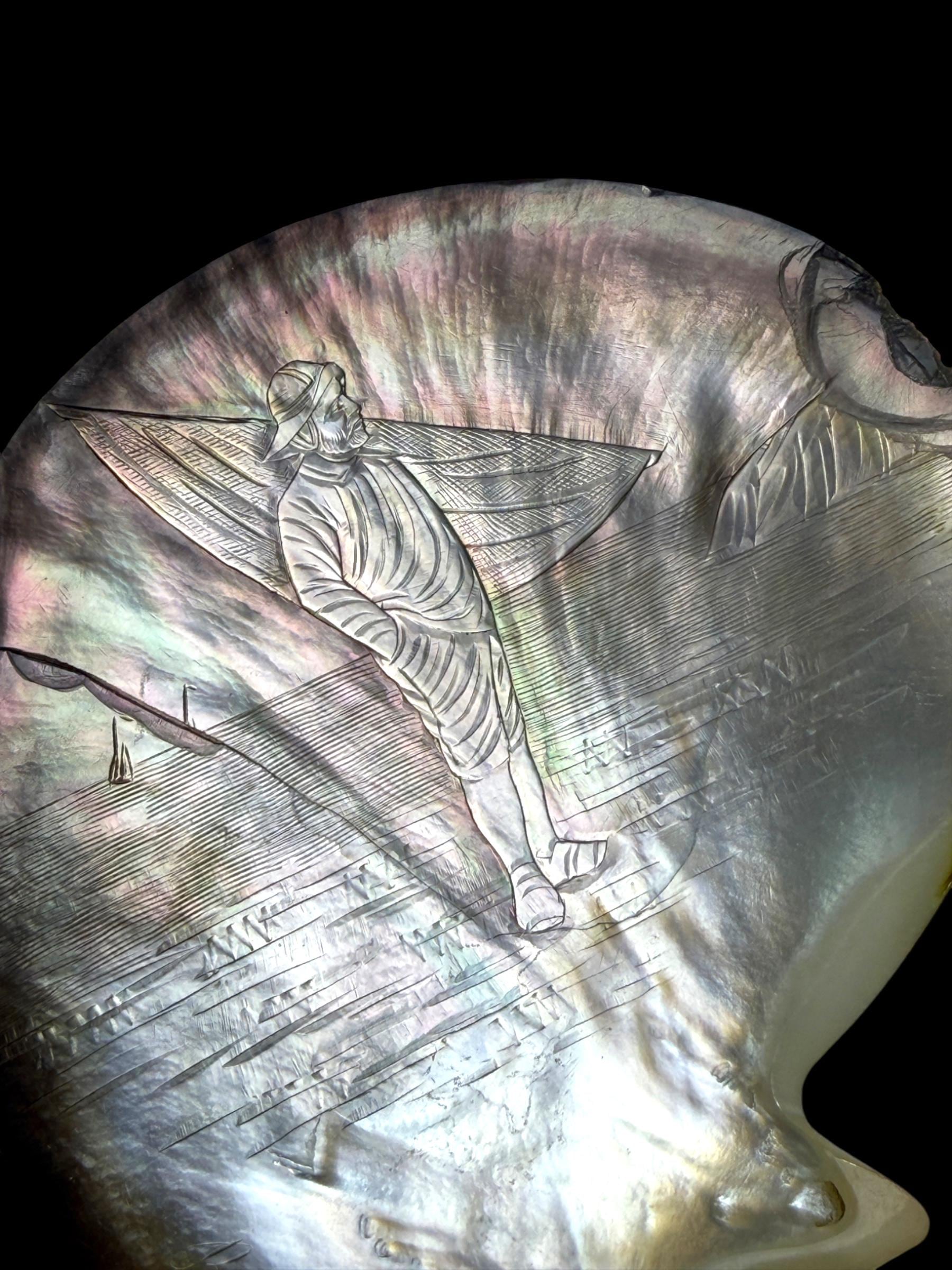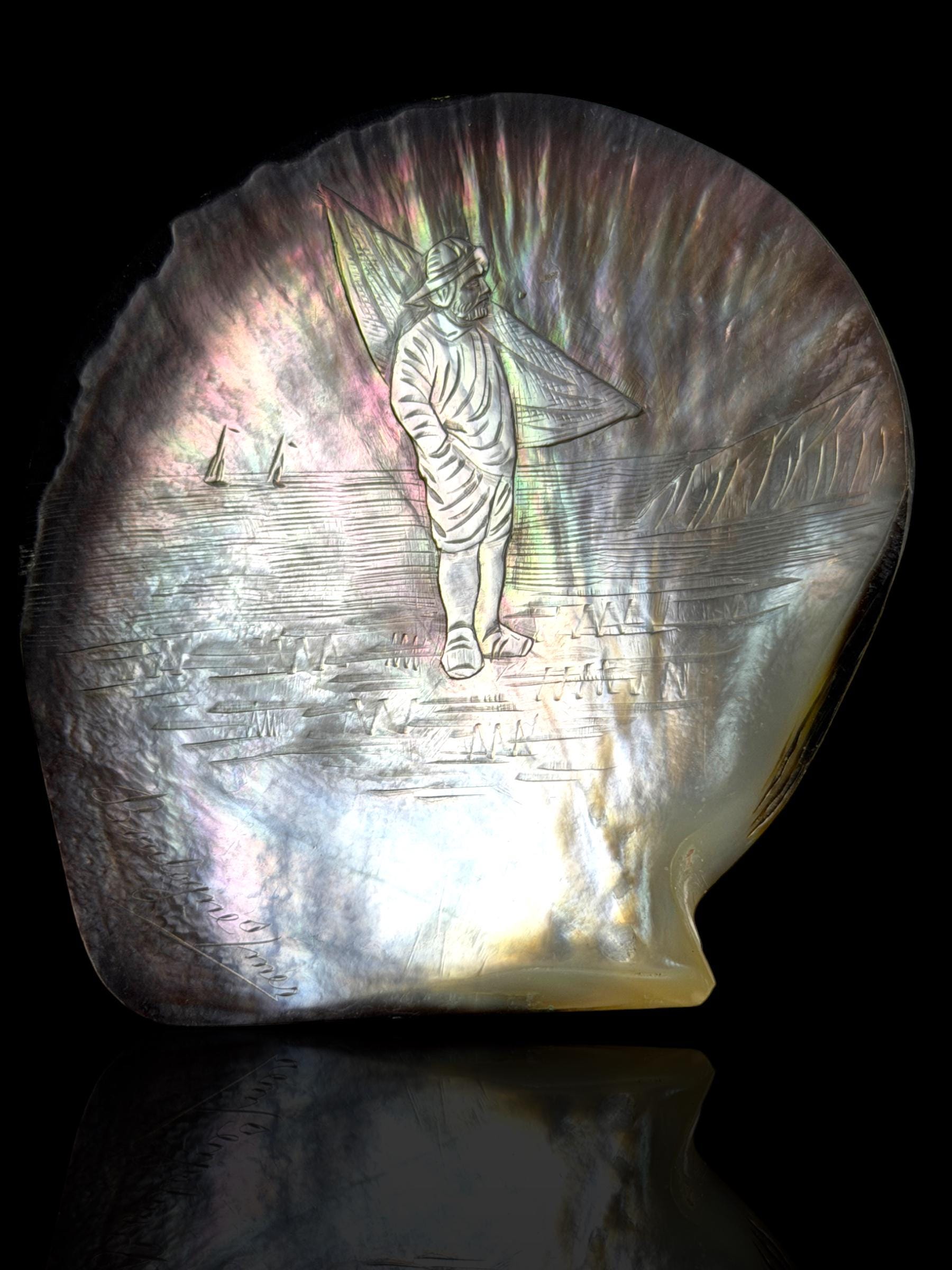Hand carved from the Pinctada margaritifera or black lipped pearl oyster. It was carved in France and depicts a French Fisherman. Such carving were mainly produced in the coastal towns and sold to visiting tourists in the 19th century. They were made from pearl shell which were imported from their colonies in volume from the 1840s.