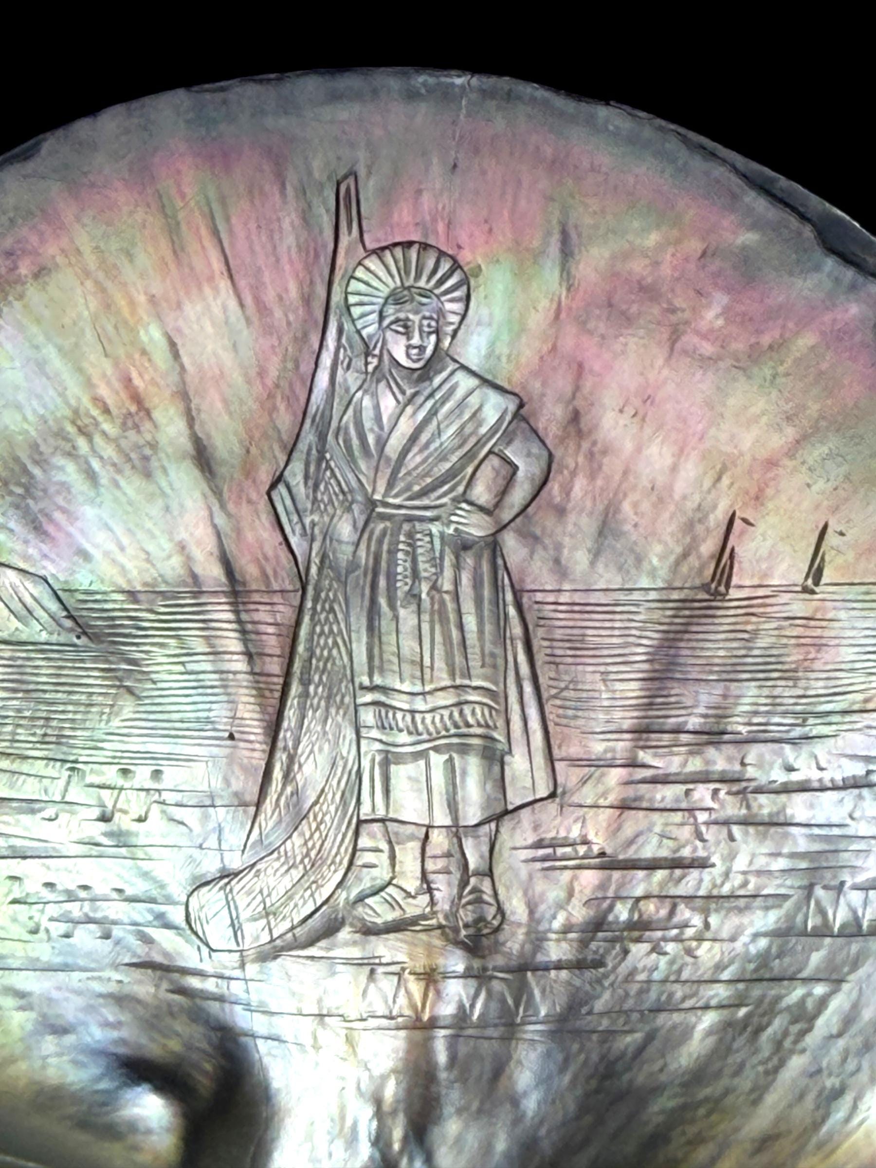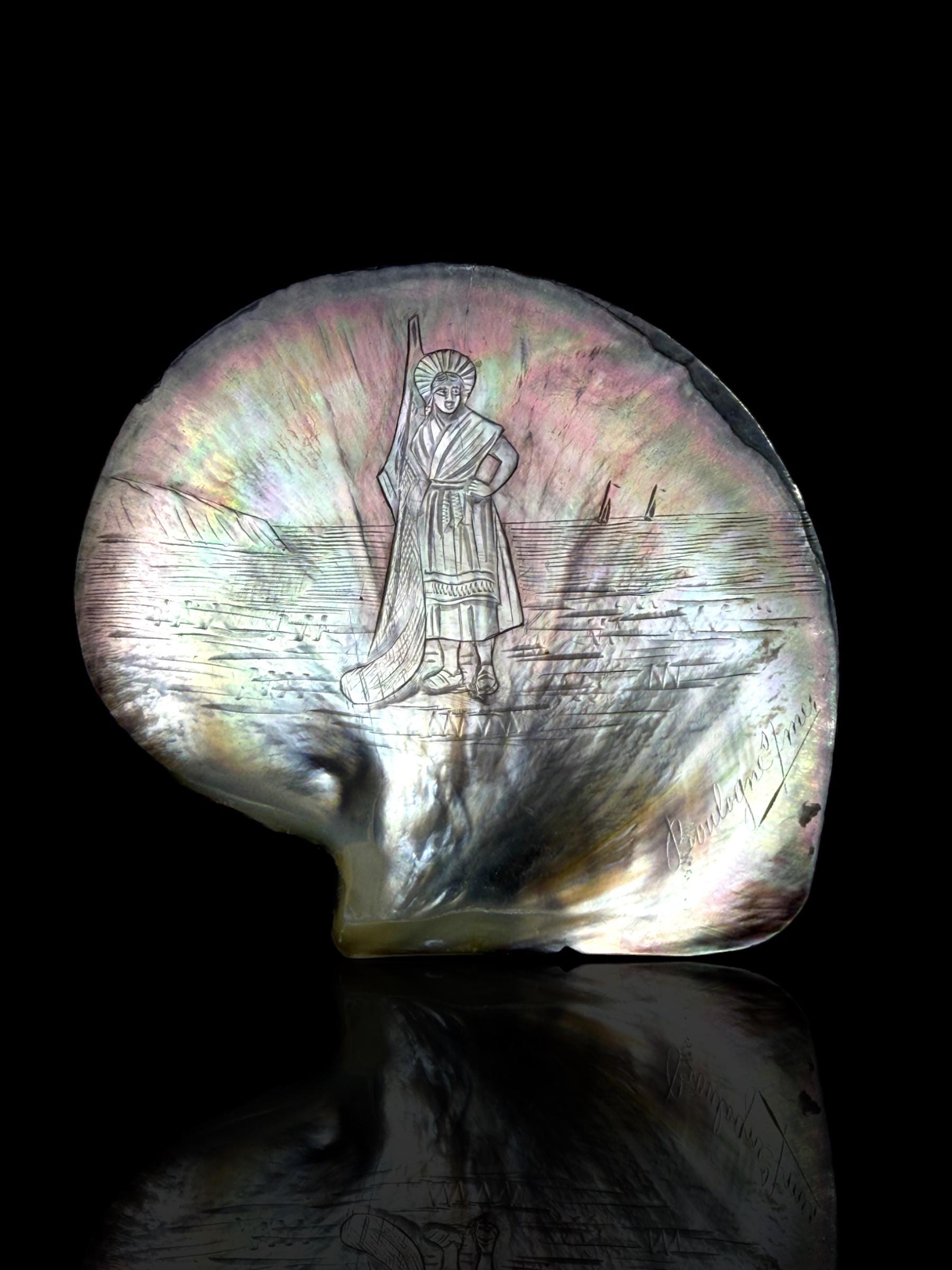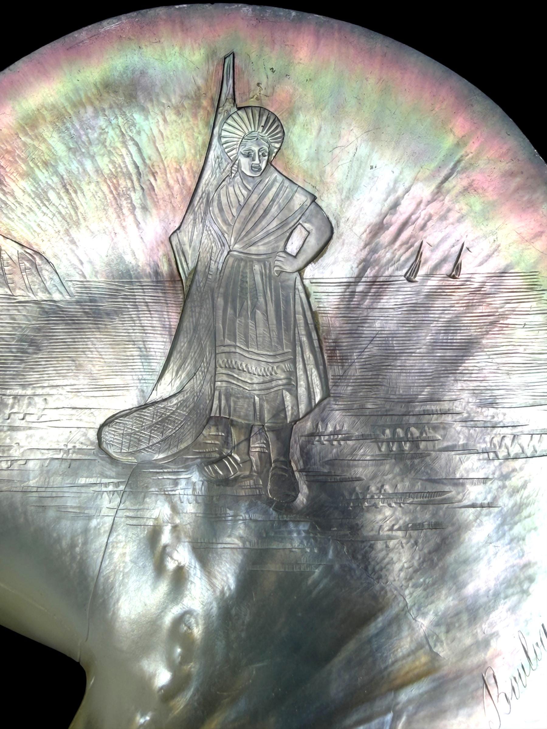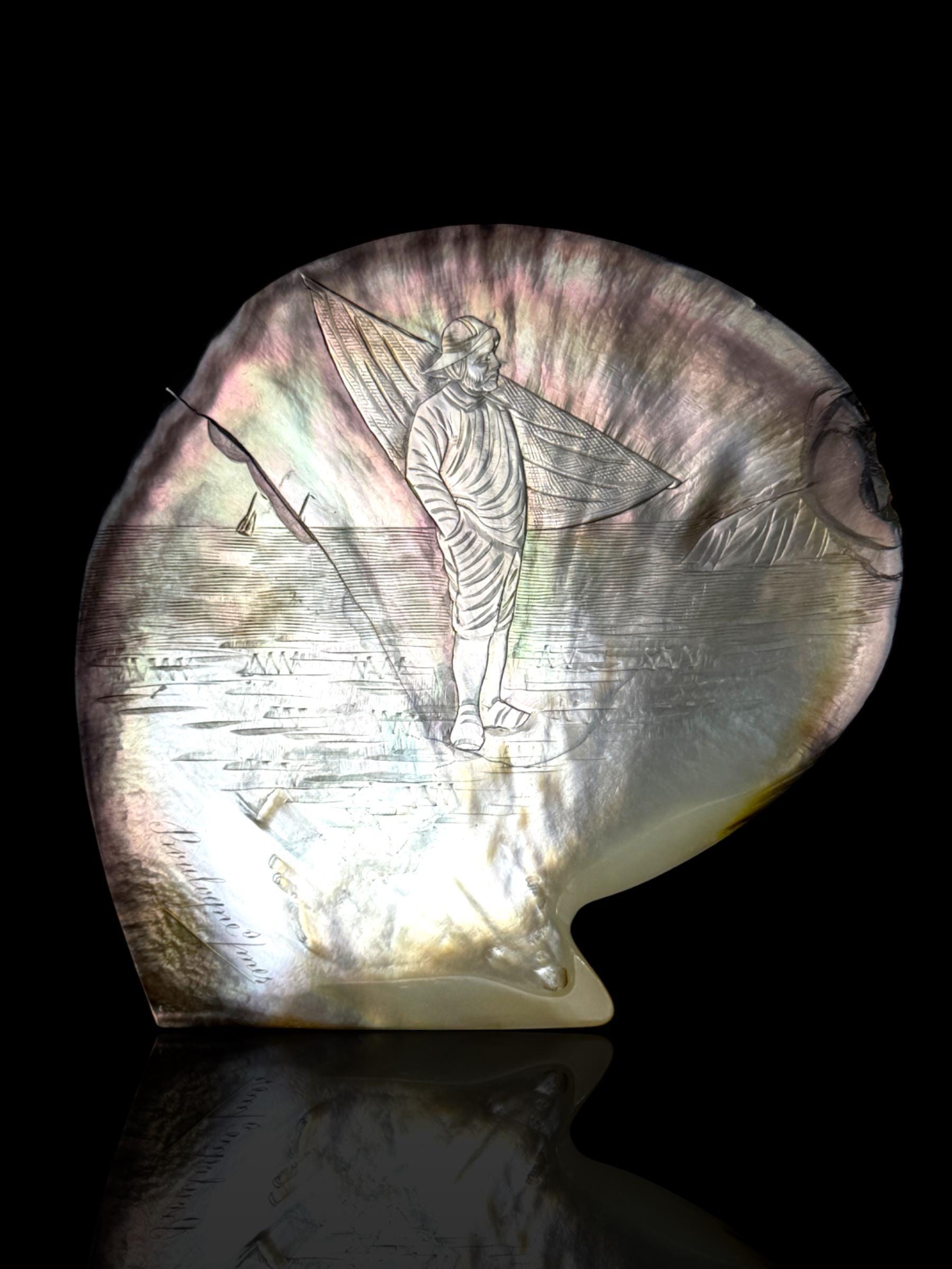 Hand carved from the Pinctada margaritifera or black lipped pearl oyster. It was carved in France and depicts a French Fisherman. Such carving were mainly produced in the coastal towns and sold to visiting tourists in the 19th century. They were made from pearl shell which were imported from their colonies in volume from the 1840s.