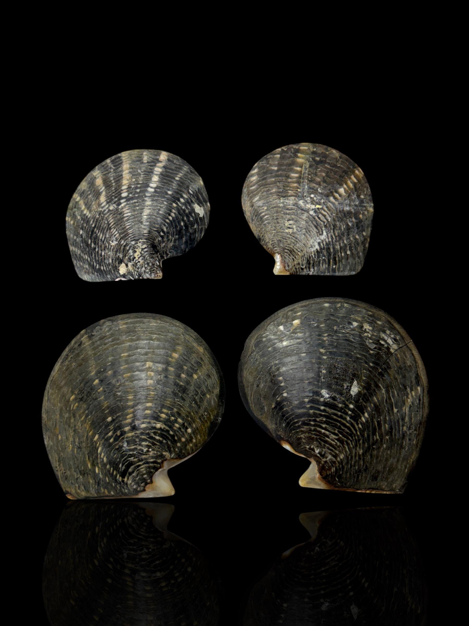 Two of the shell exhibit hairline cracks. One is deep and also has an edge which is broken (this piece is being added to the collection for free). All four shell appear to be structurally sound.