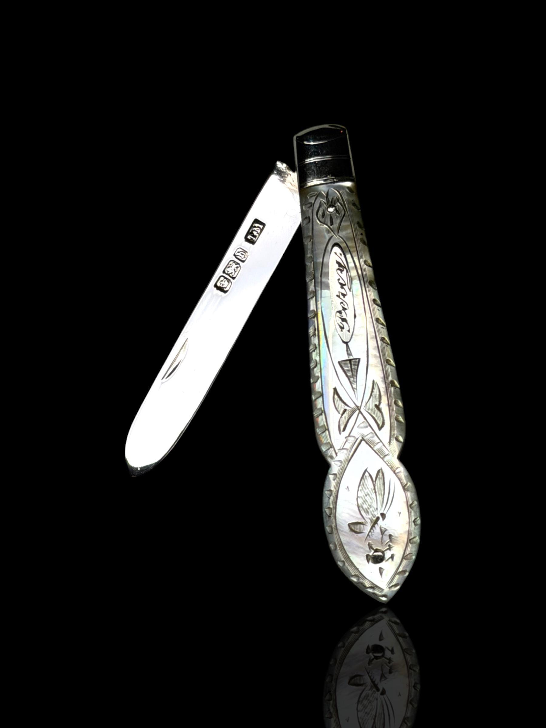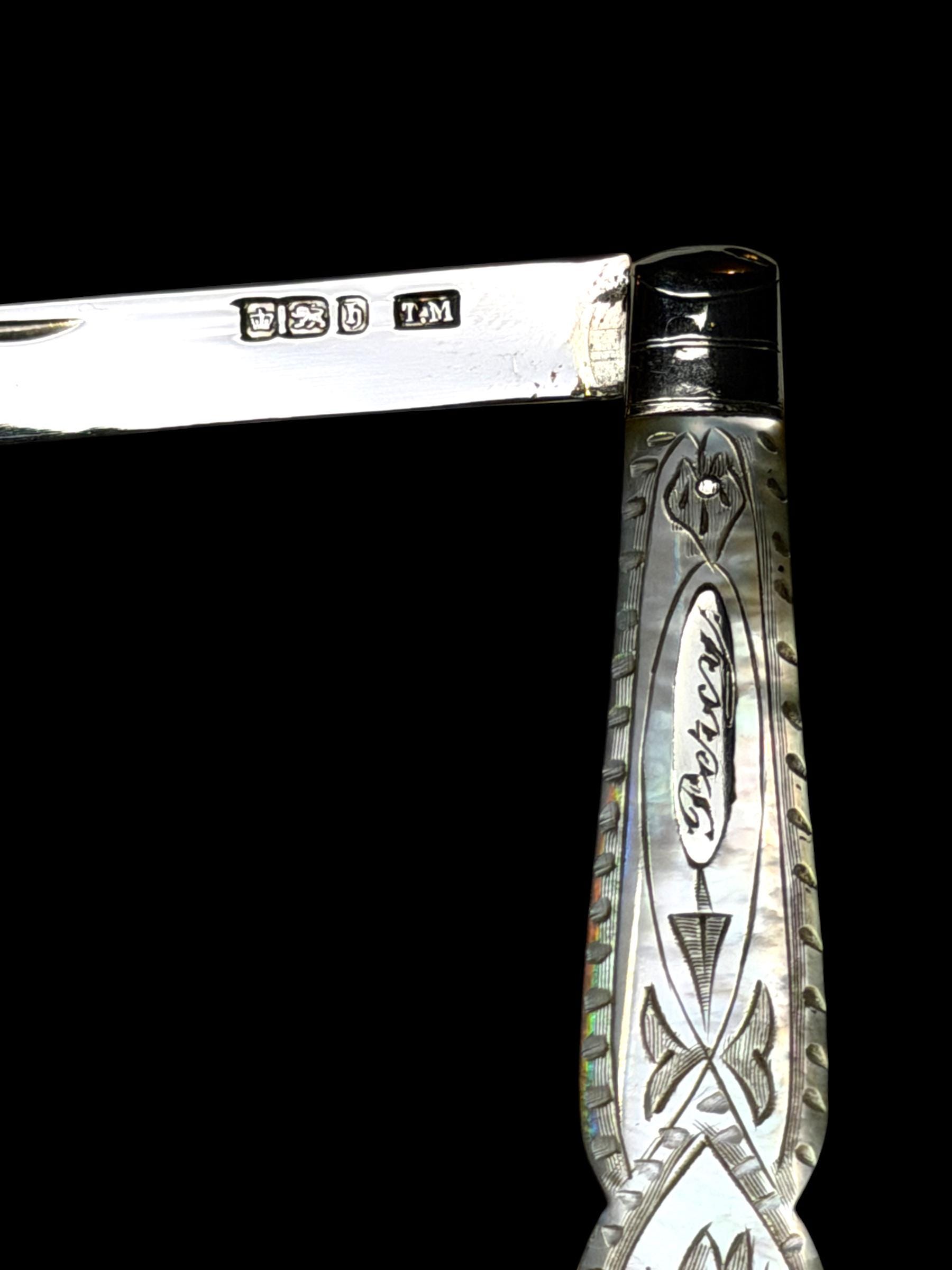 A fine piece. The hand-carved handle is high quality mother of pearl carved from Australian pearl shell which were exported to England from the 1800s.