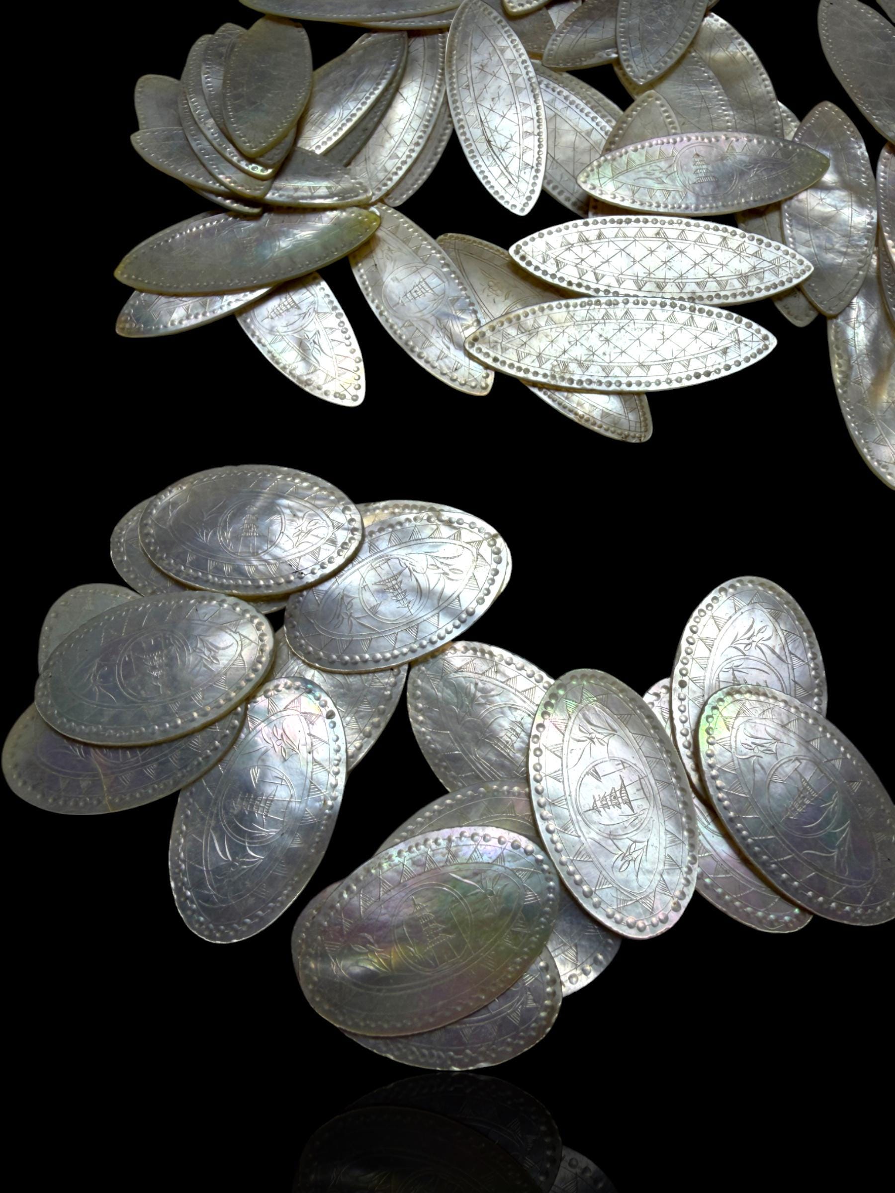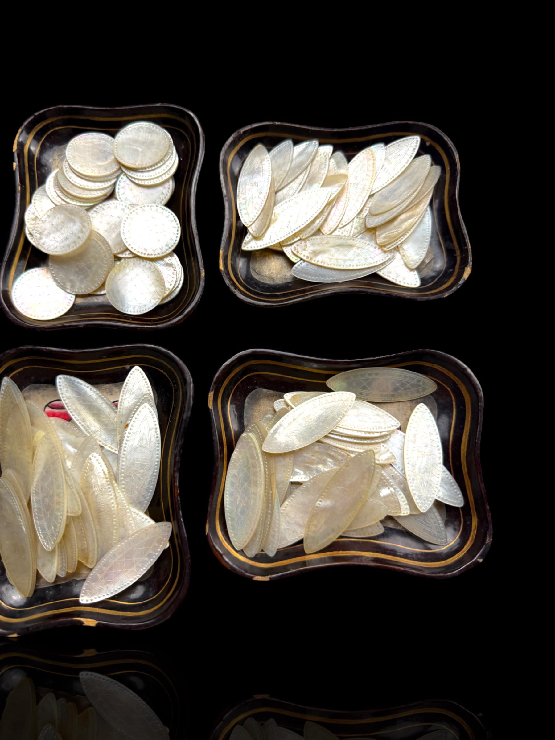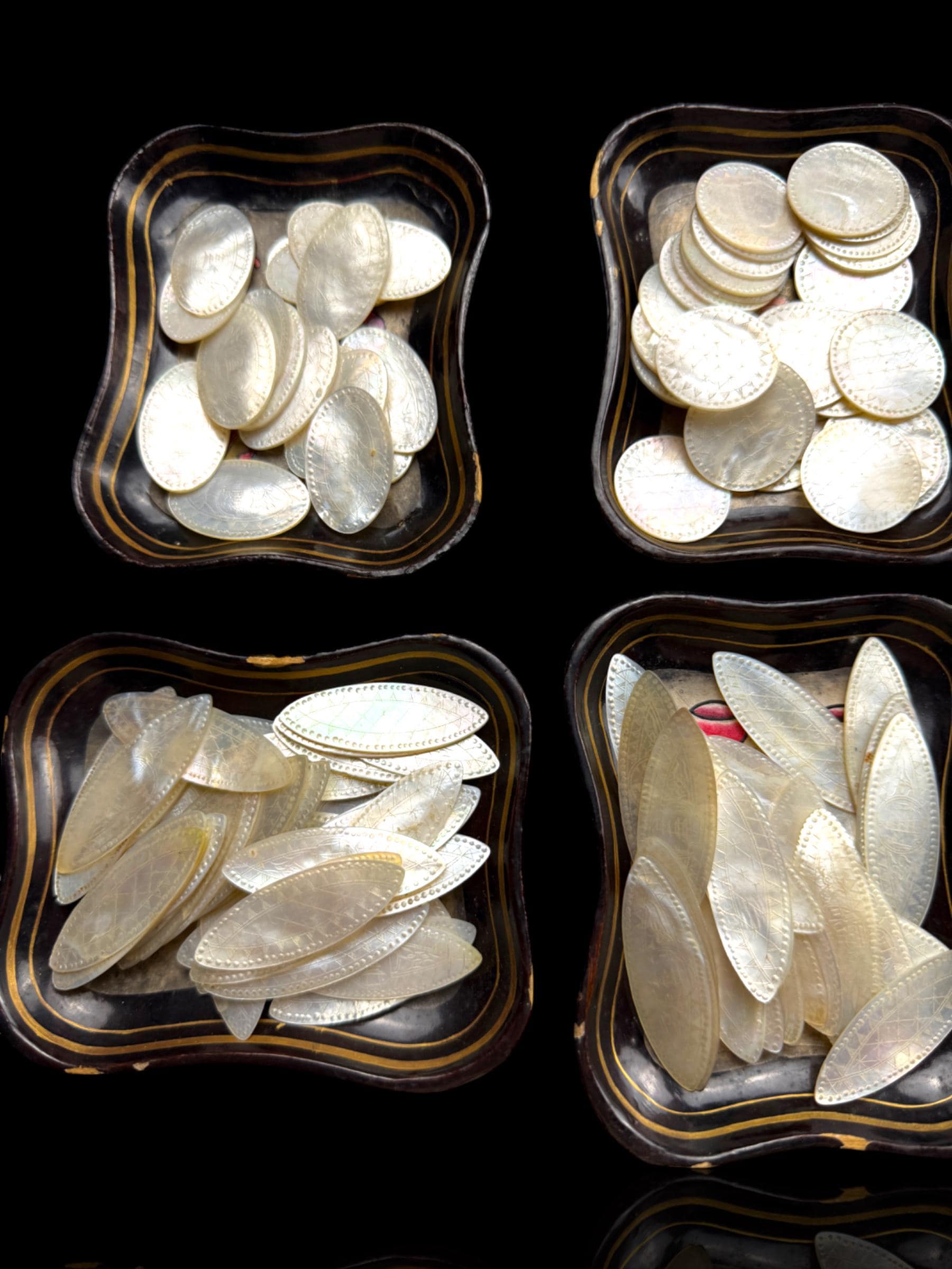 Highly sought after by collectors of antique gaming pieces, decorative arts, and mother-of-pearl objects. These counters capture the elegance of Regency and Victorian leisure culture.