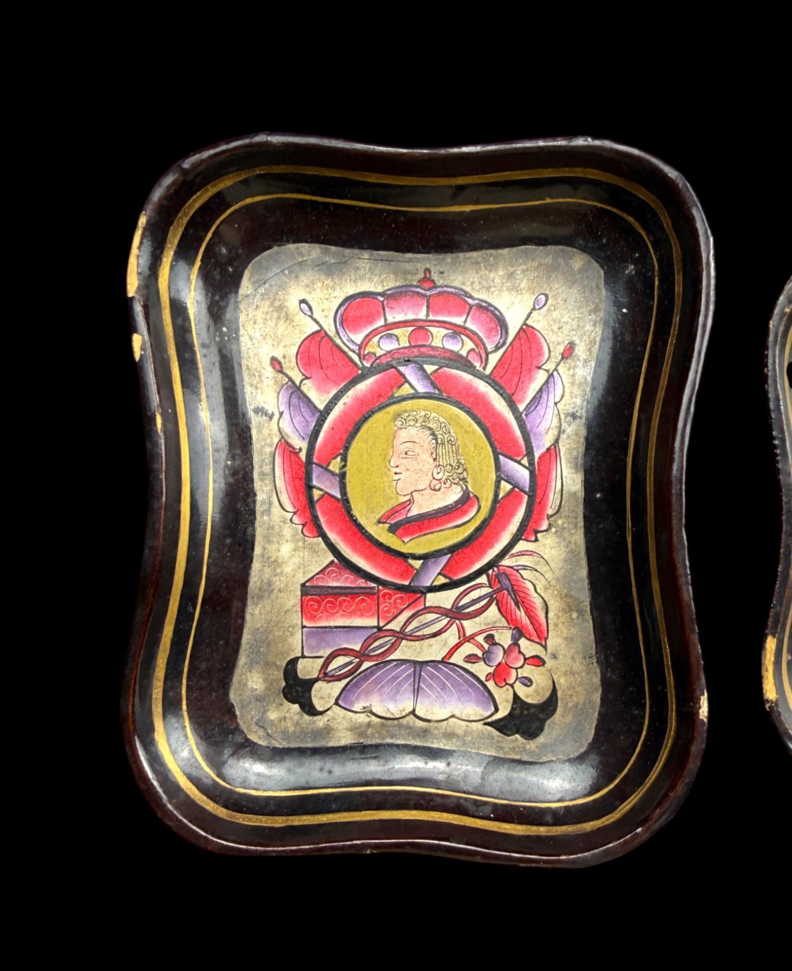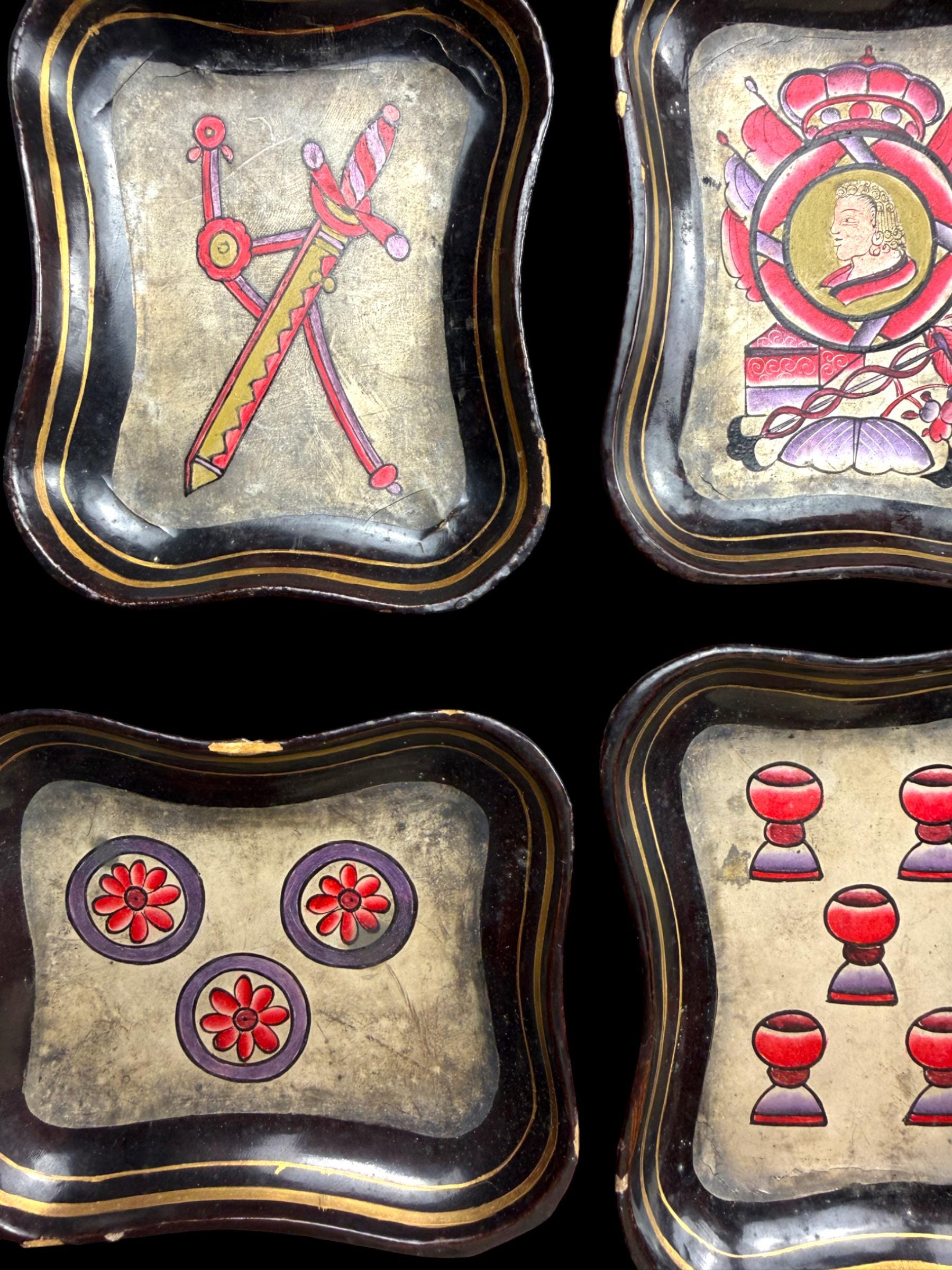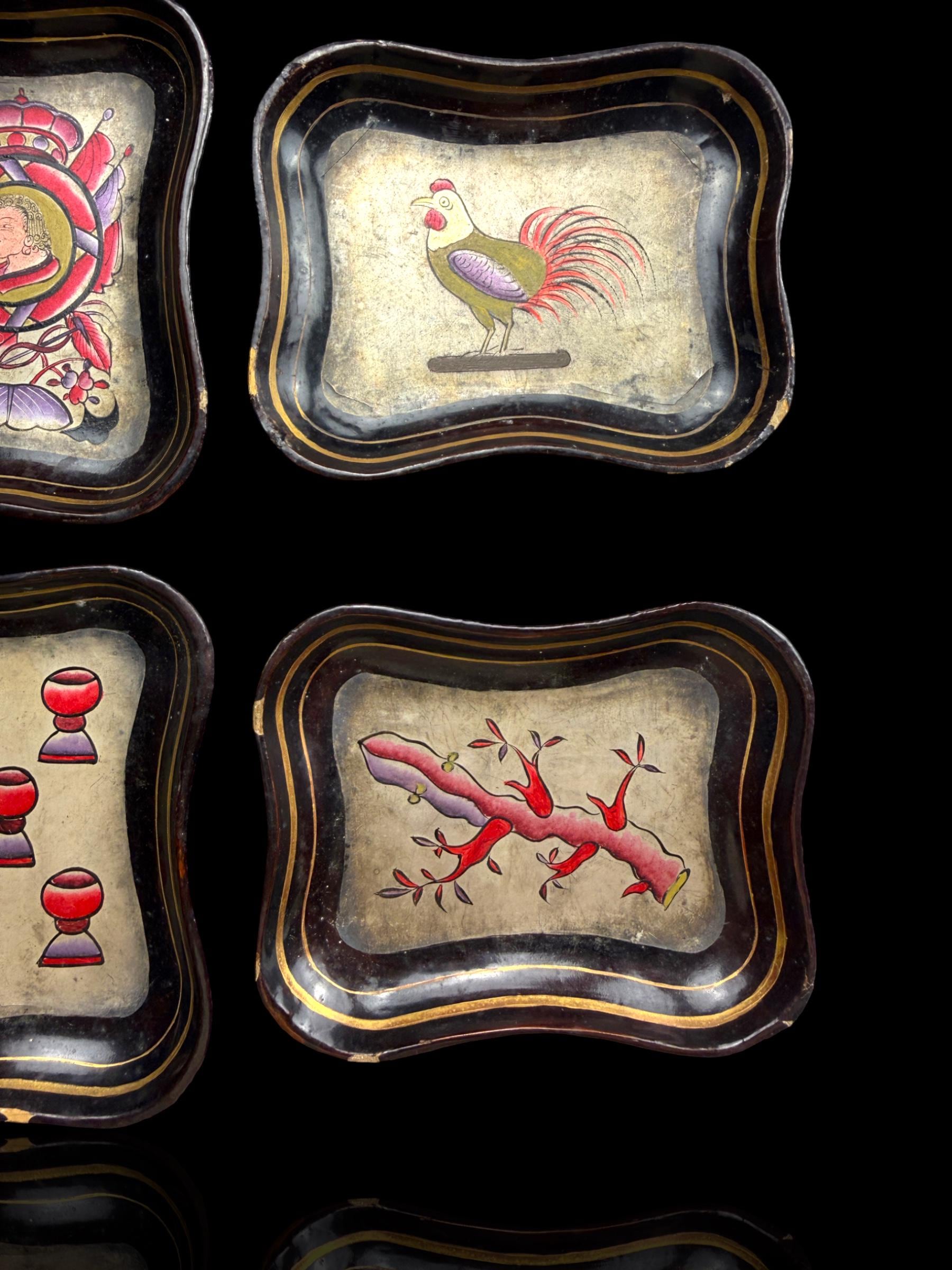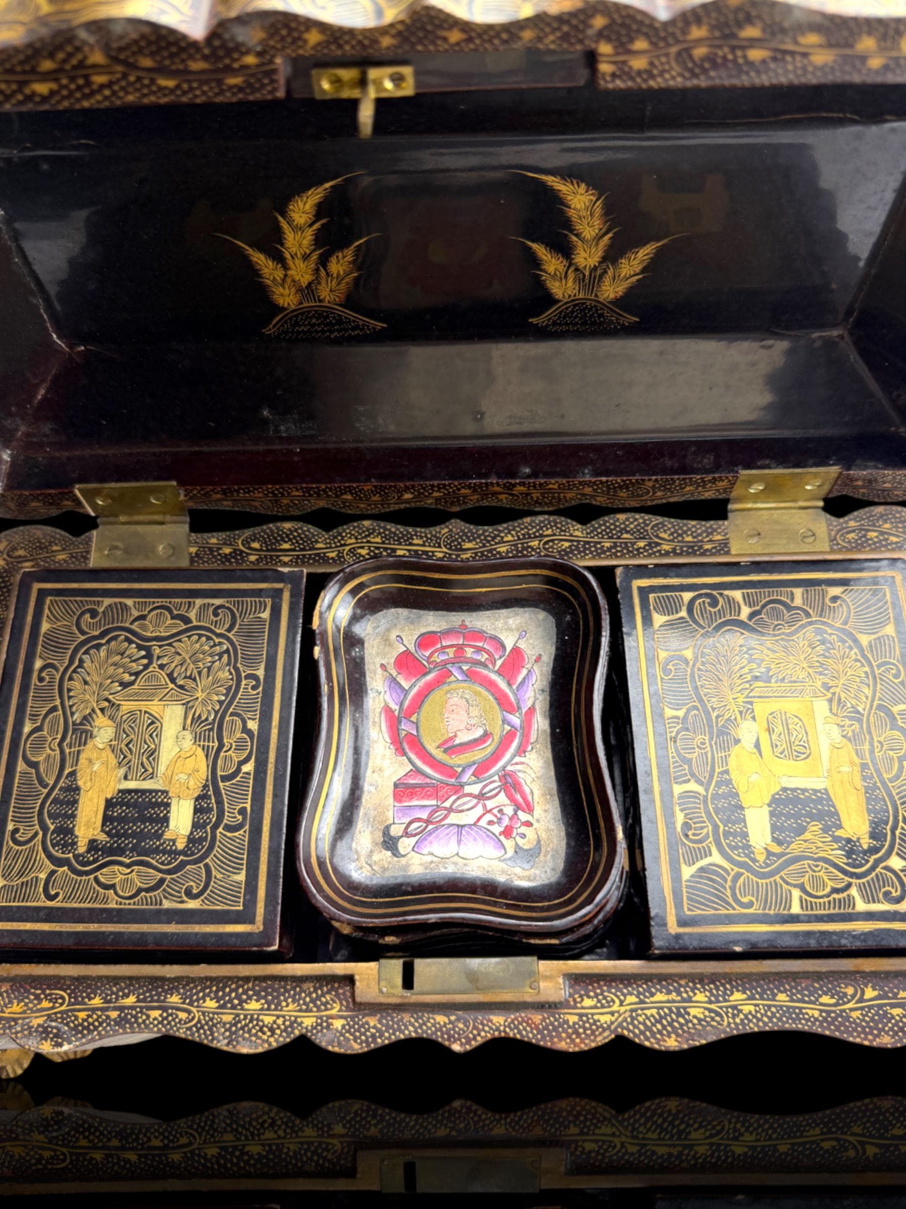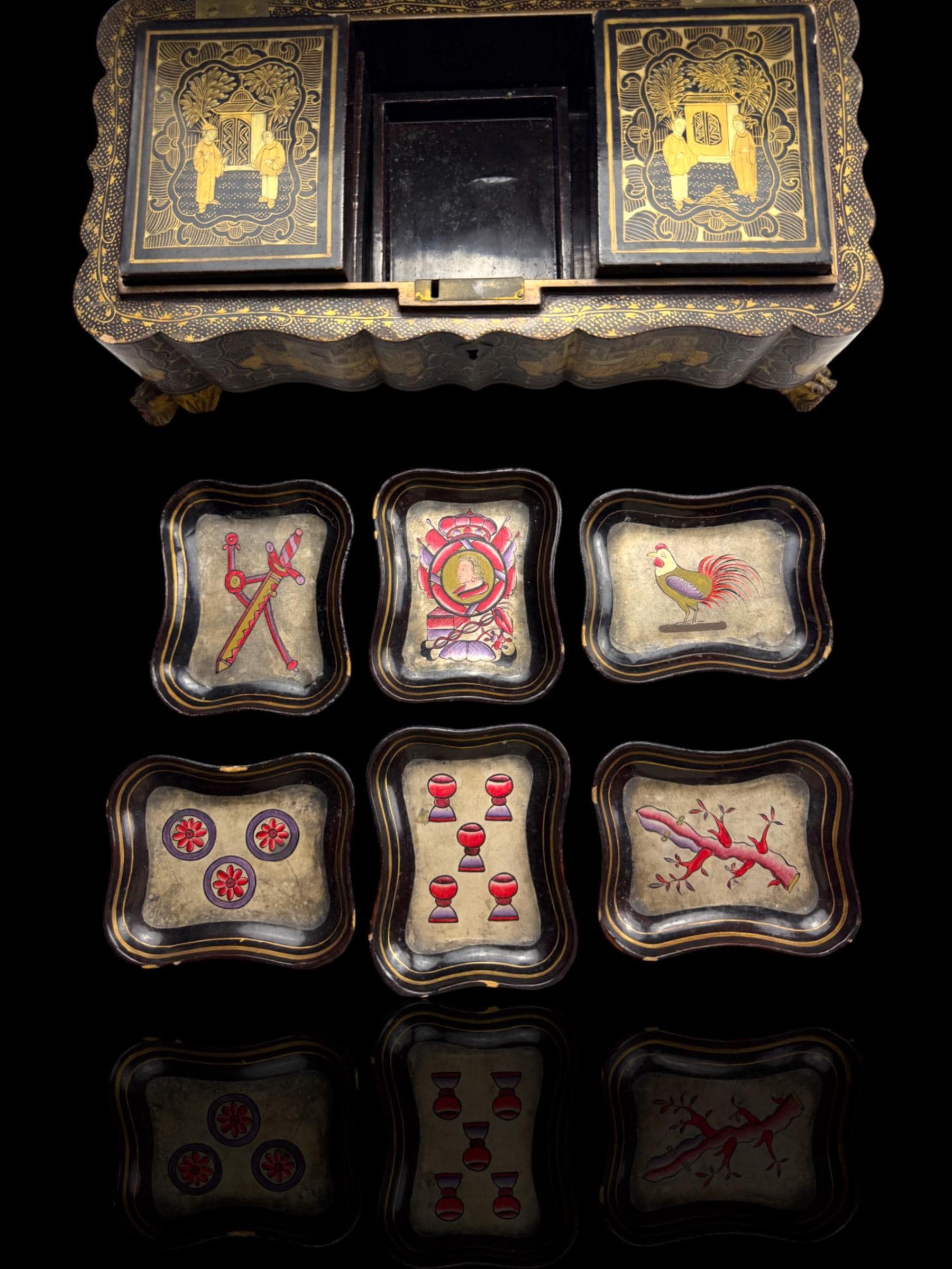 When opened, the interior reveals a set of matching lacquer gaming trays, each adorned with vibrant painted symbols, figures, and motifs. These trays were traditionally used for card games, counters, or other parlour amusements—making this piece not only decorative but also historically functional. The interior lid features elegant gilt sheaves.