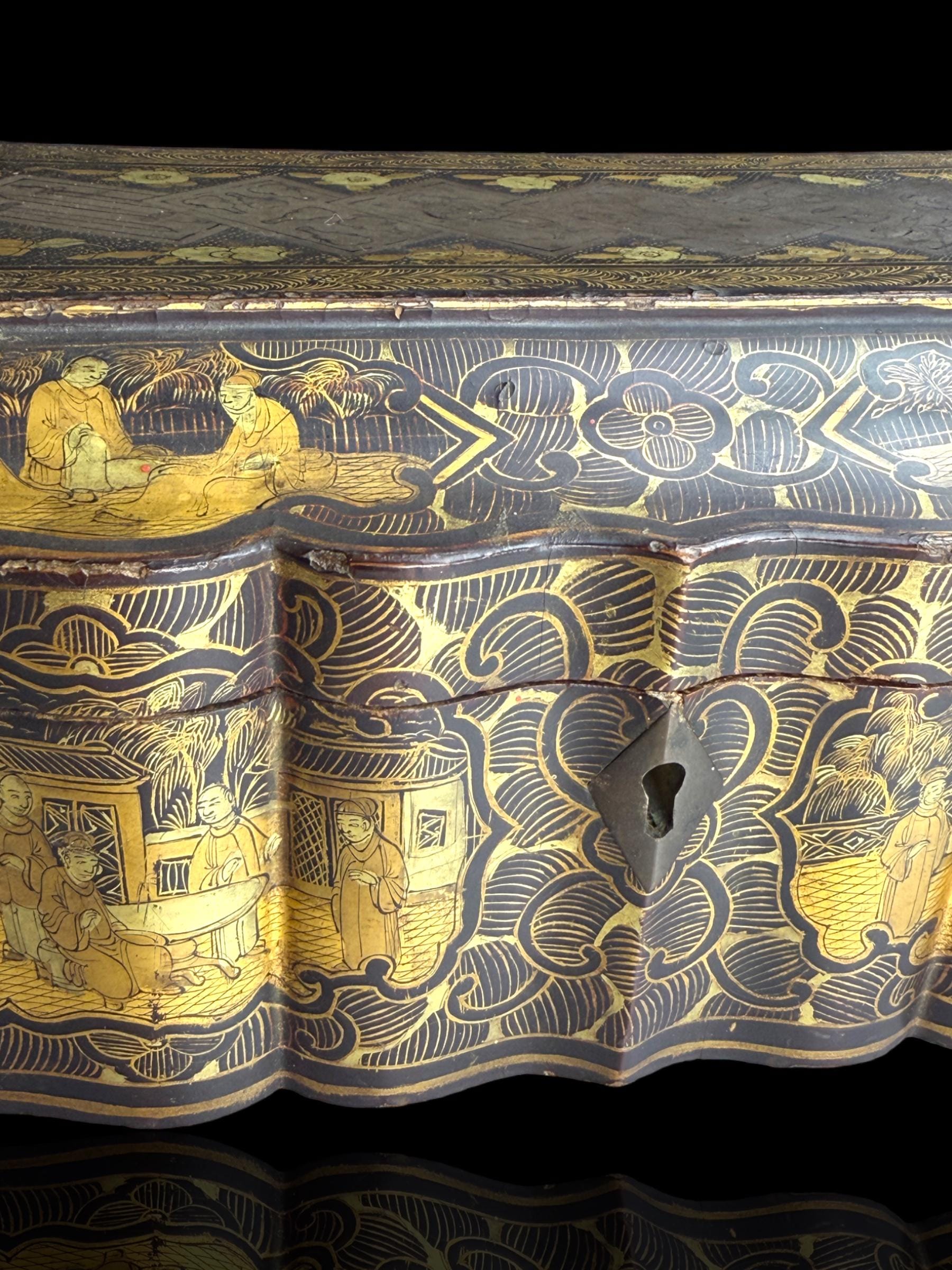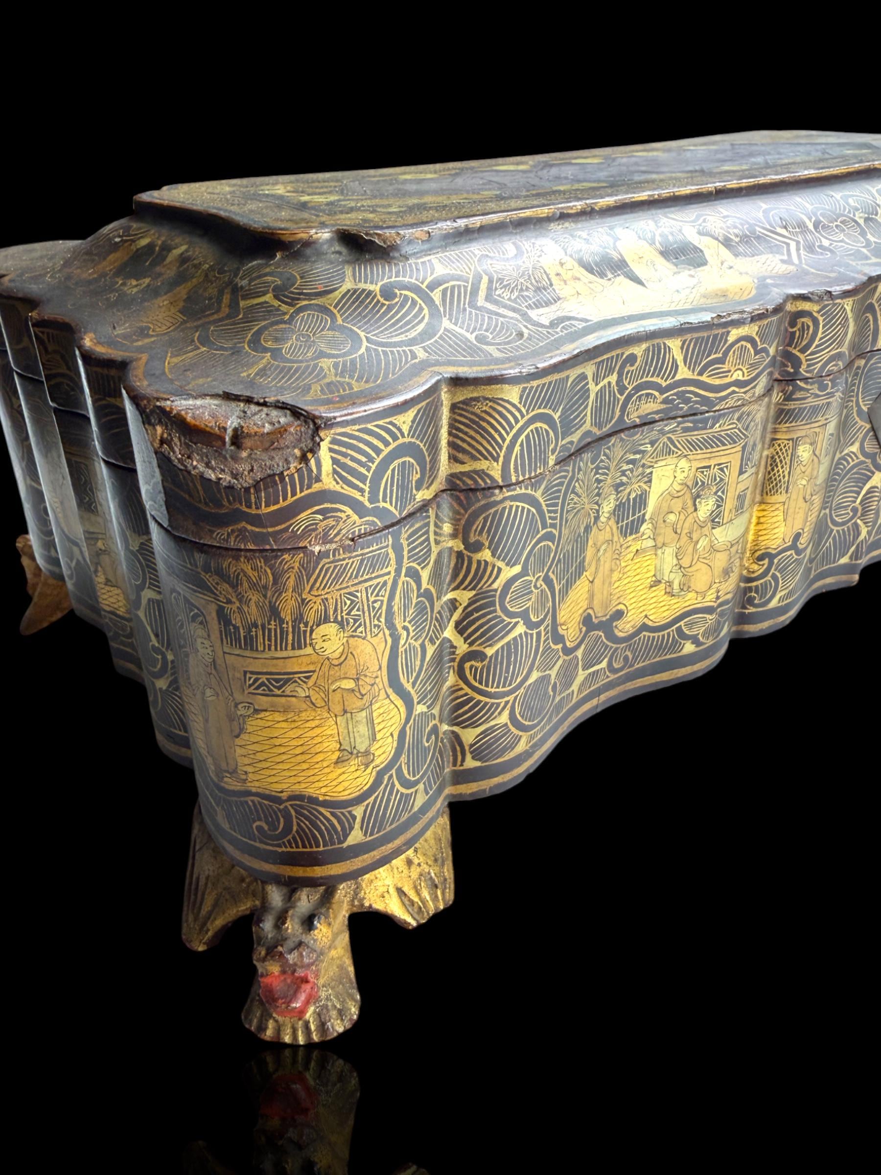 Crafted in the fashionable Chinoiserie style that swept through Europe in the 18th and 19th centuries, the box features hand-painted gilt scenes of figures in garden landscapes, delicately framed by swirling cloud motifs and floral borders. Its scalloped form, raised on carved and painted feet, gives it a striking silhouette from every angle.