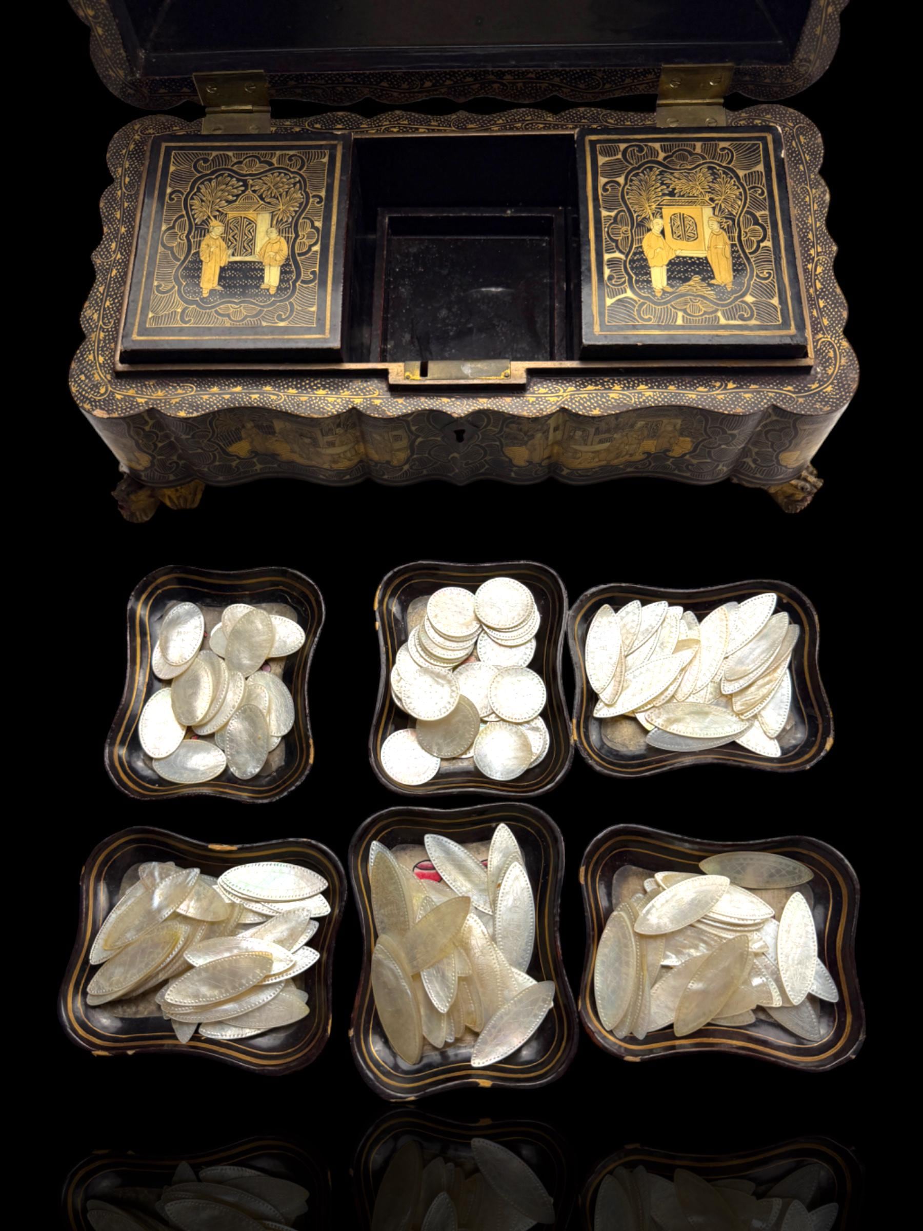 The box is combined with a rare large matched set of mother of pearl gaming counters. Each piece hand-carved. The largest piece just over 4cm in width. Given that such sets were made approximately 200 years ago, it is rare to find them with so many matched pieces.