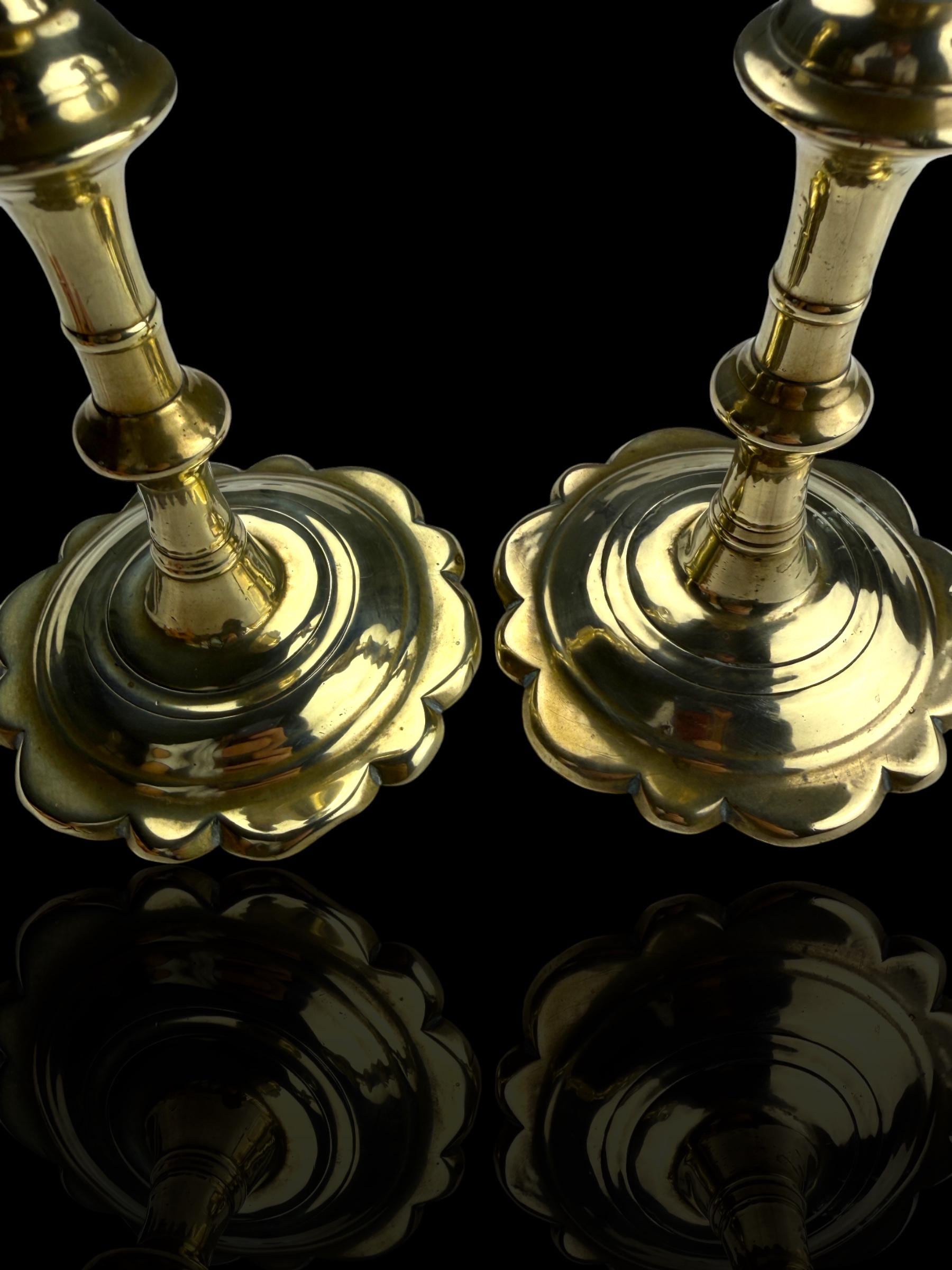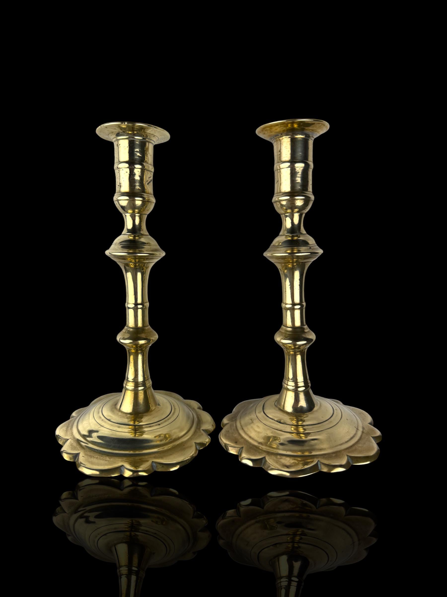 A very fine pair of George II brass candlestick holders, dating to around c.1740. These are authentic antique pieces; not reproductions that are often seen in the marketplace.