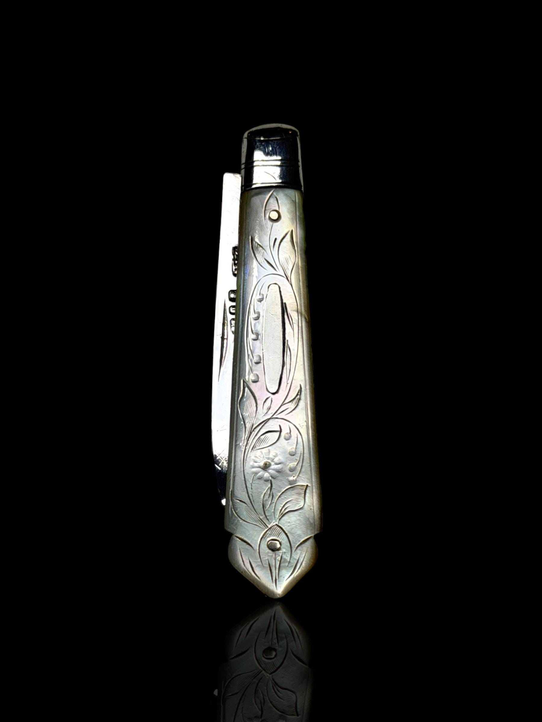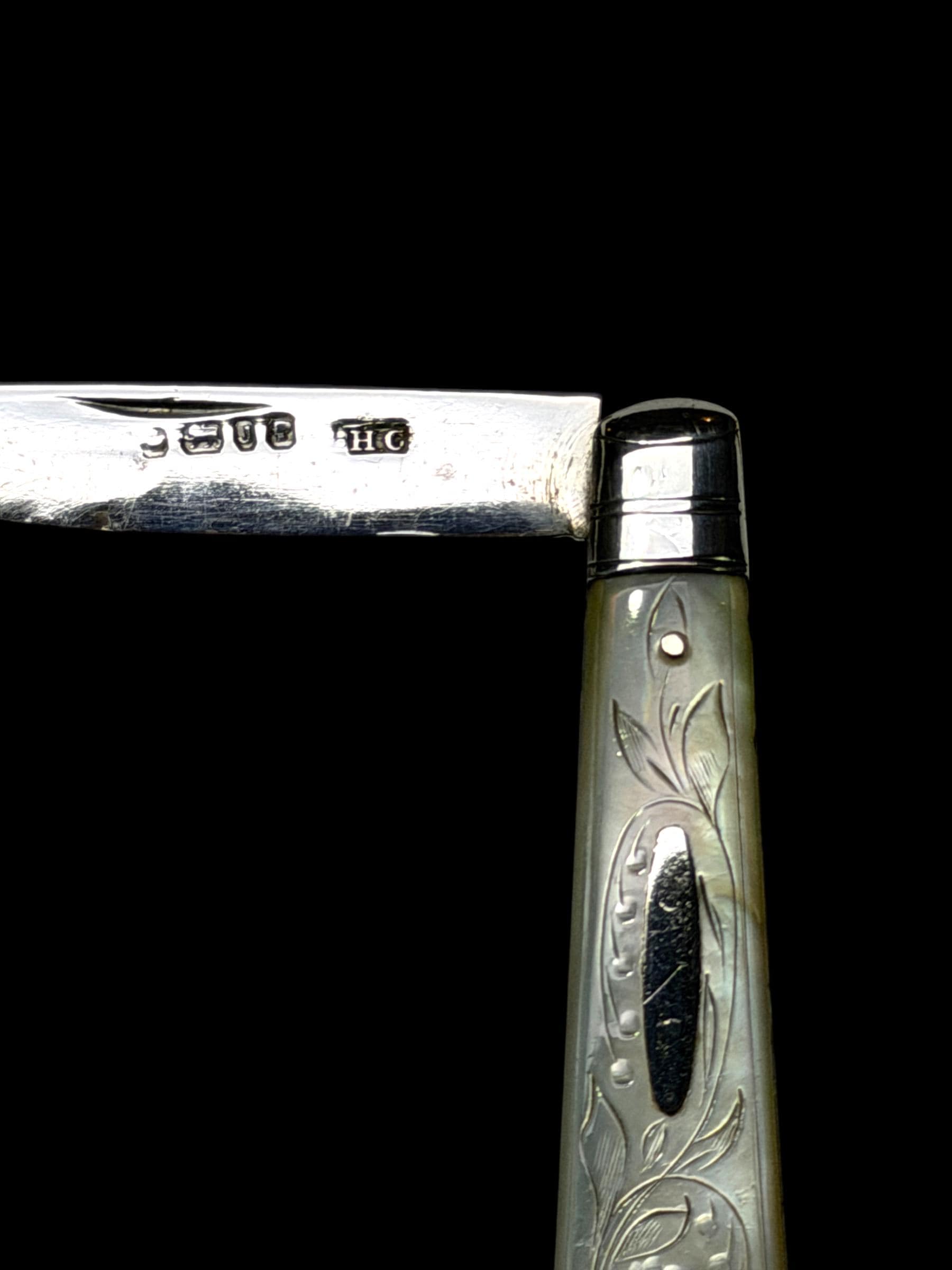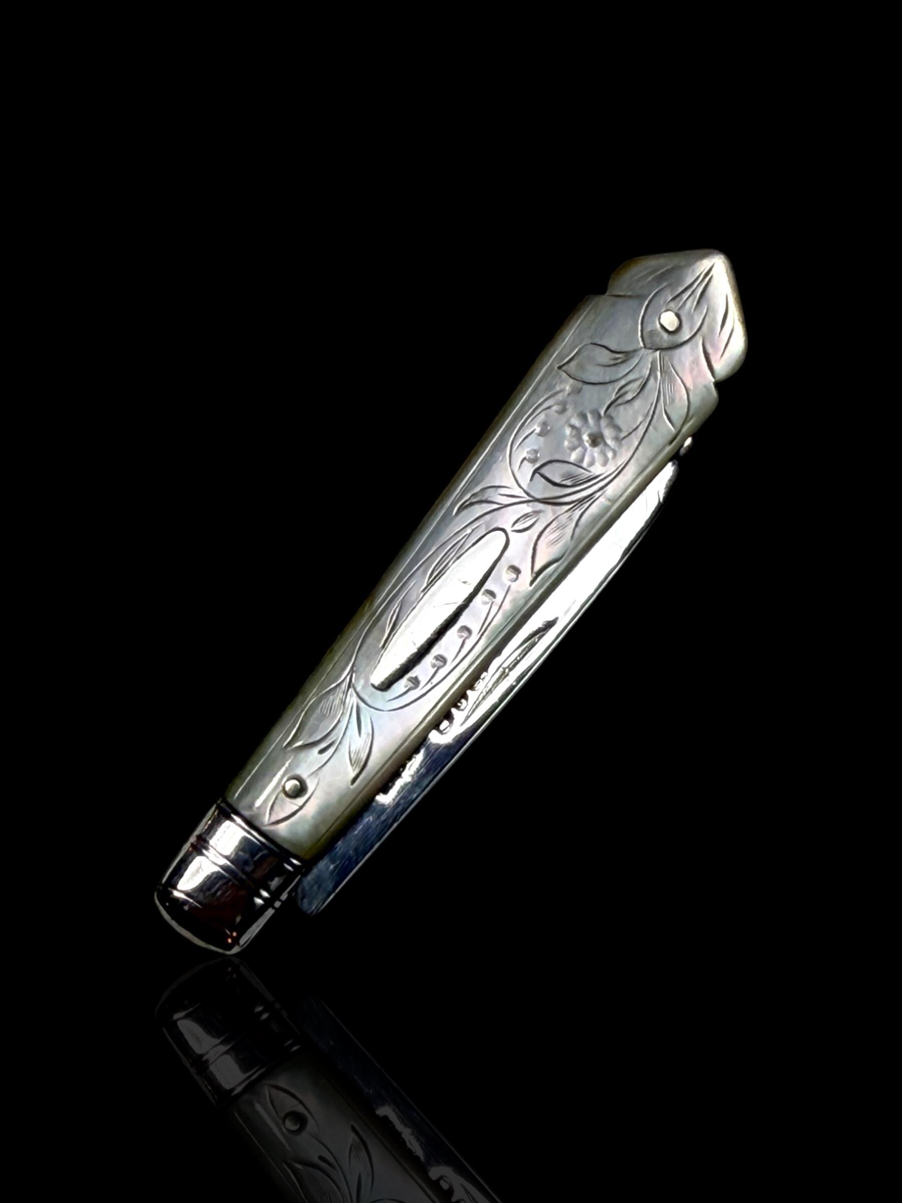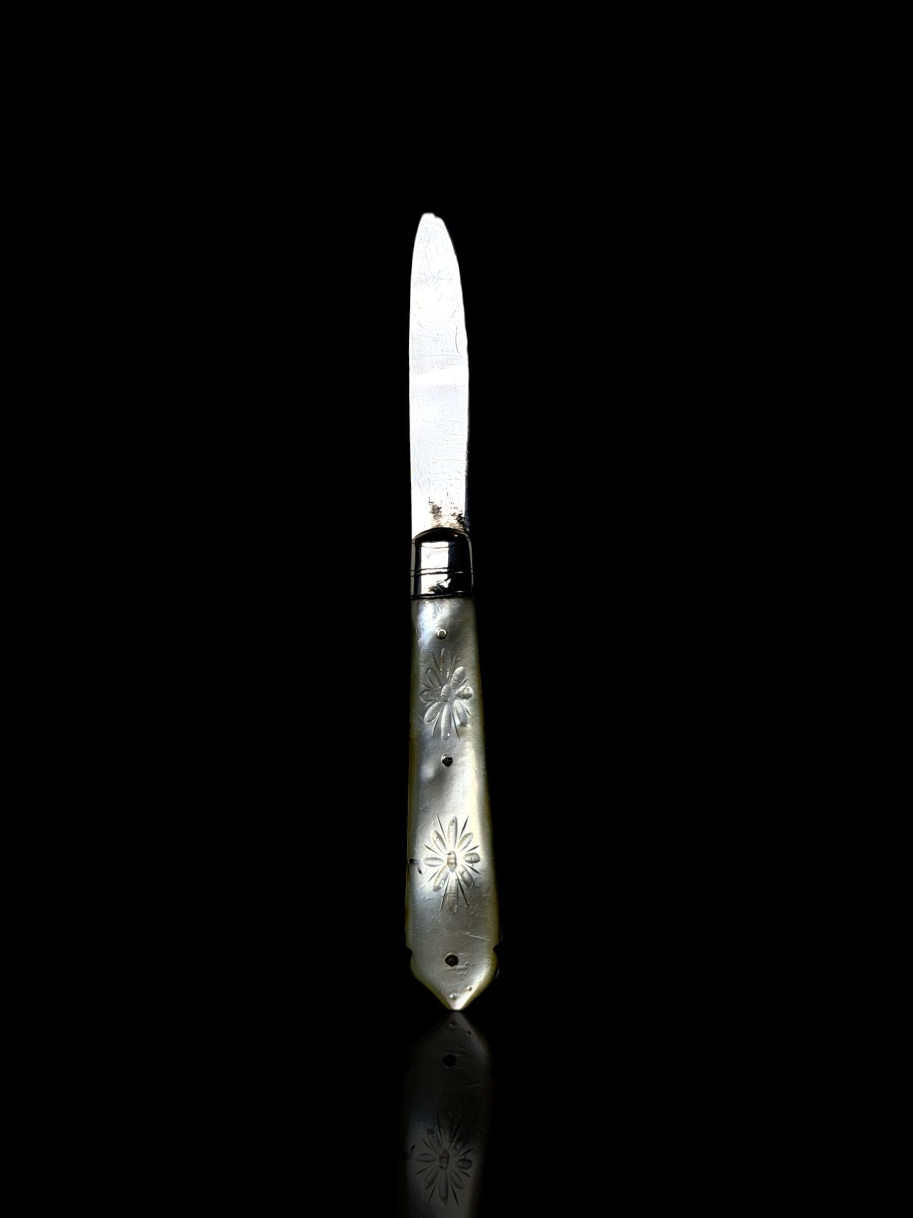 An elagantly designed and well crafted pocket knife. The hand-carved handle is high quality mother of pearl which almost certainly would have been carved from Australian pearl shell which were exported to England from the 1800s.