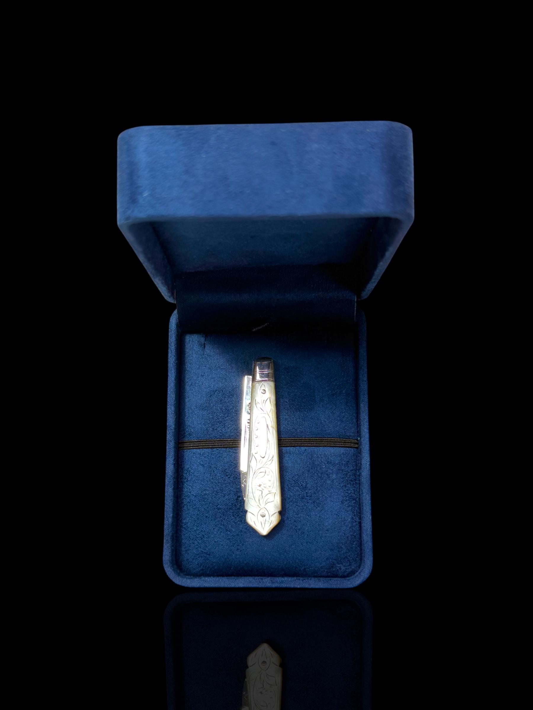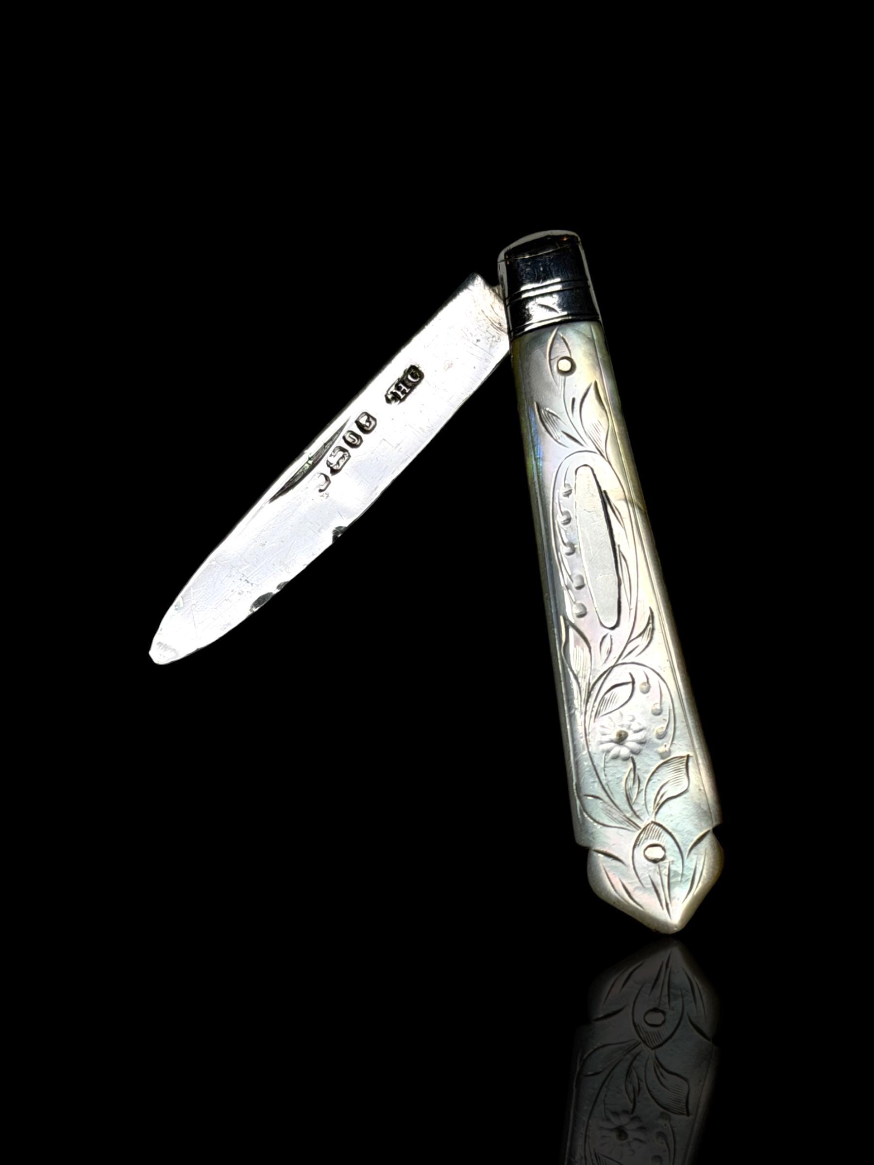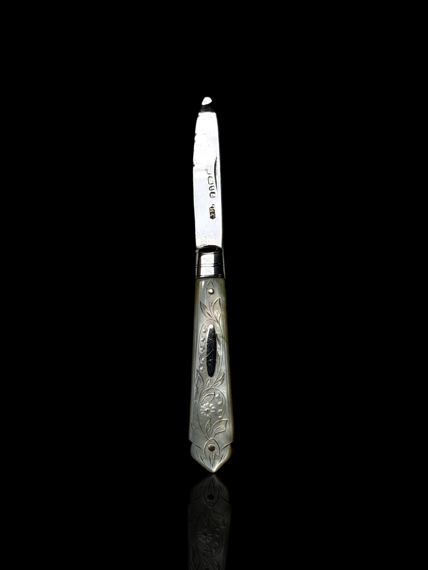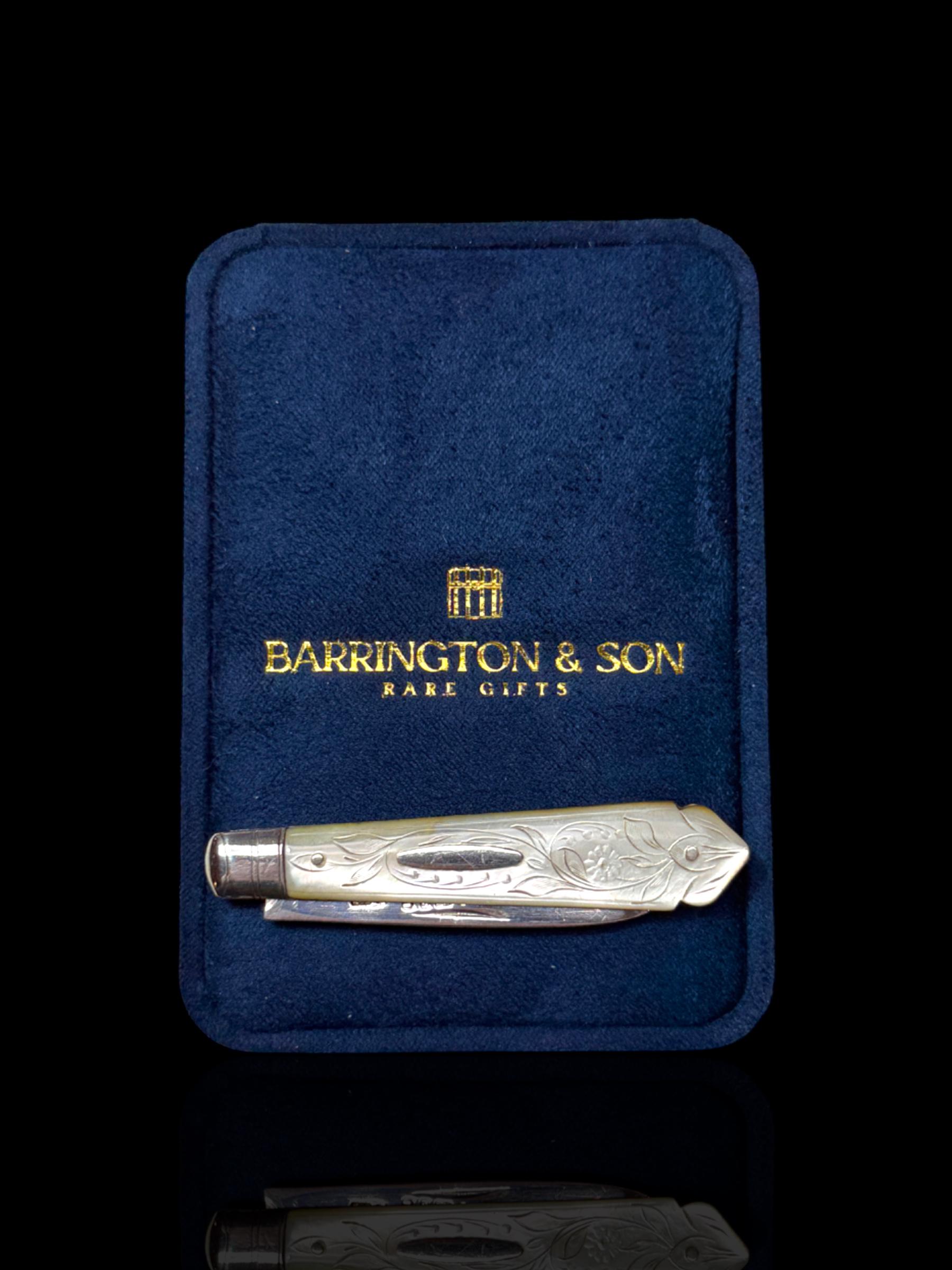 An elagantly designed and well crafted pocket knife. The hand-carved handle is high quality mother of pearl which almost certainly would have been carved from Australian pearl shell which were exported to England from the 1800s.