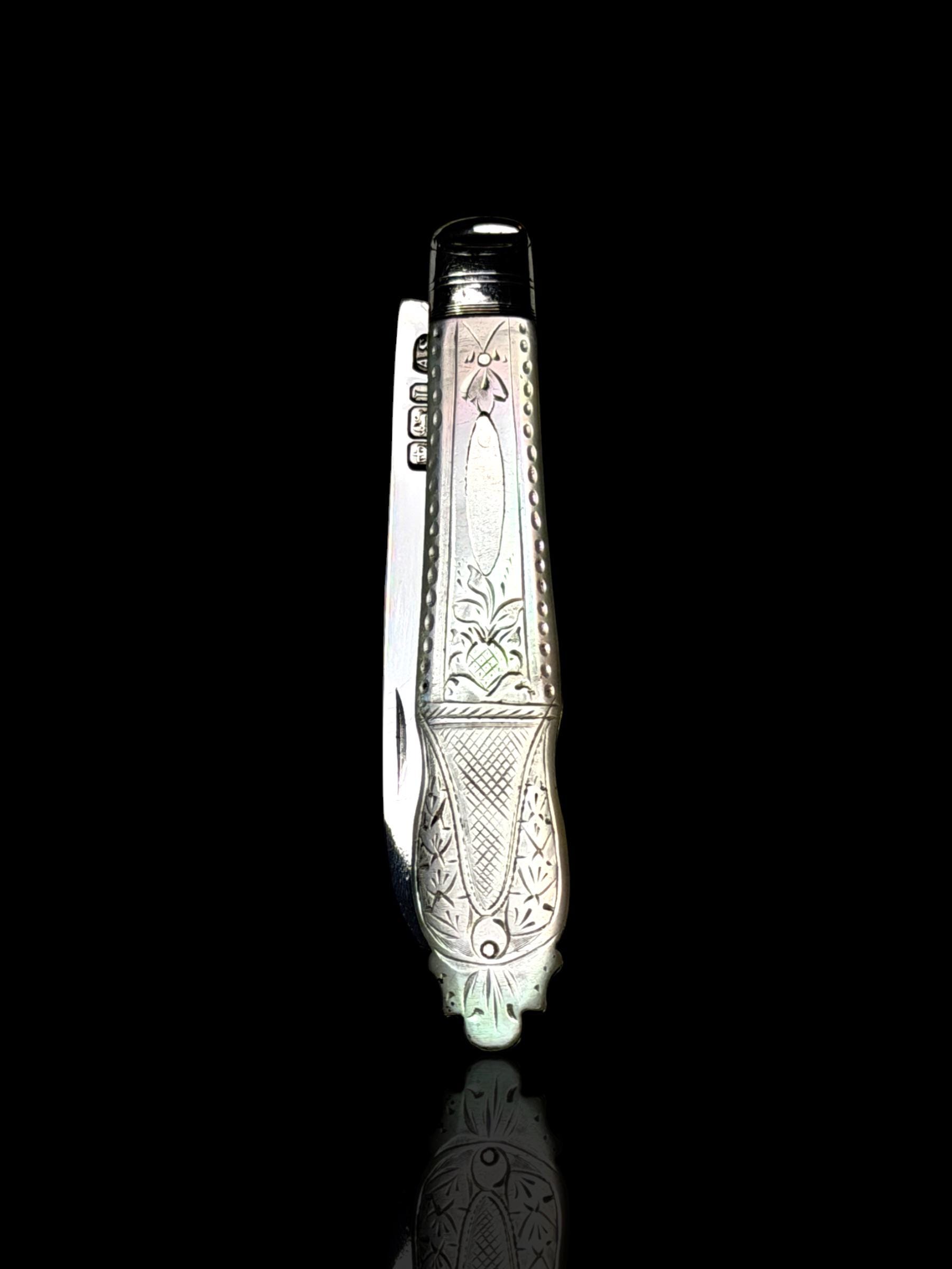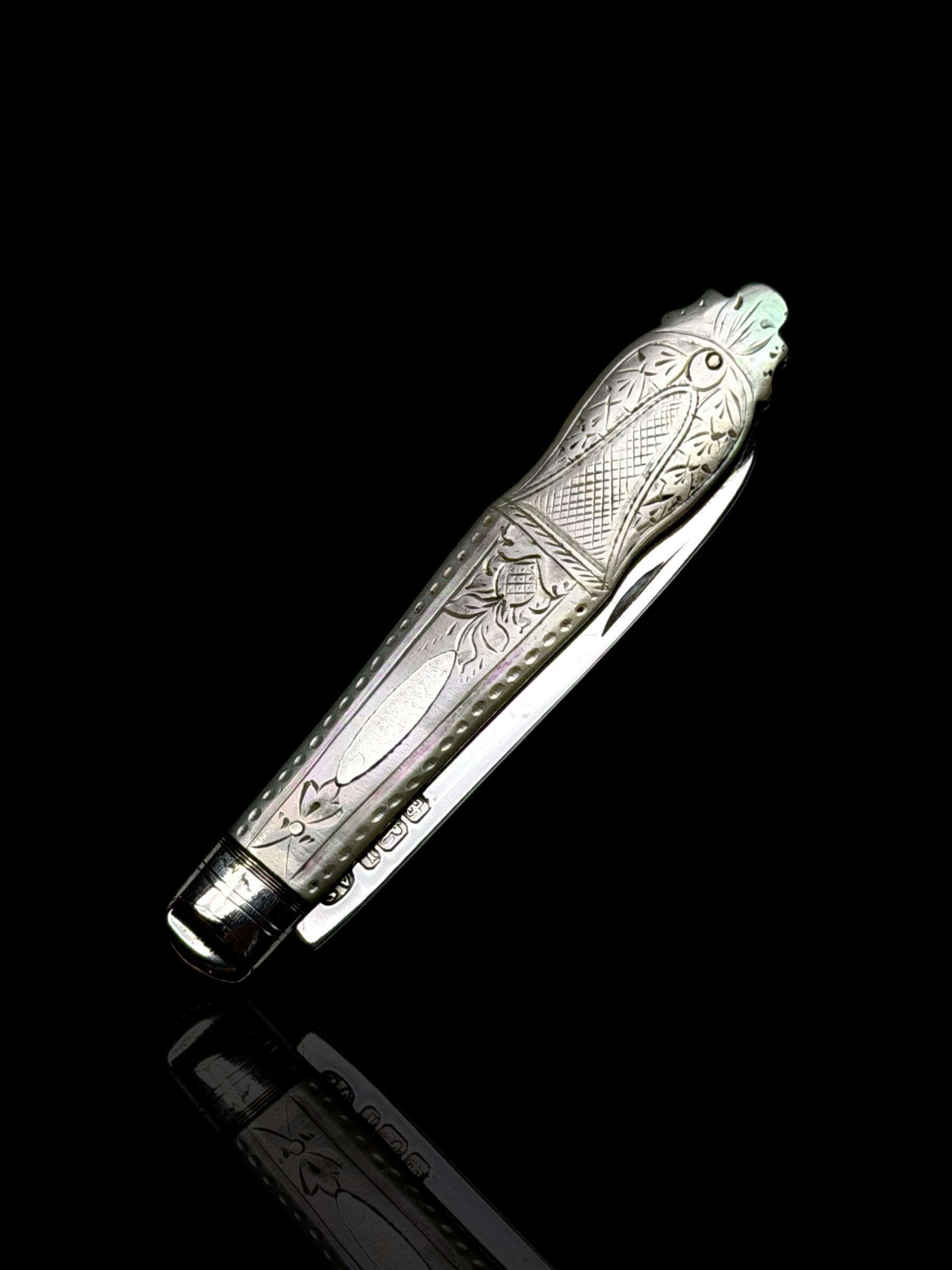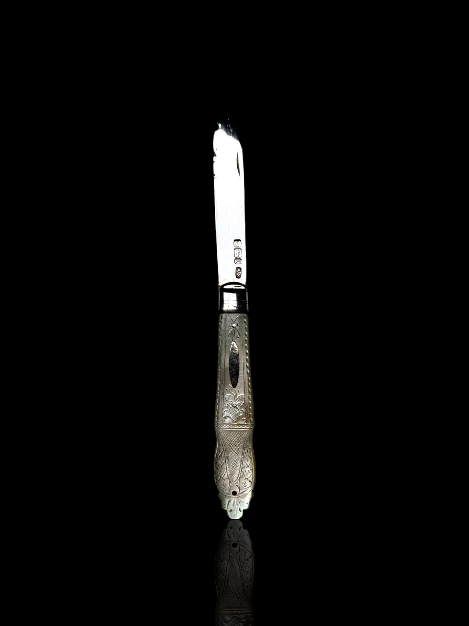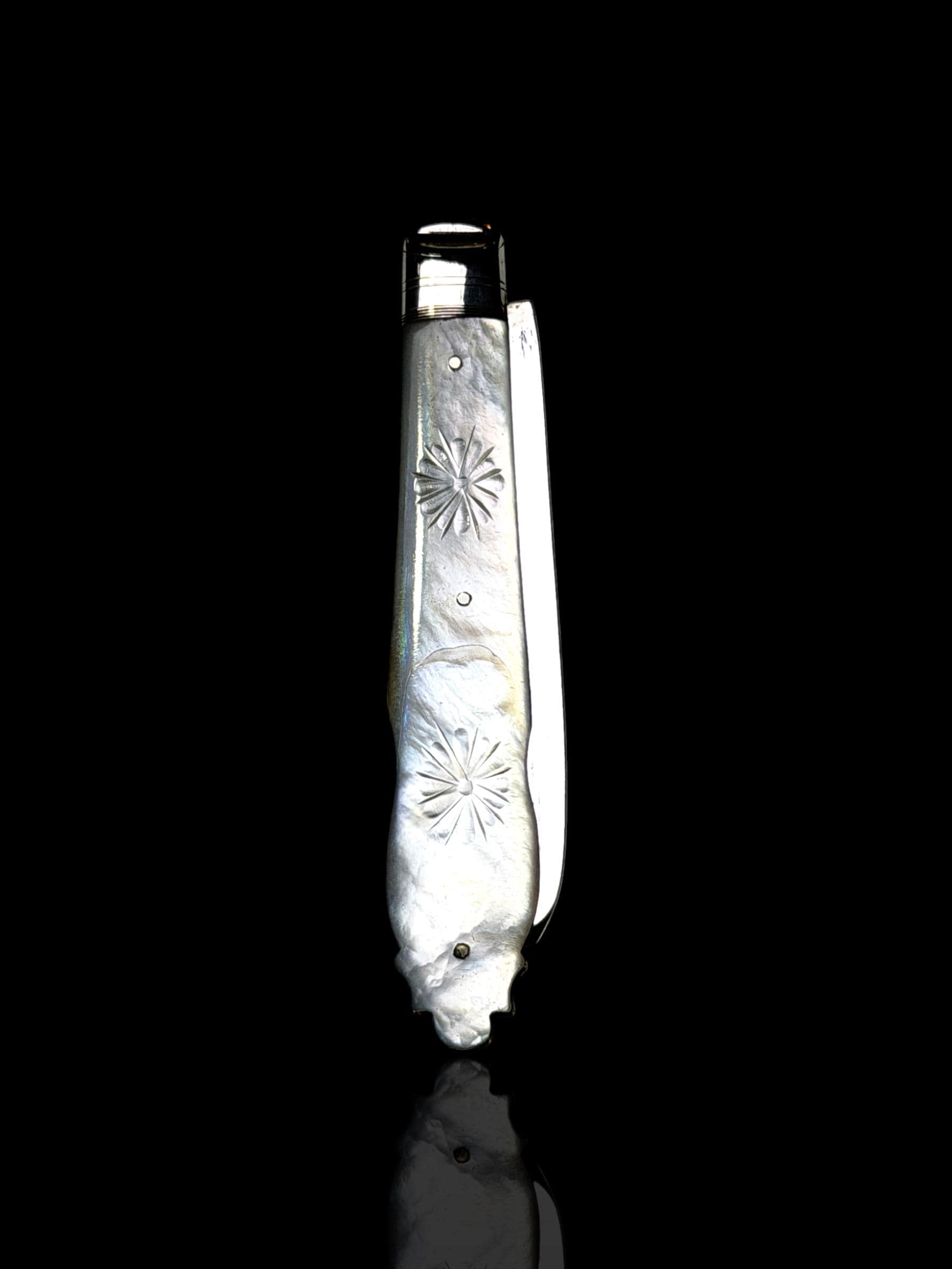 A beautifully designed and executed knife by Arthur Worral Staniforth. The elegant profile and fine engraving on the mother of pearl handle is the standout feature of the knife.