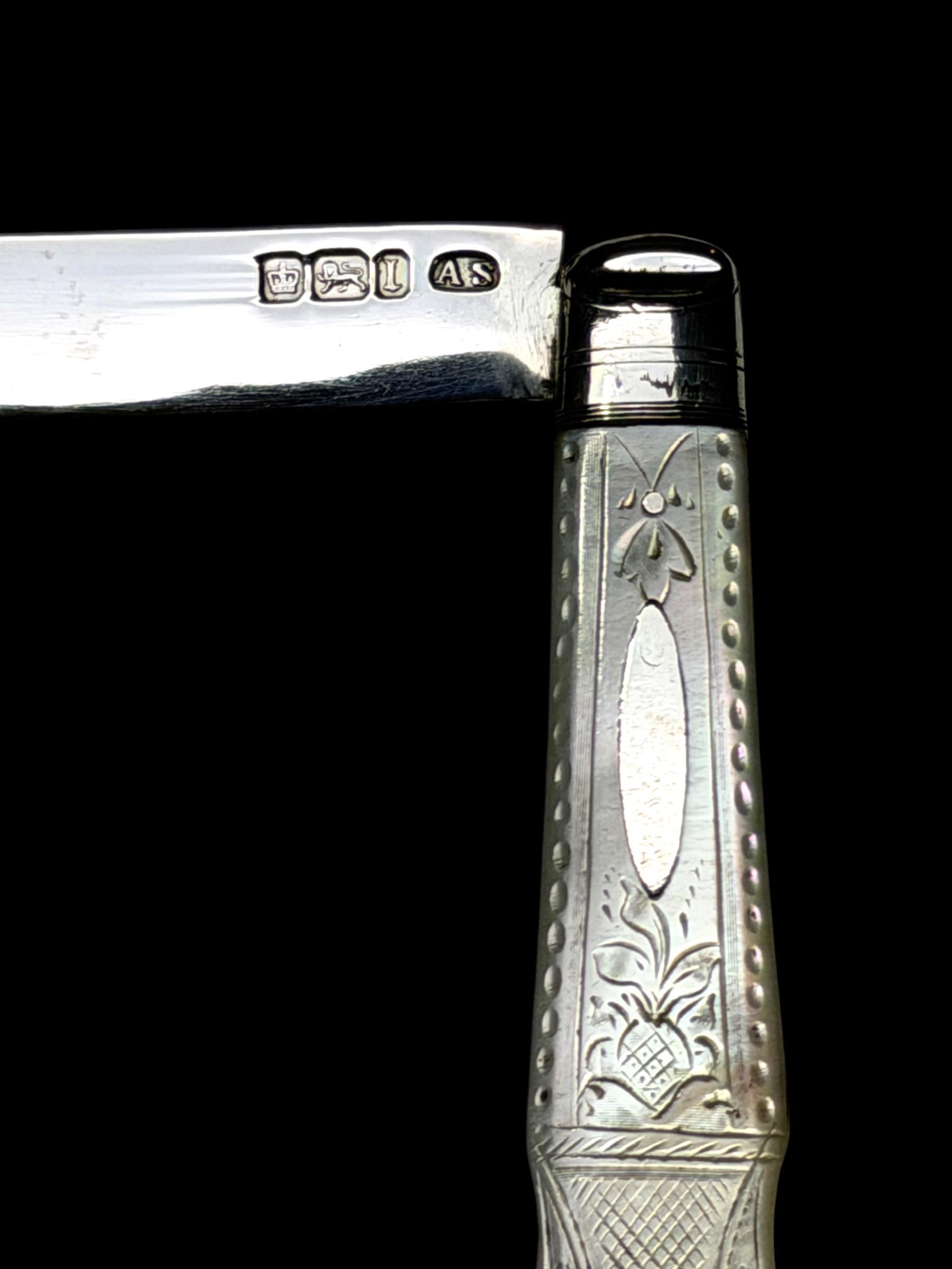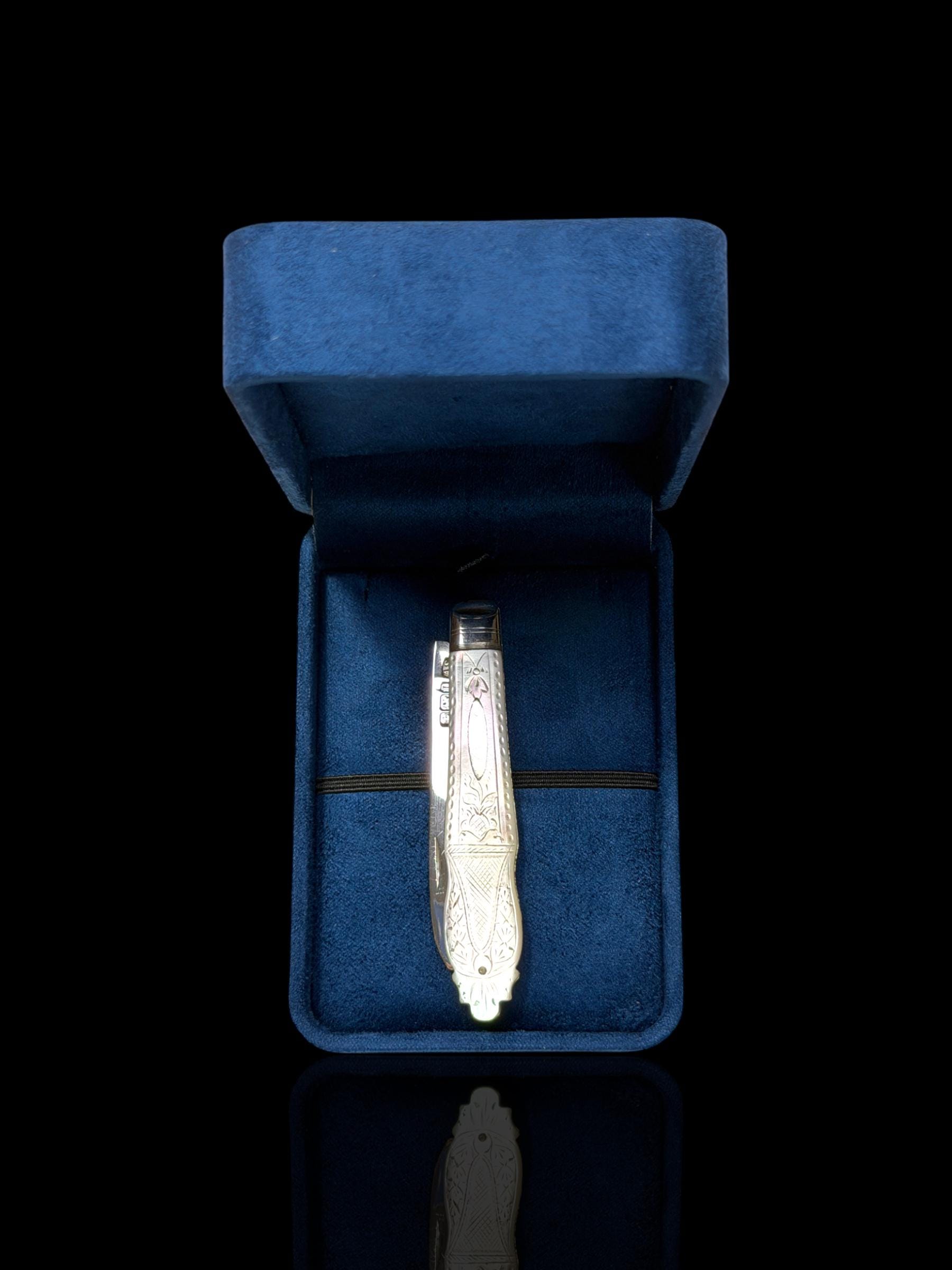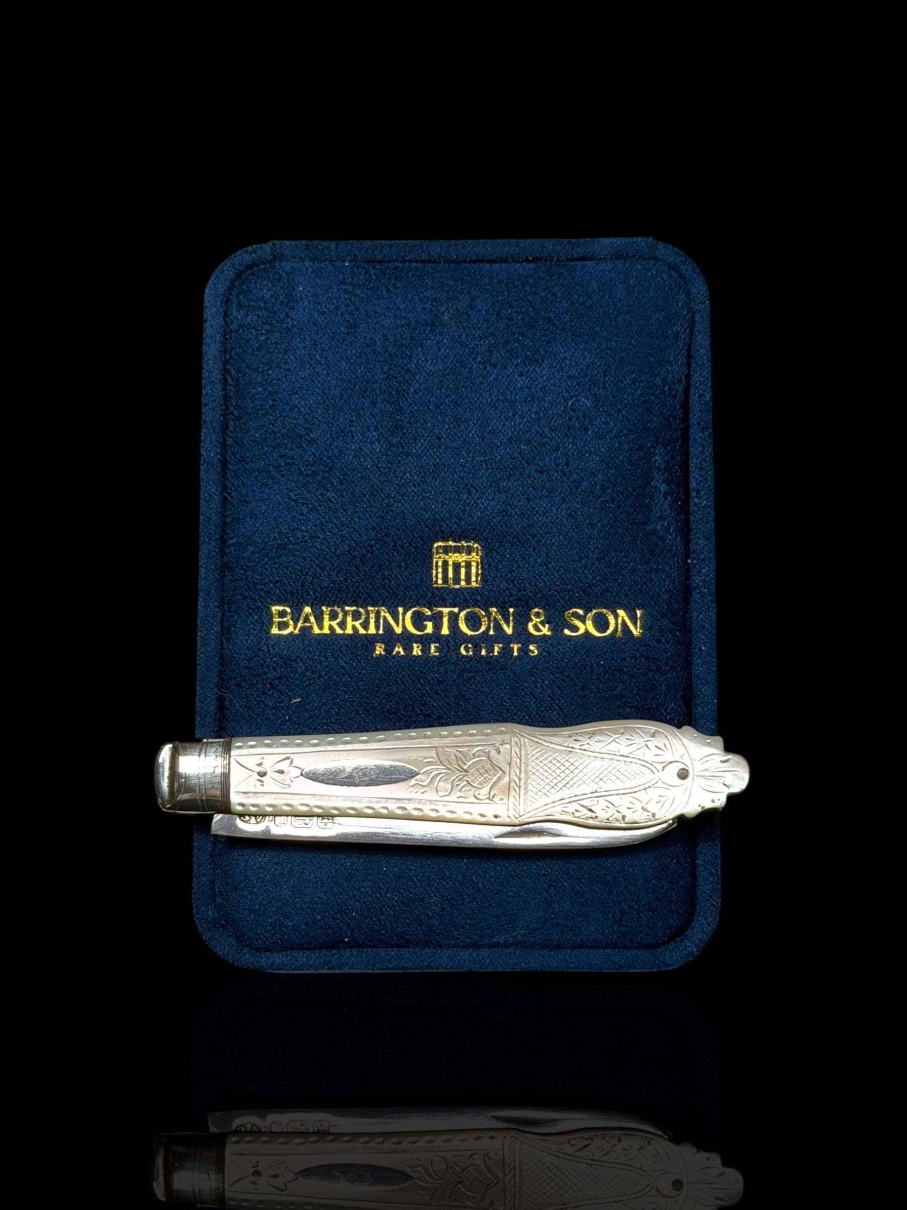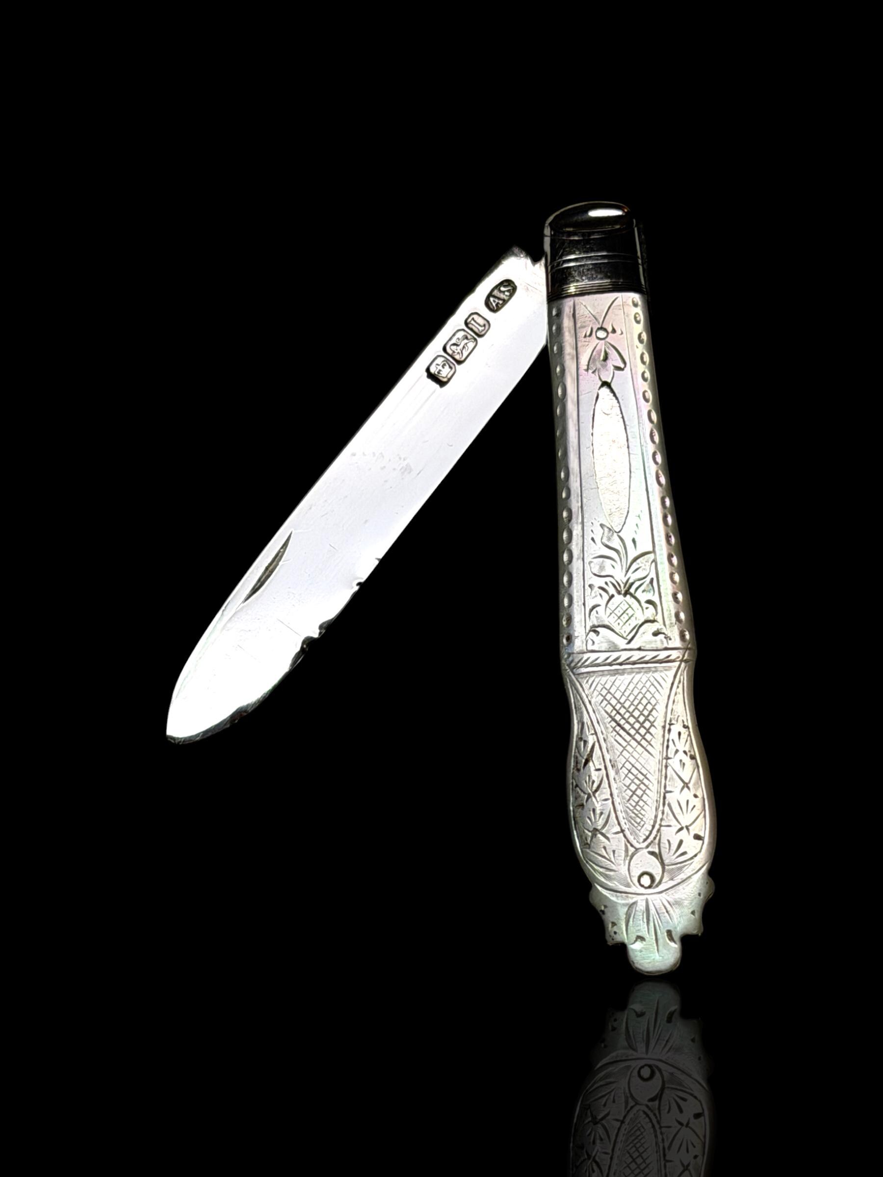 A beautifully designed and executed knife by Arthur Worral Staniforth. The elegant profile and fine engraving on the mother of pearl handle is the standout feature of the knife.