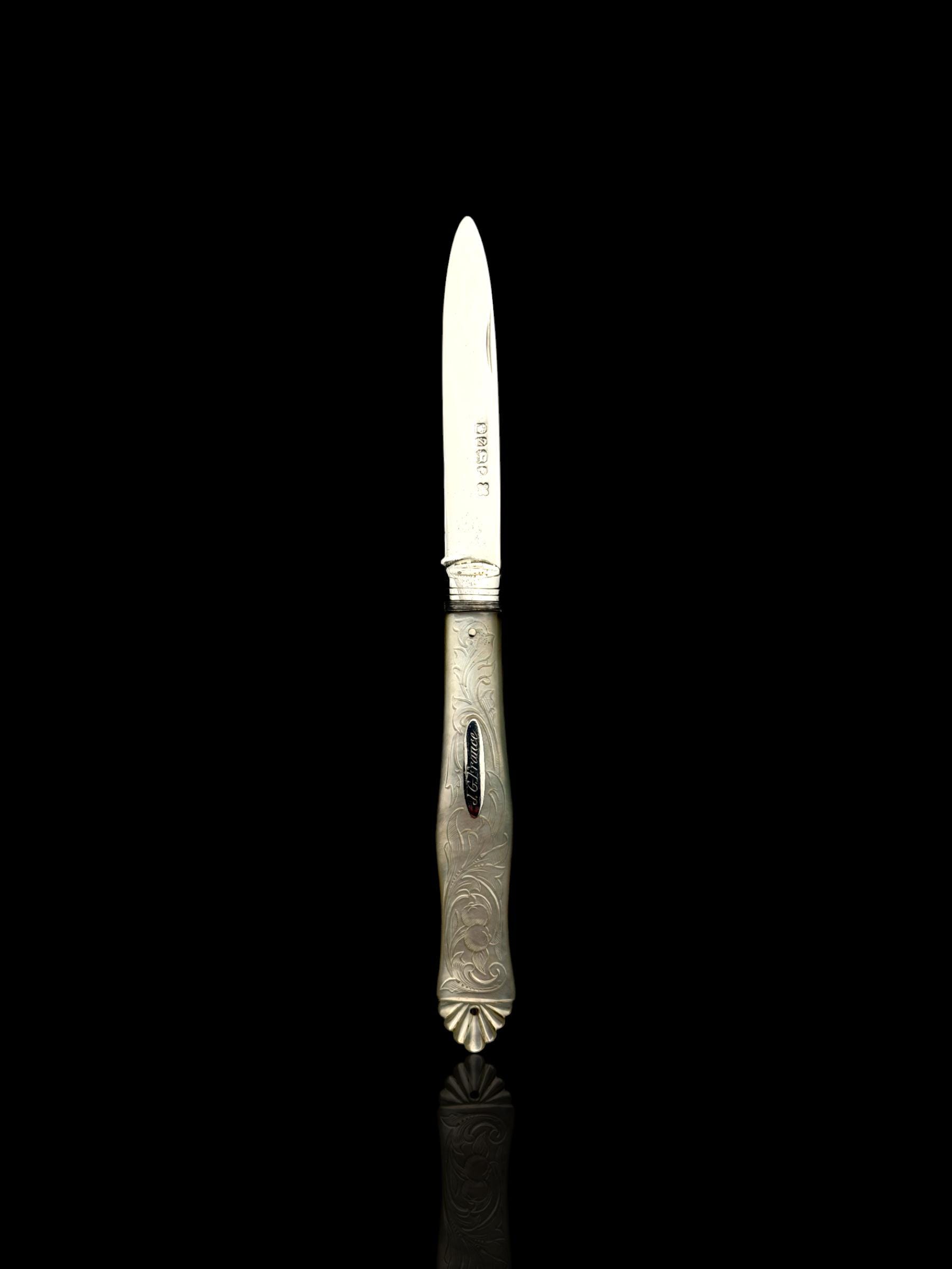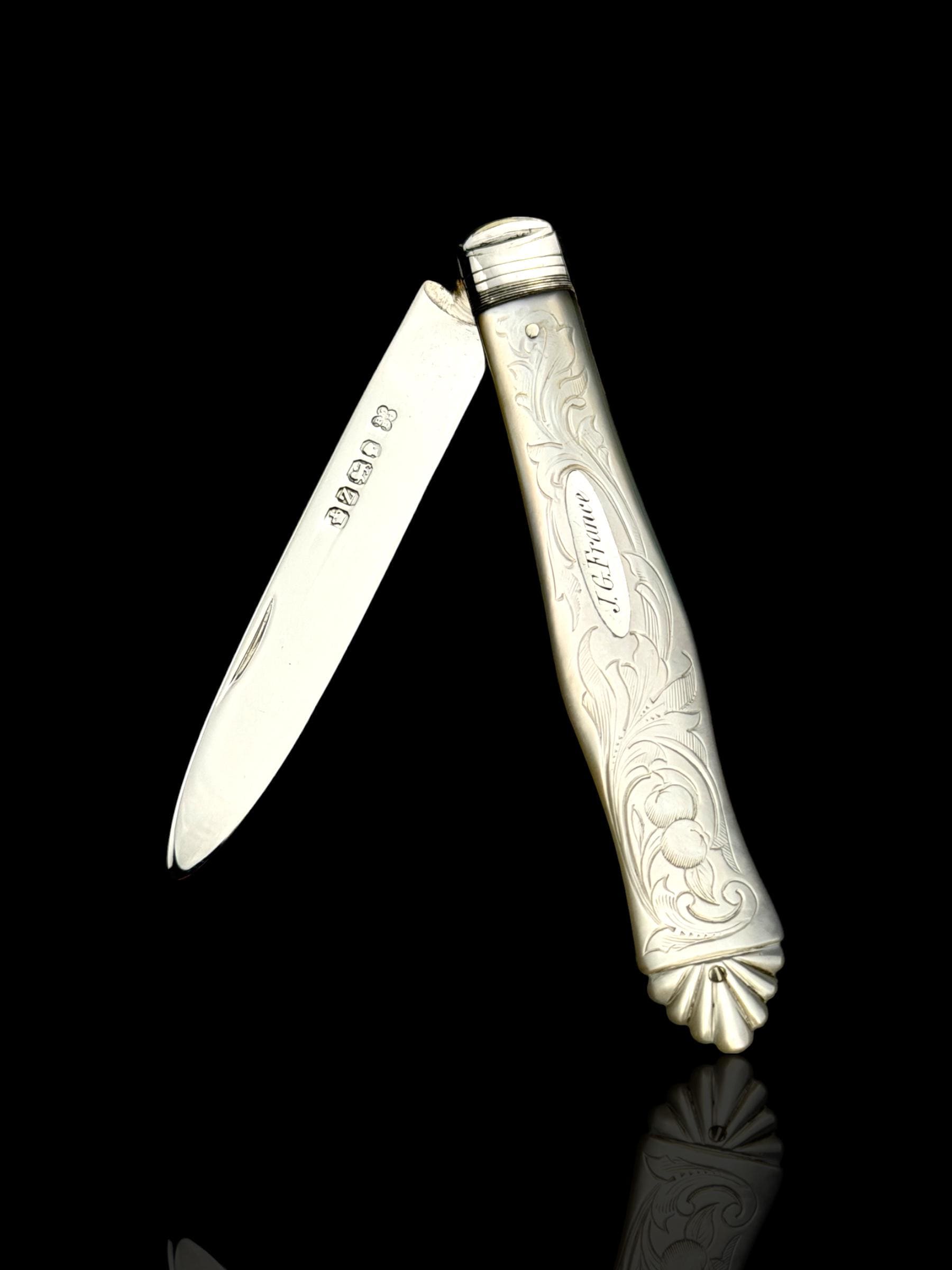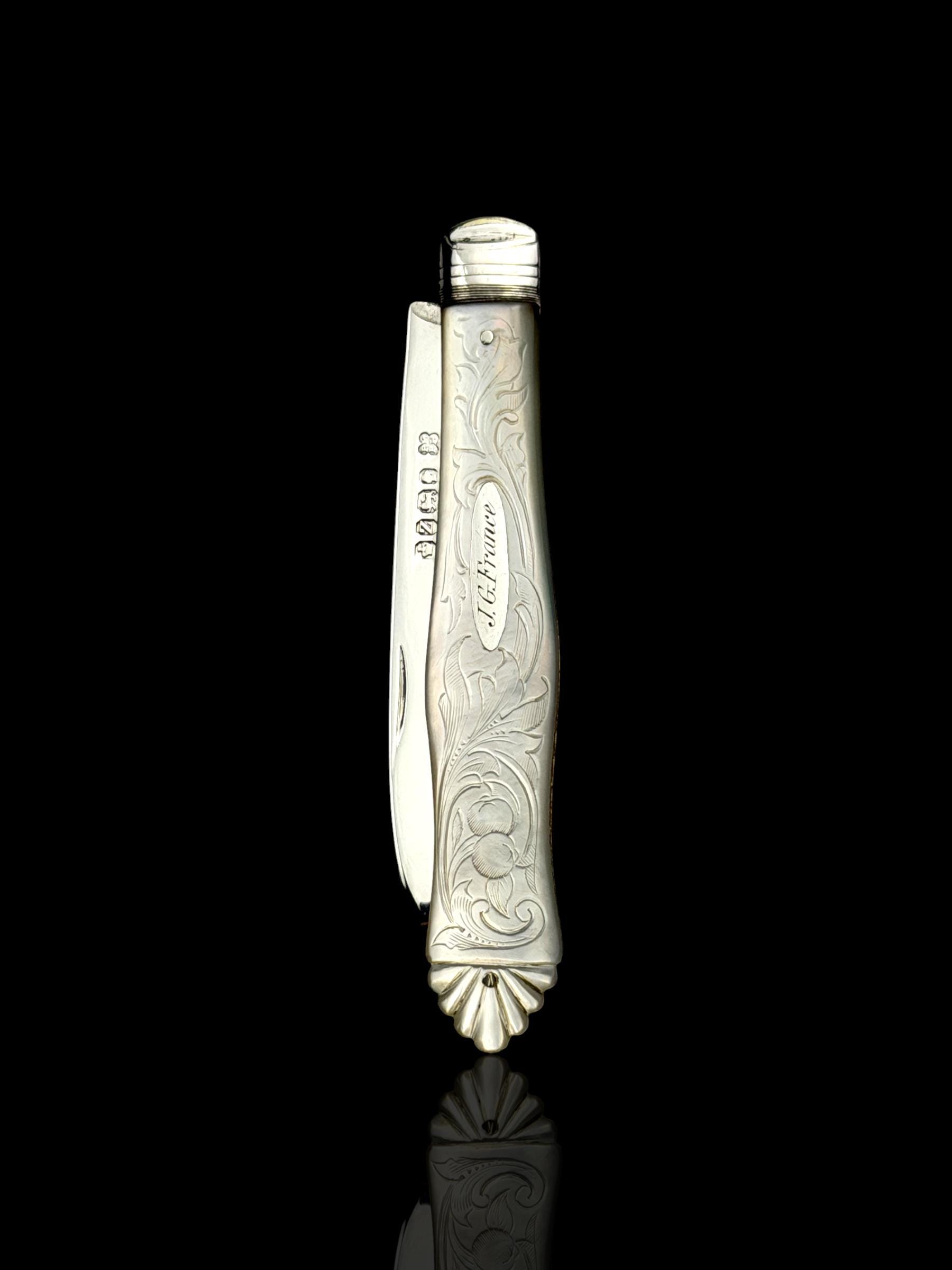 The hallmarks are well-defined and confirm its date, maker and that it is genuine sterling silver; not silver-plate or stainless steel which are obviously significantly cheaper. The portrait hallmark is of Queen Victoria which was to confirm that duty on the silver had been paid to the Crown. As the blade is solid silver, which is softer than stainless steel, it cannot be used on hard objects. Such pocket knives would often be carried to cut and peel fruit which is why they are sometime called fruit knives.
