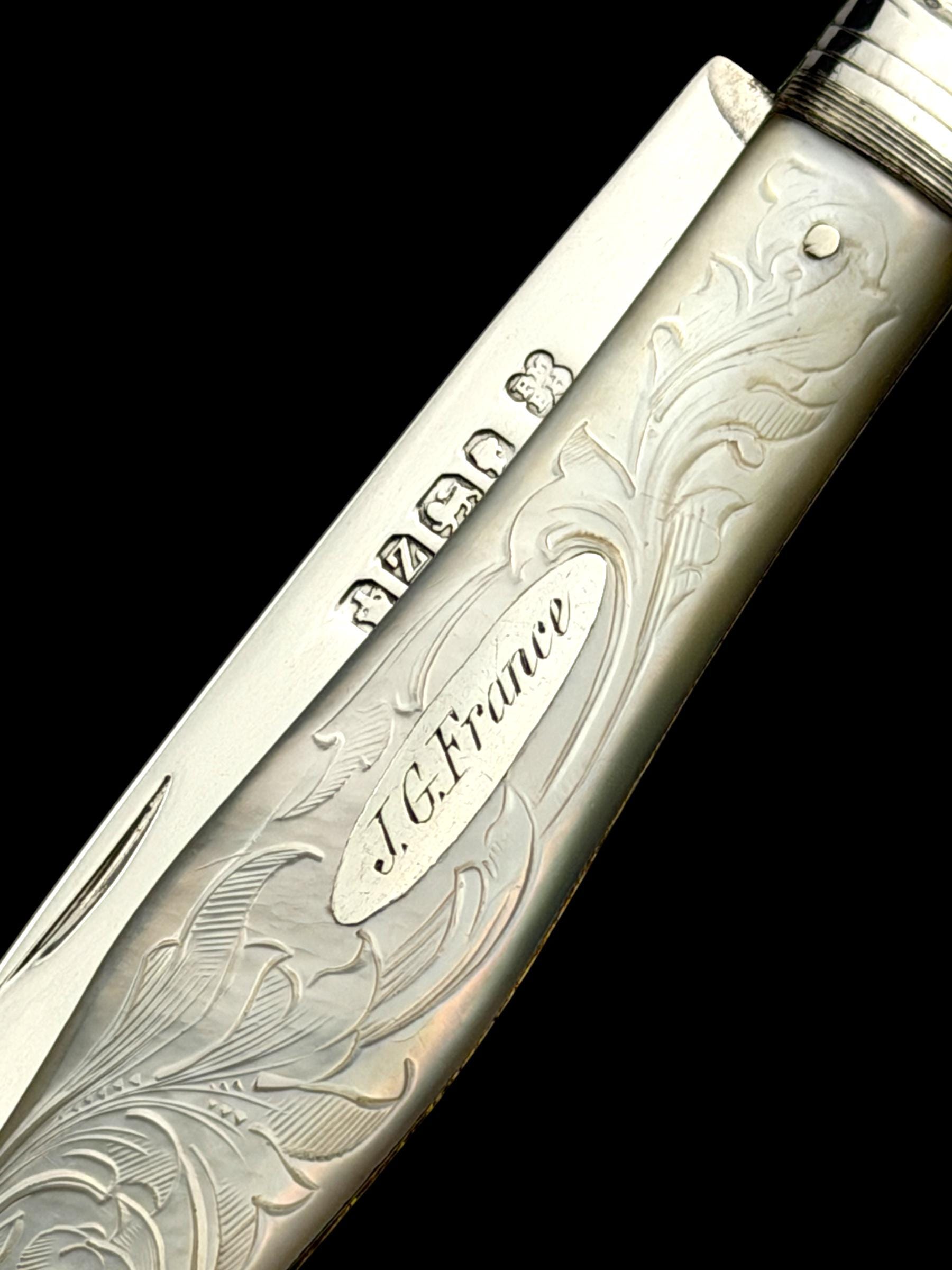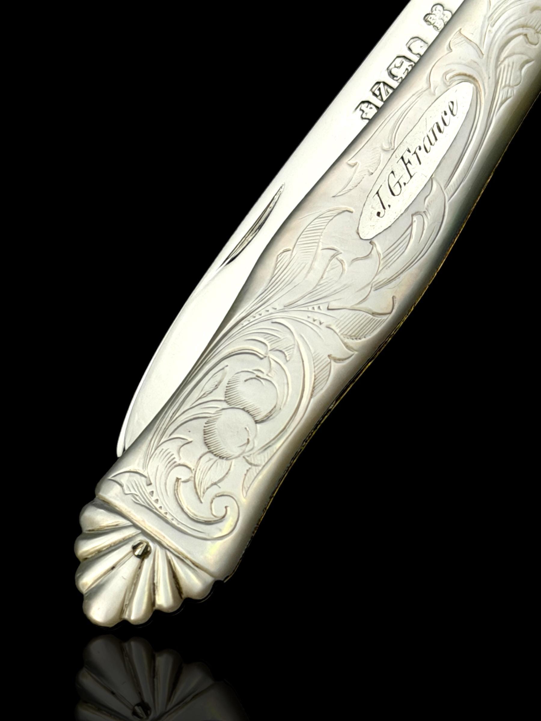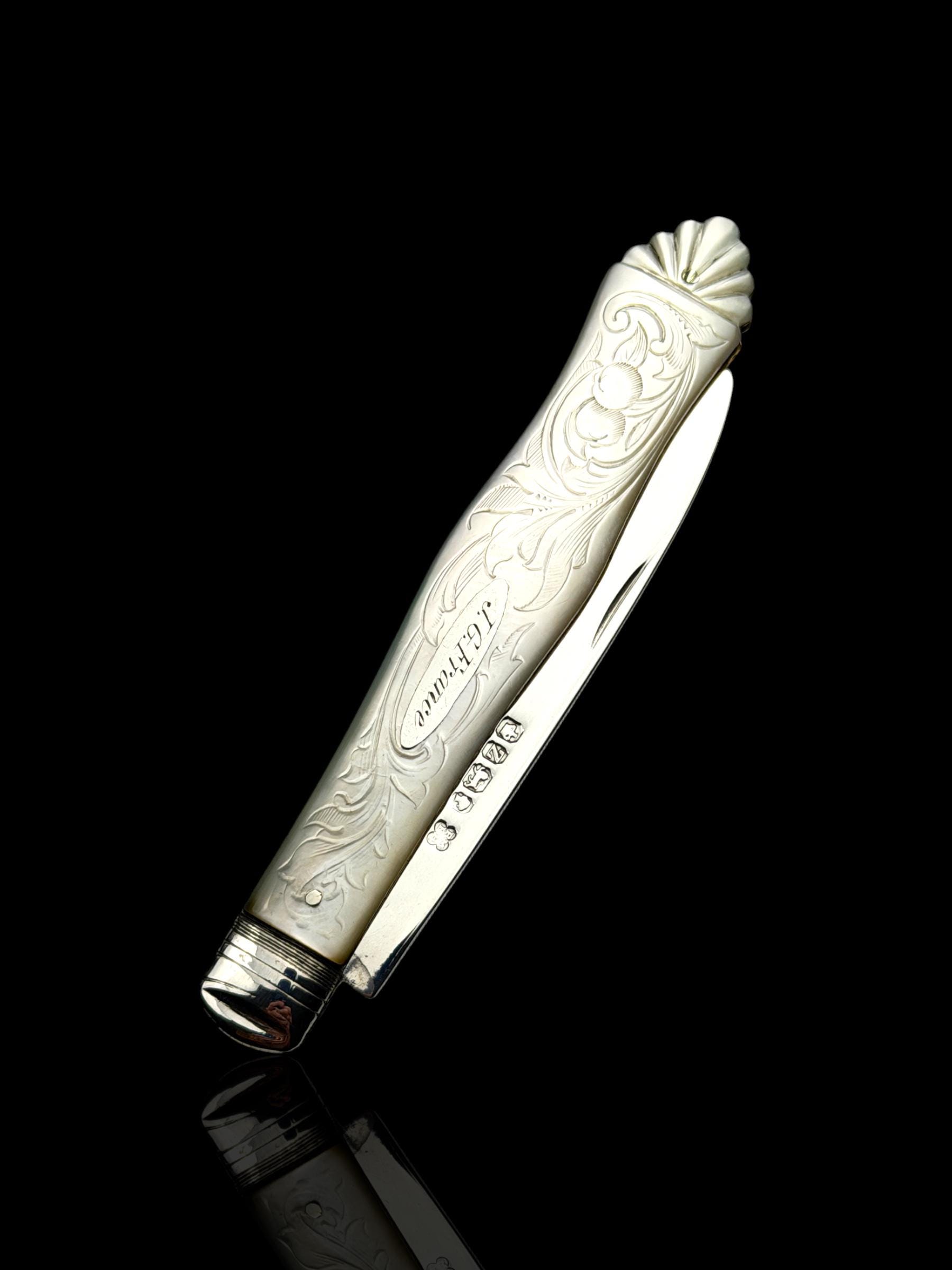 The hallmarks are well-defined and confirm its date, maker and that it is genuine sterling silver; not silver-plate or stainless steel which are obviously significantly cheaper. The portrait hallmark is of Queen Victoria which was to confirm that duty on the silver had been paid to the Crown. As the blade is solid silver, which is softer than stainless steel, it cannot be used on hard objects. Such pocket knives would often be carried to cut and peel fruit which is why they are sometime called fruit knives.