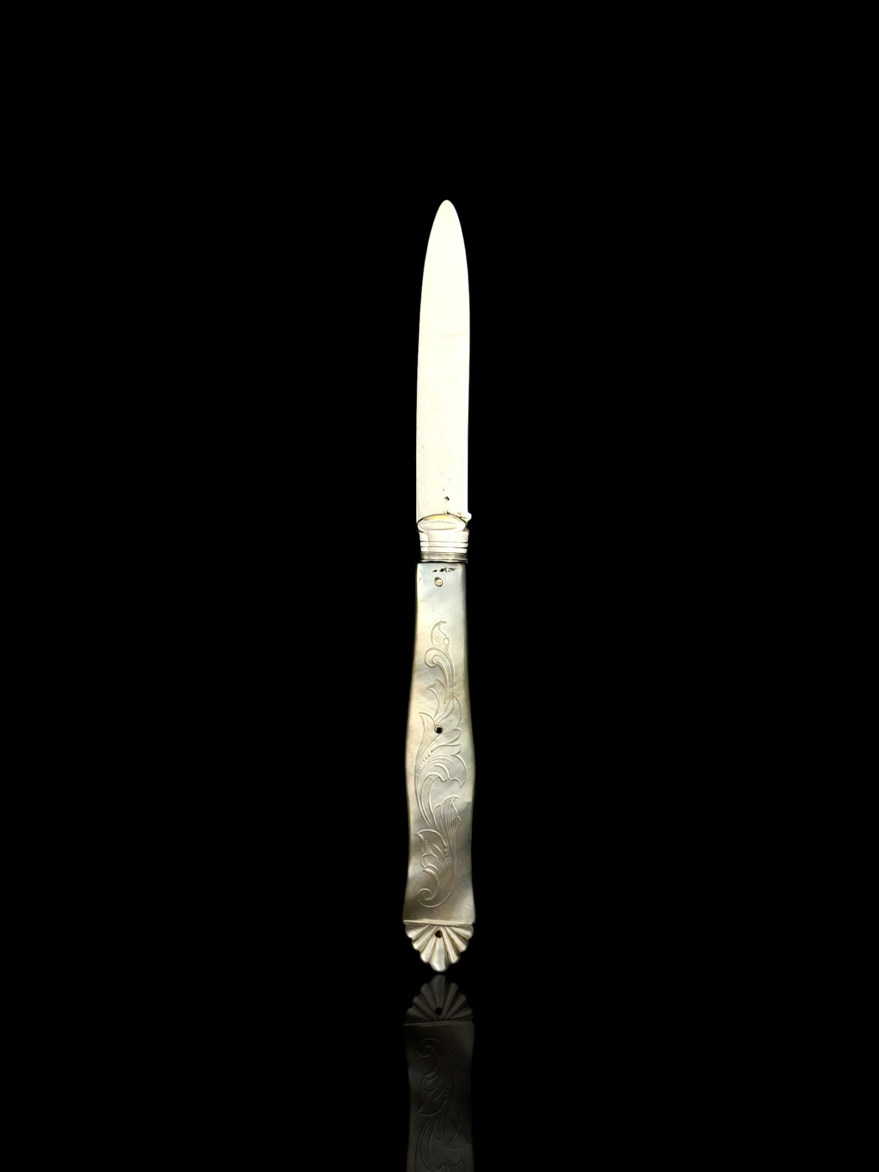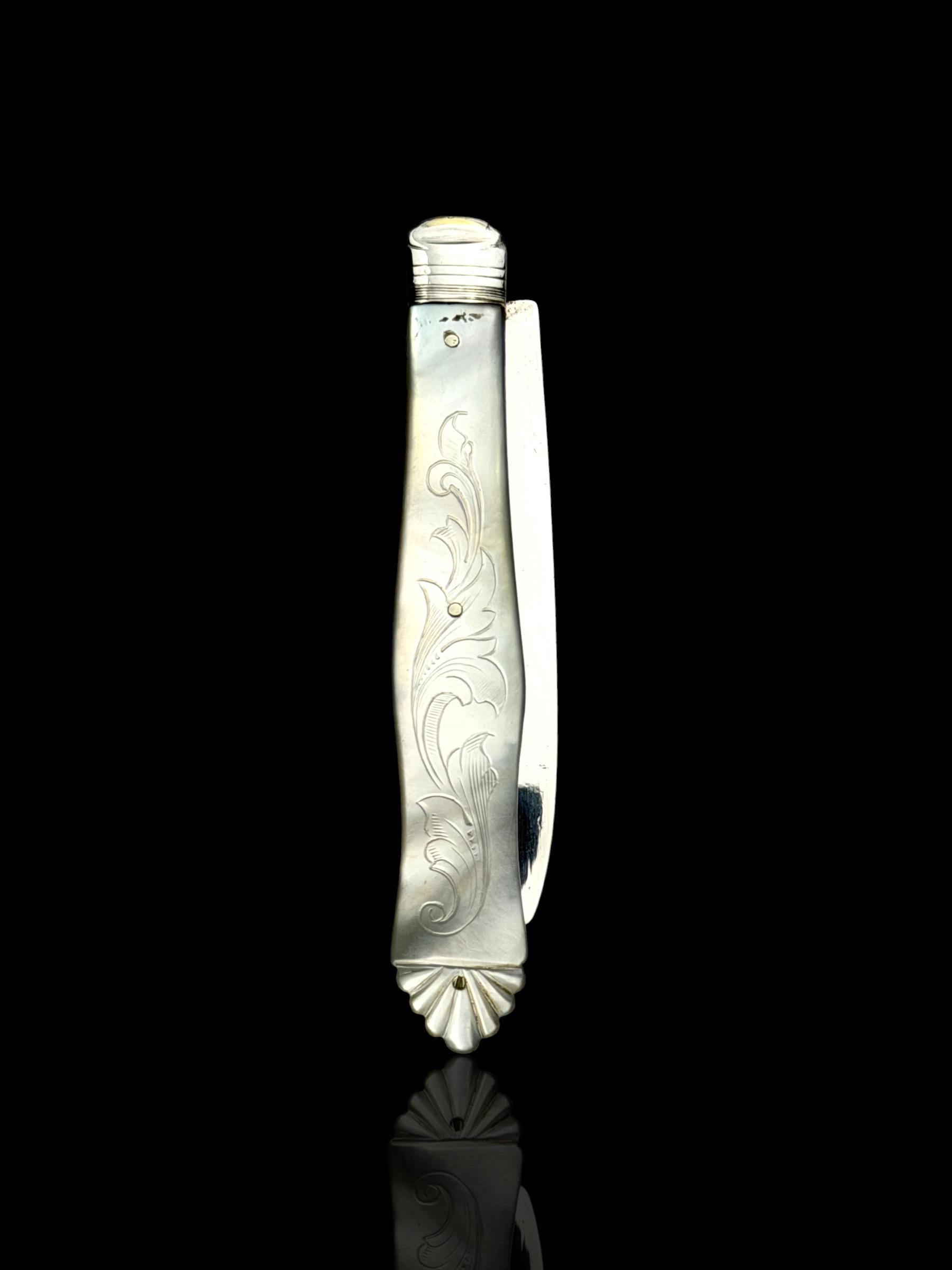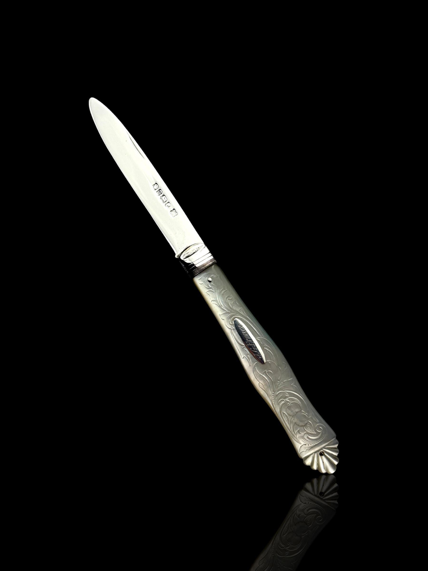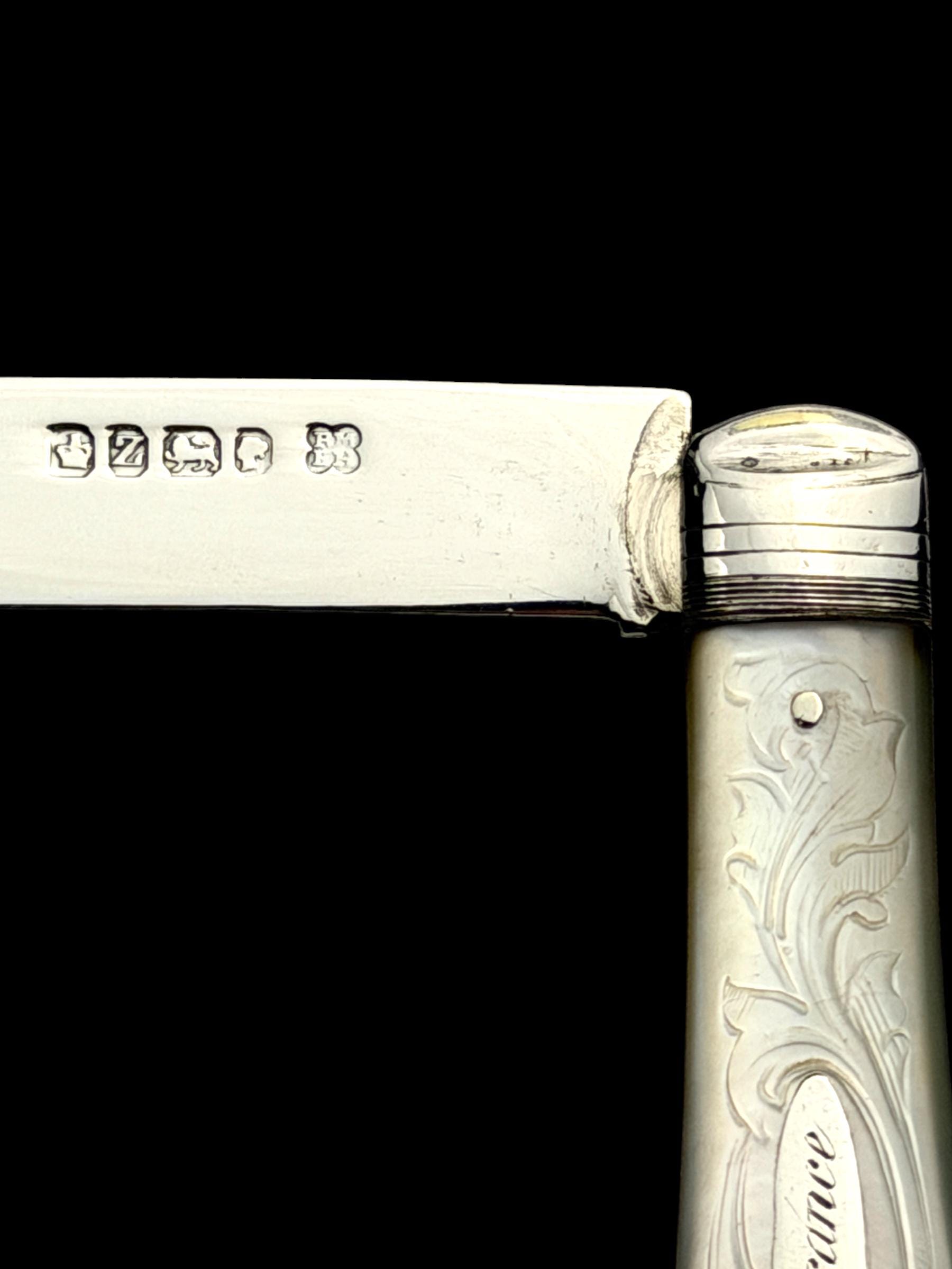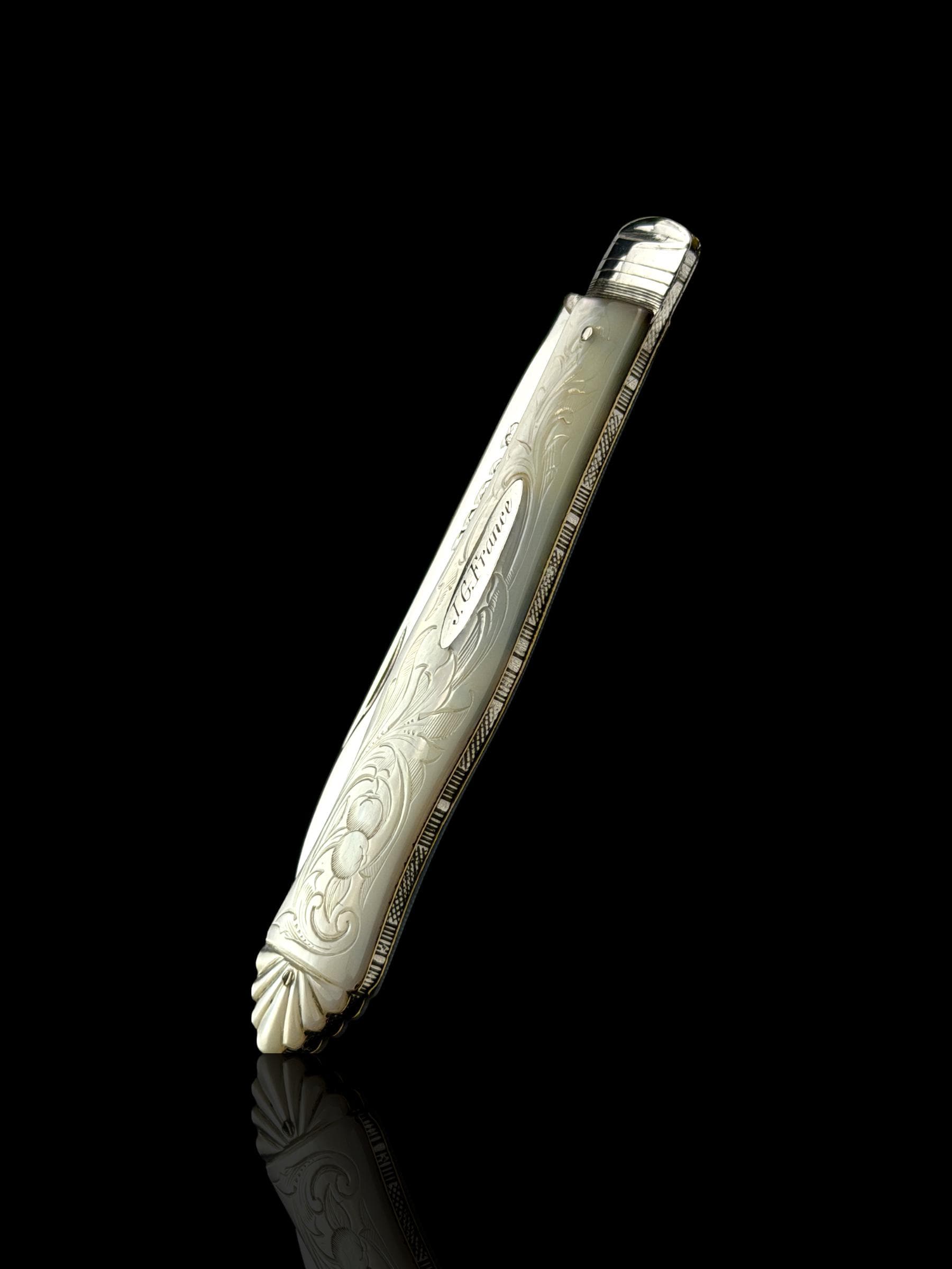 The hand-carved handle is high quality mother of pearl which almost certainly would have been carved from Australian pearl shell which were exported to England from the 1800s.