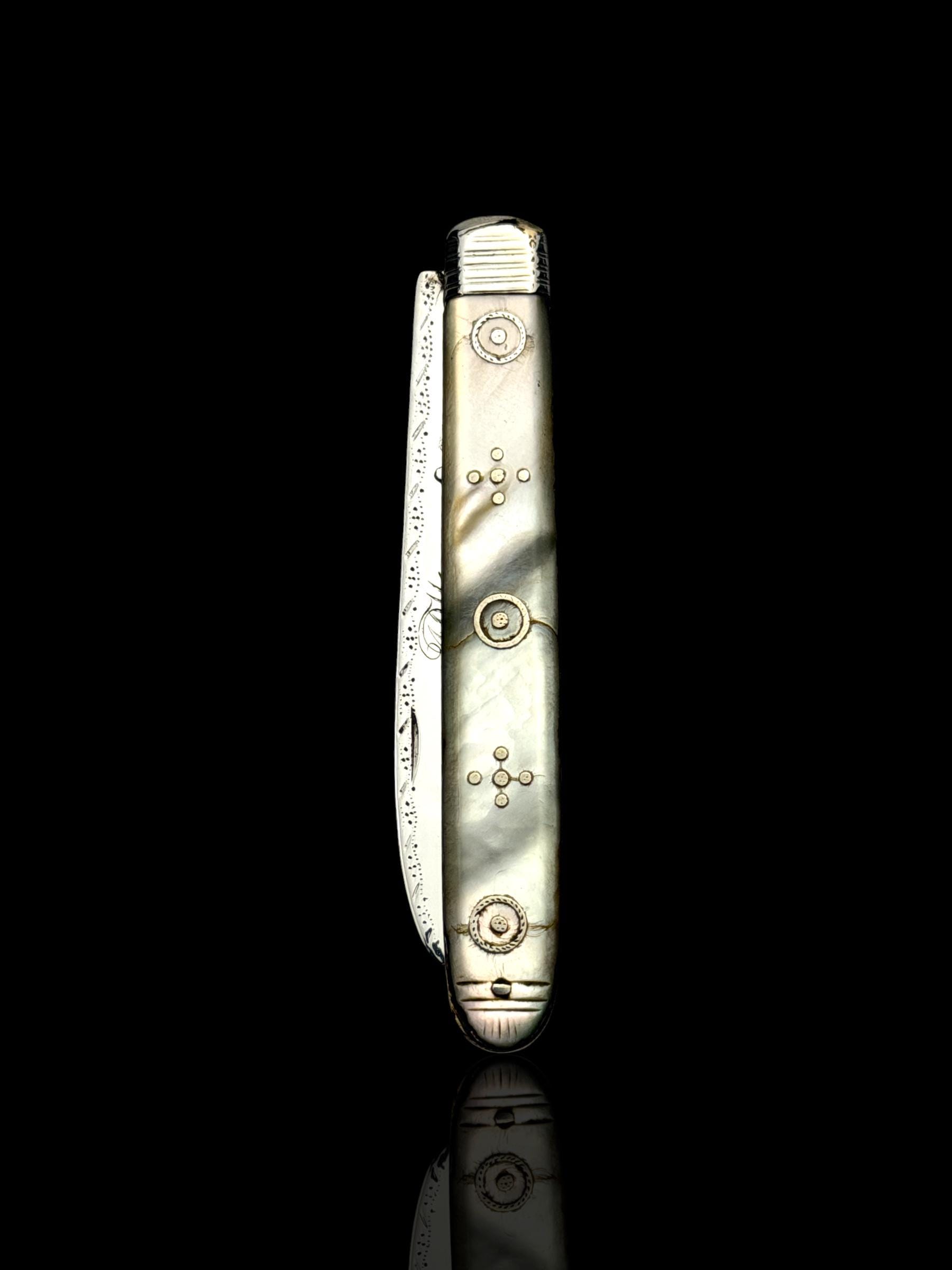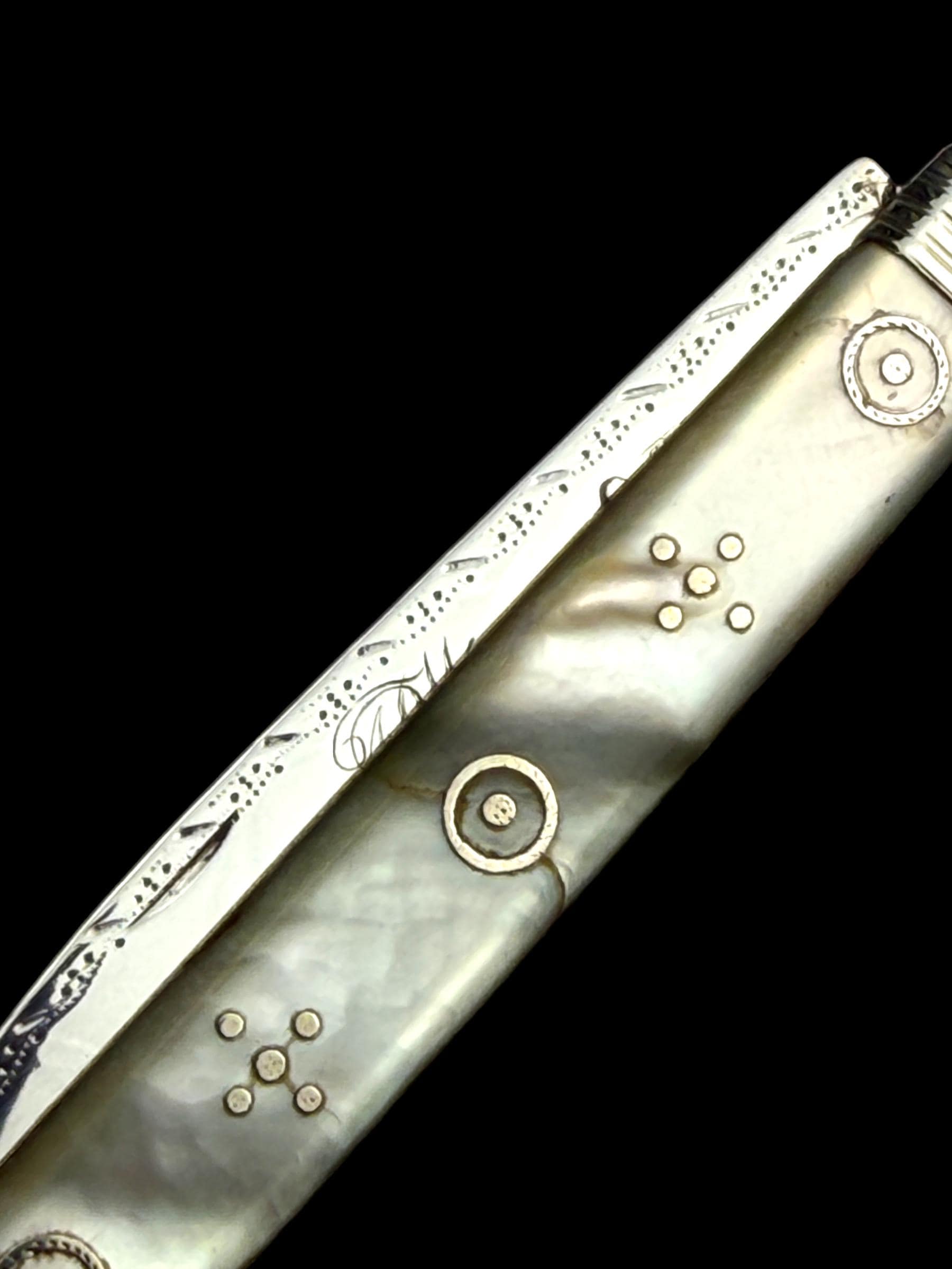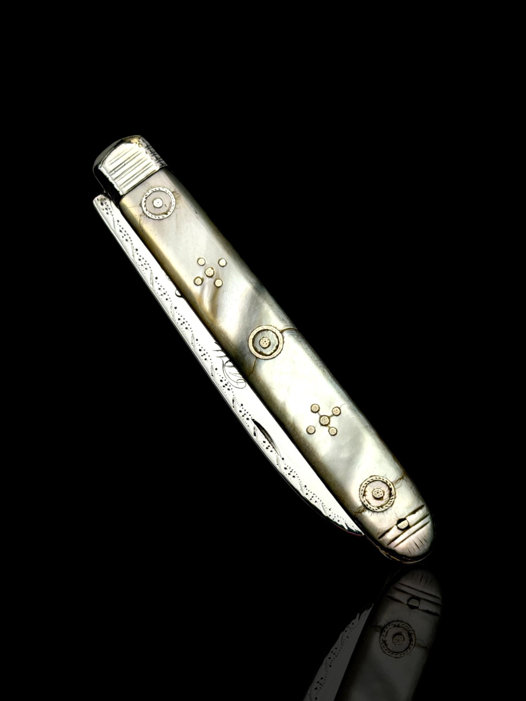 The mother of pearl handle has fine silver details set into the mother of pearl. One scale has some light cracks through the mother of pearl as is shown in the image but it is structurally sound.