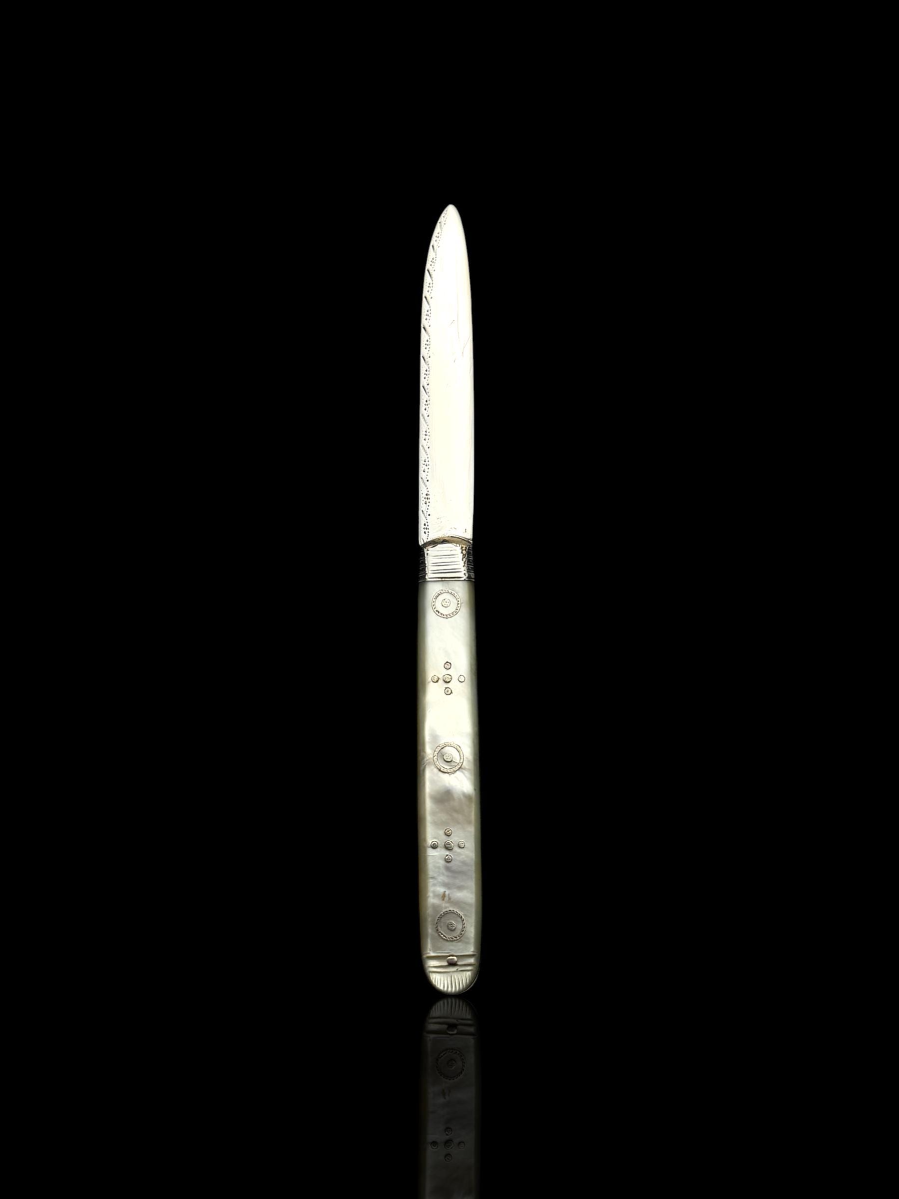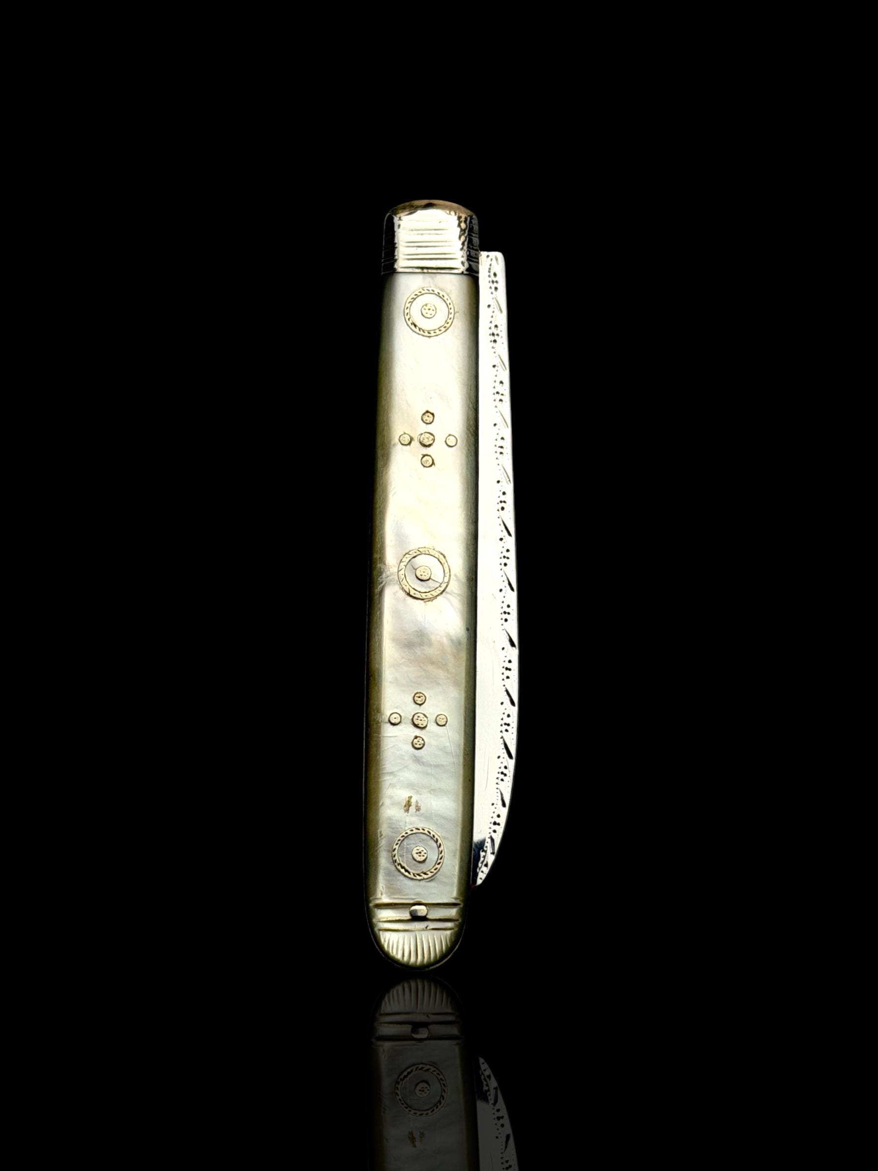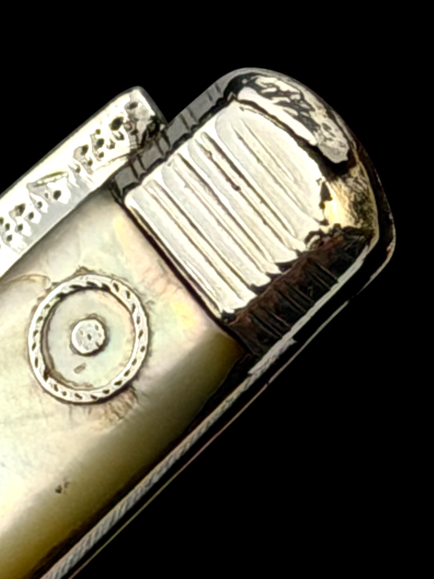 The mother of pearl handle has fine silver details set into the mother of pearl. One scale has some light cracks through the mother of pearl as is shown in the image but it is structurally sound.