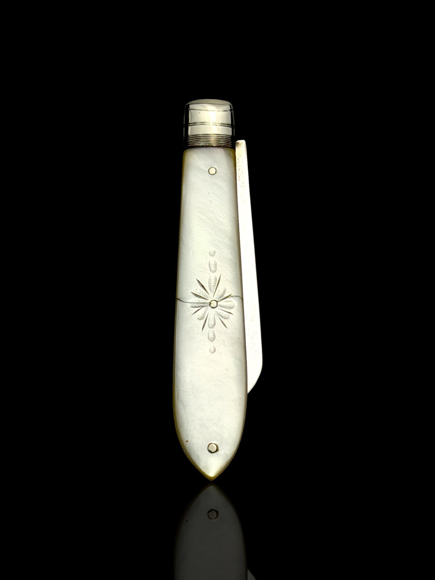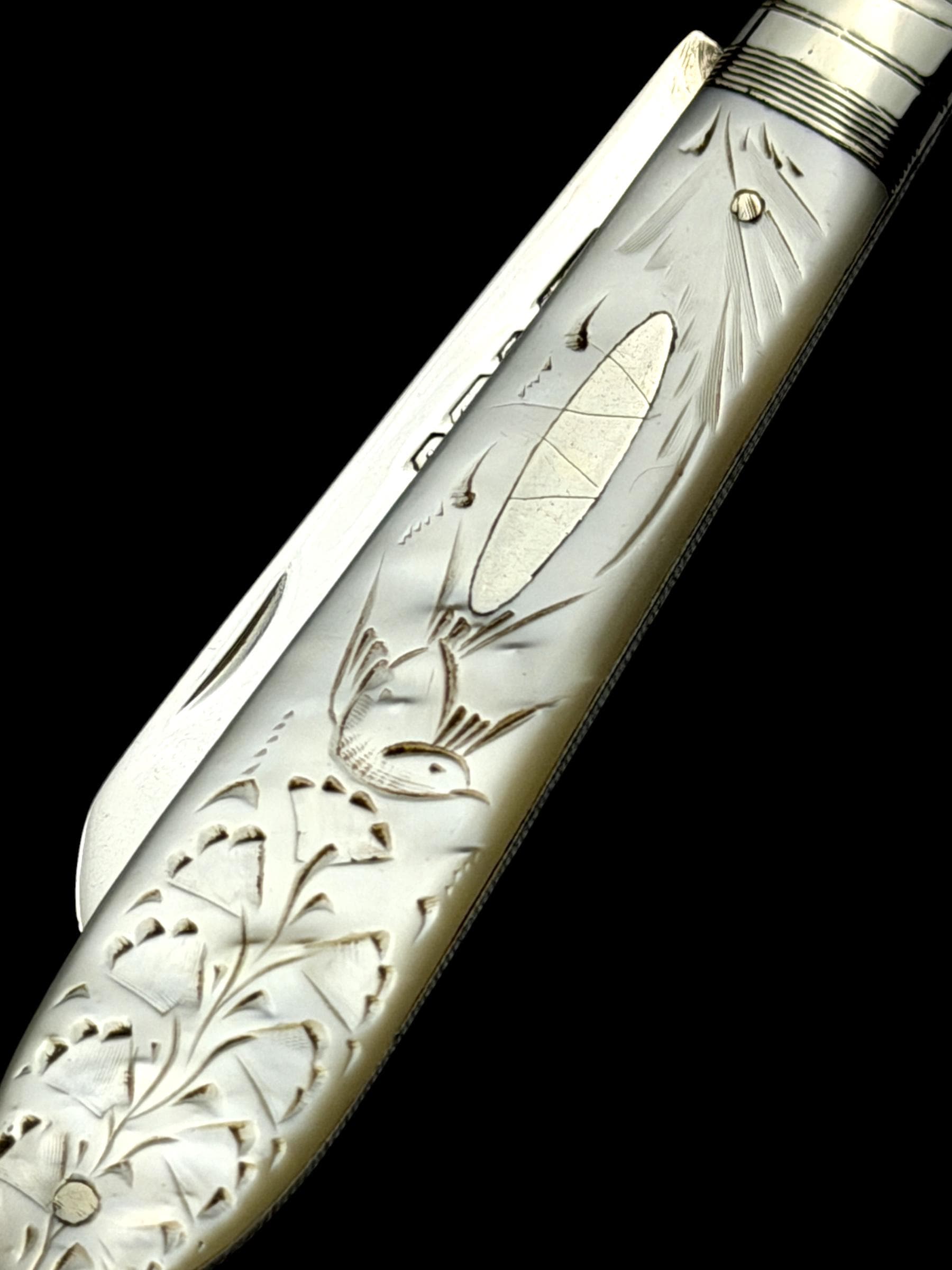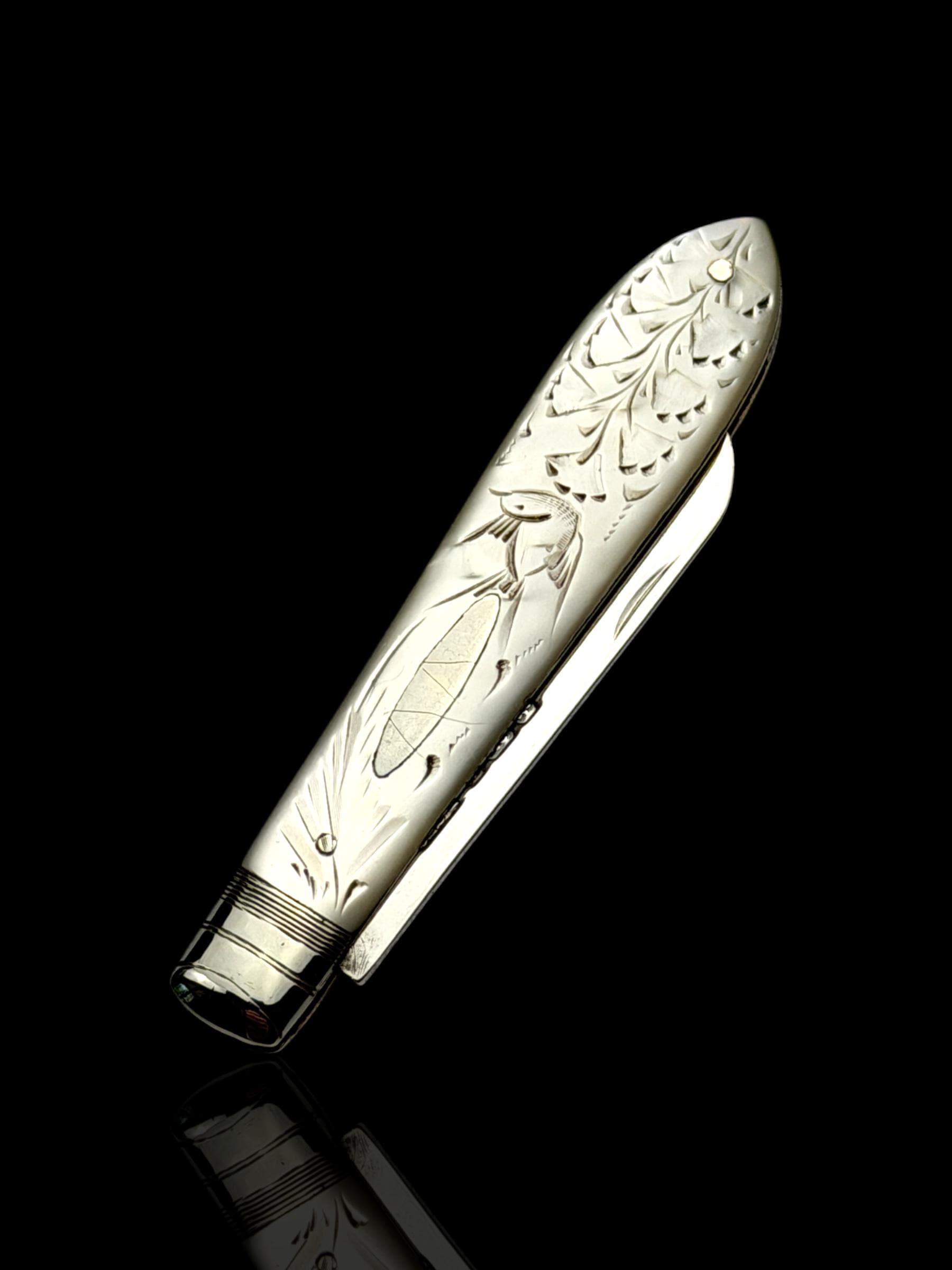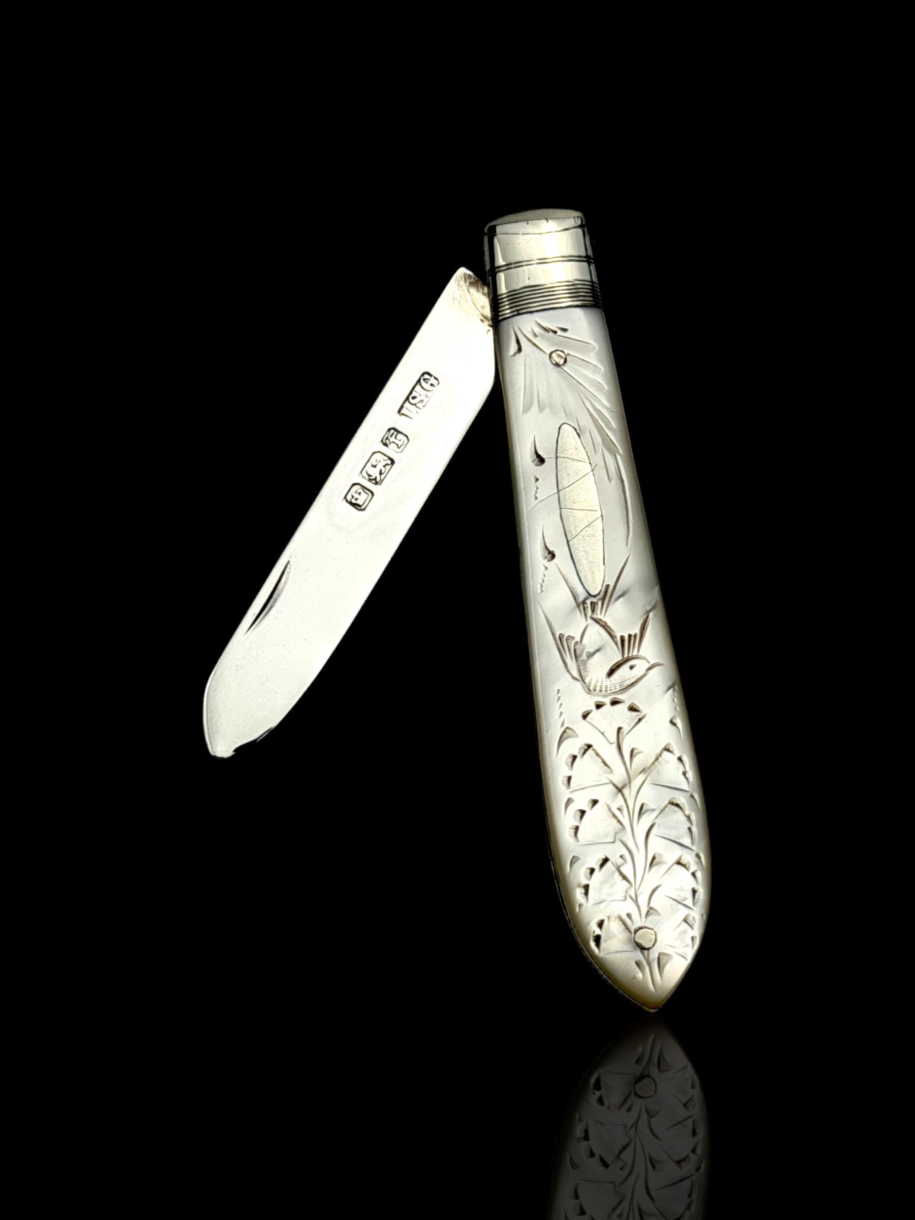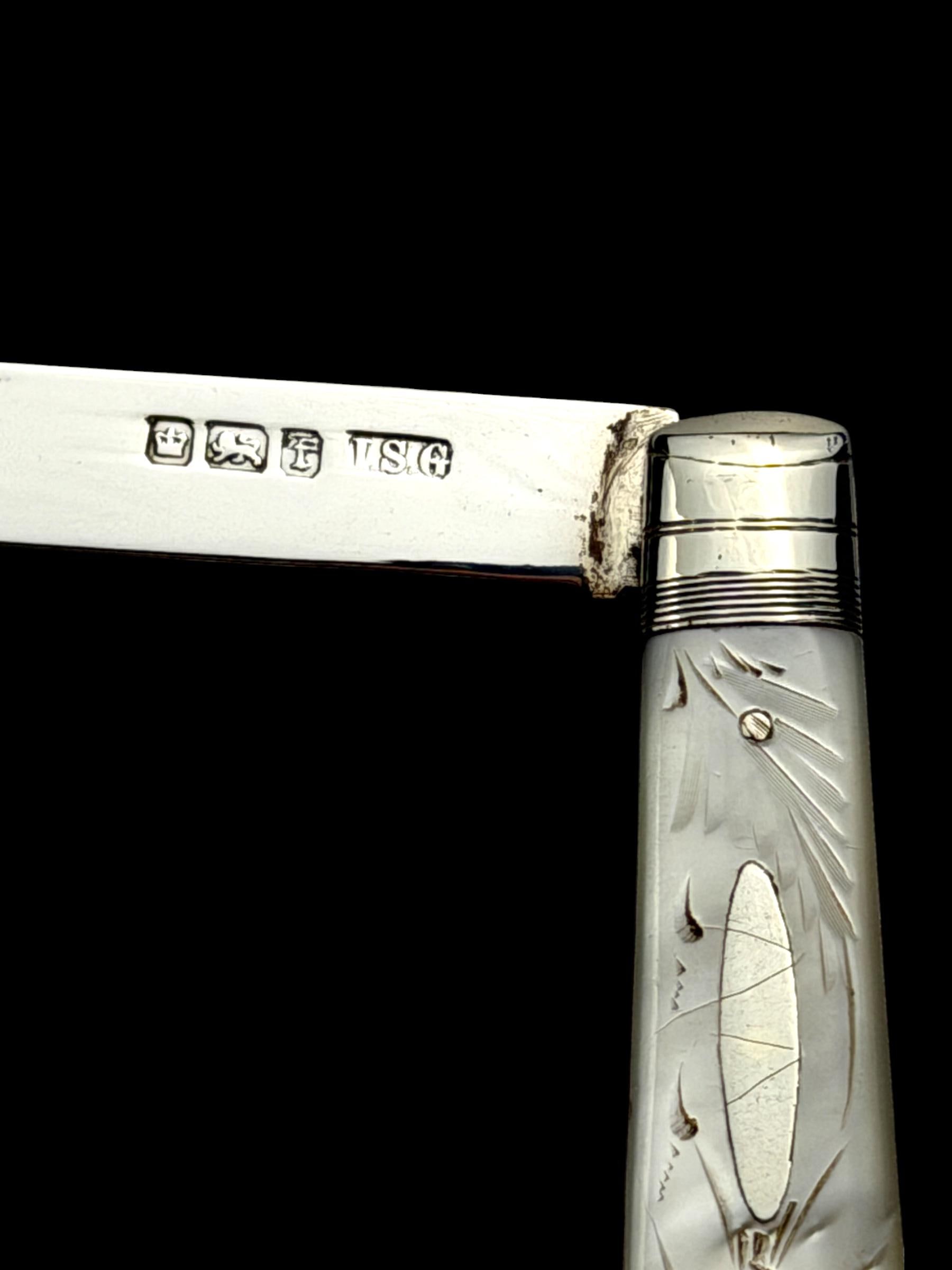 The hallmarks are well-defined and confirm its date, maker and that it is genuine sterling silver; not silver-plate or stainless steel which are obviously significantly cheaper. As the blade is solid silver, which is softer than stainless steel, it cannot be used on hard objects. Such pocket knives would often be carried to cut and peel fruit which is why they are sometime called fruit knives.