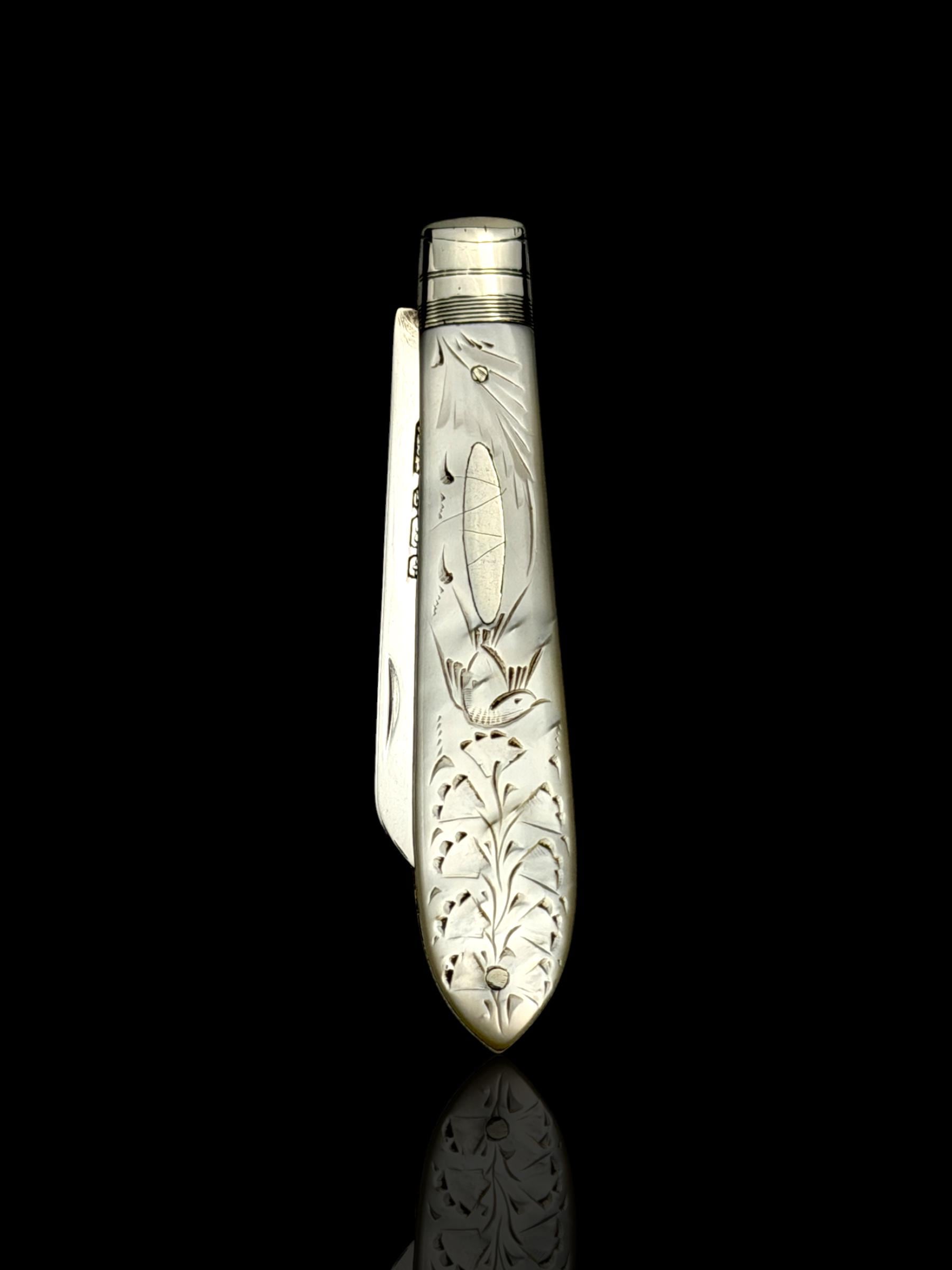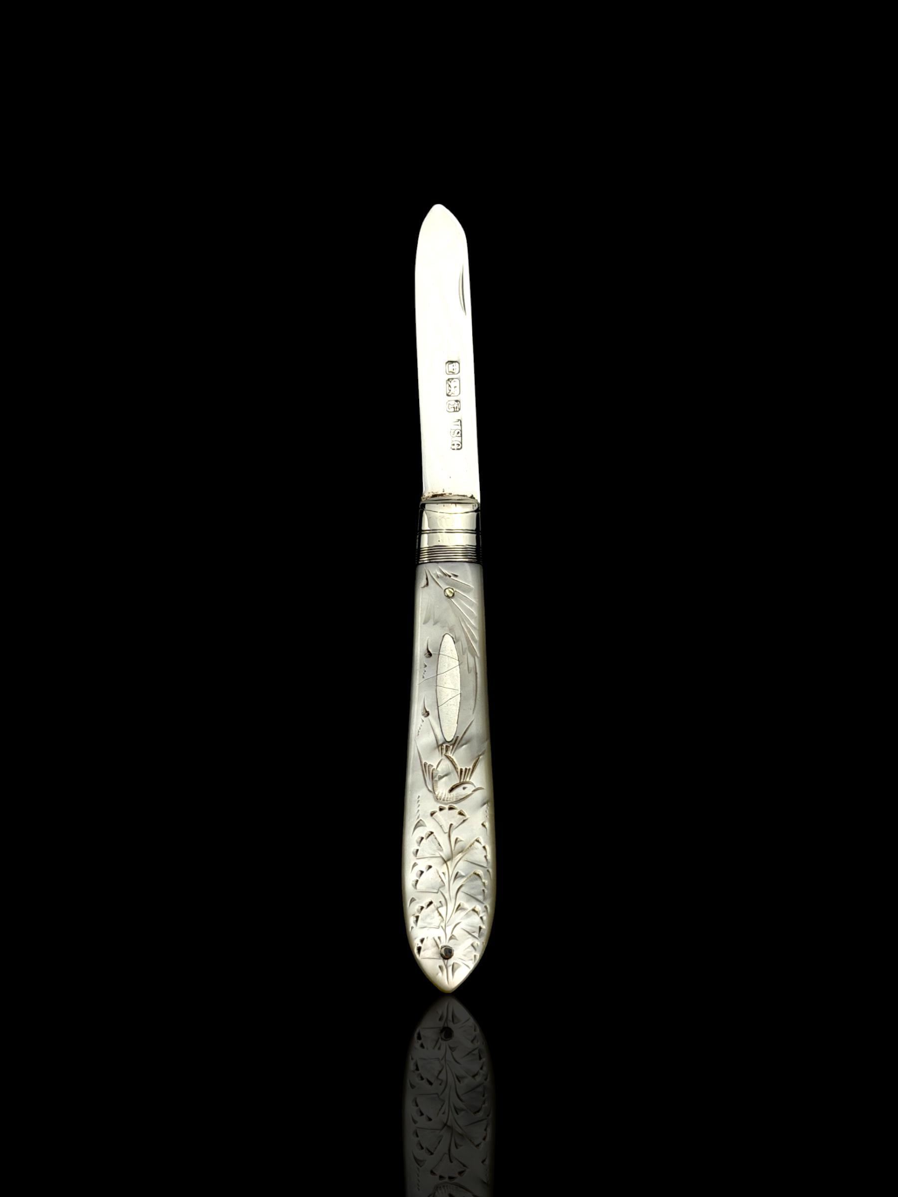 Made by English Silversmith Israel Sigmund Greenberg. The standout feature of this piece is the beautifully hand-carved handle. It is high quality mother of pearl which almost certainly would have been carved from Australian pearl shell which were exported to England from the 1800s.