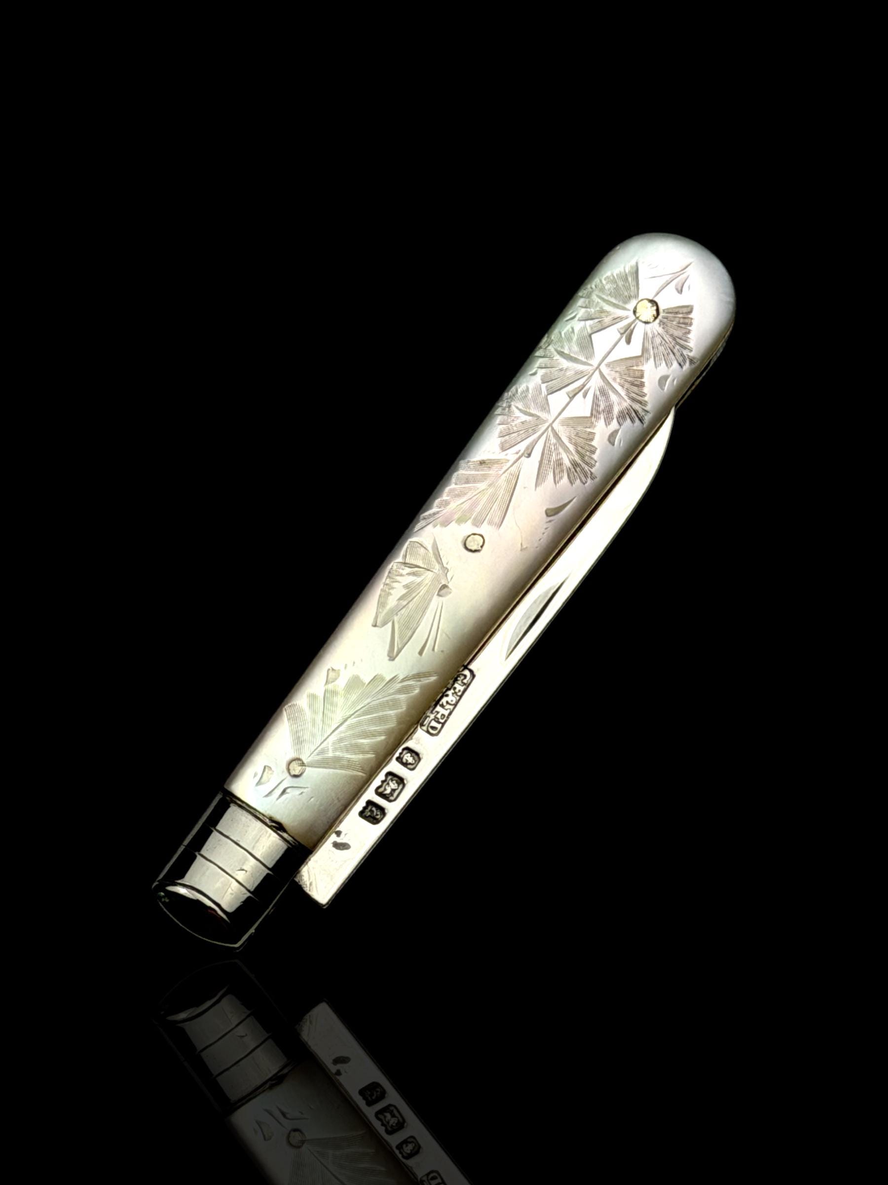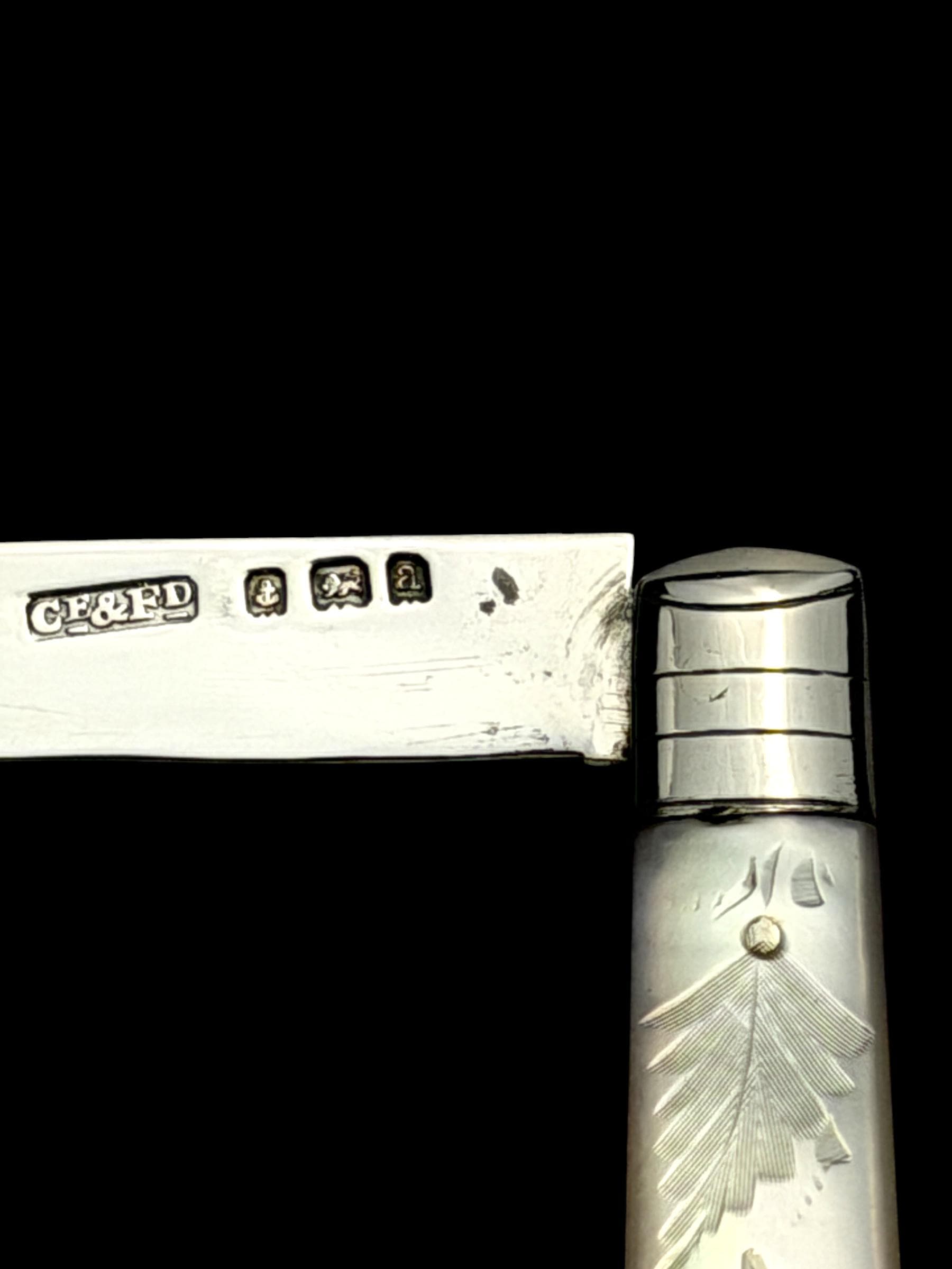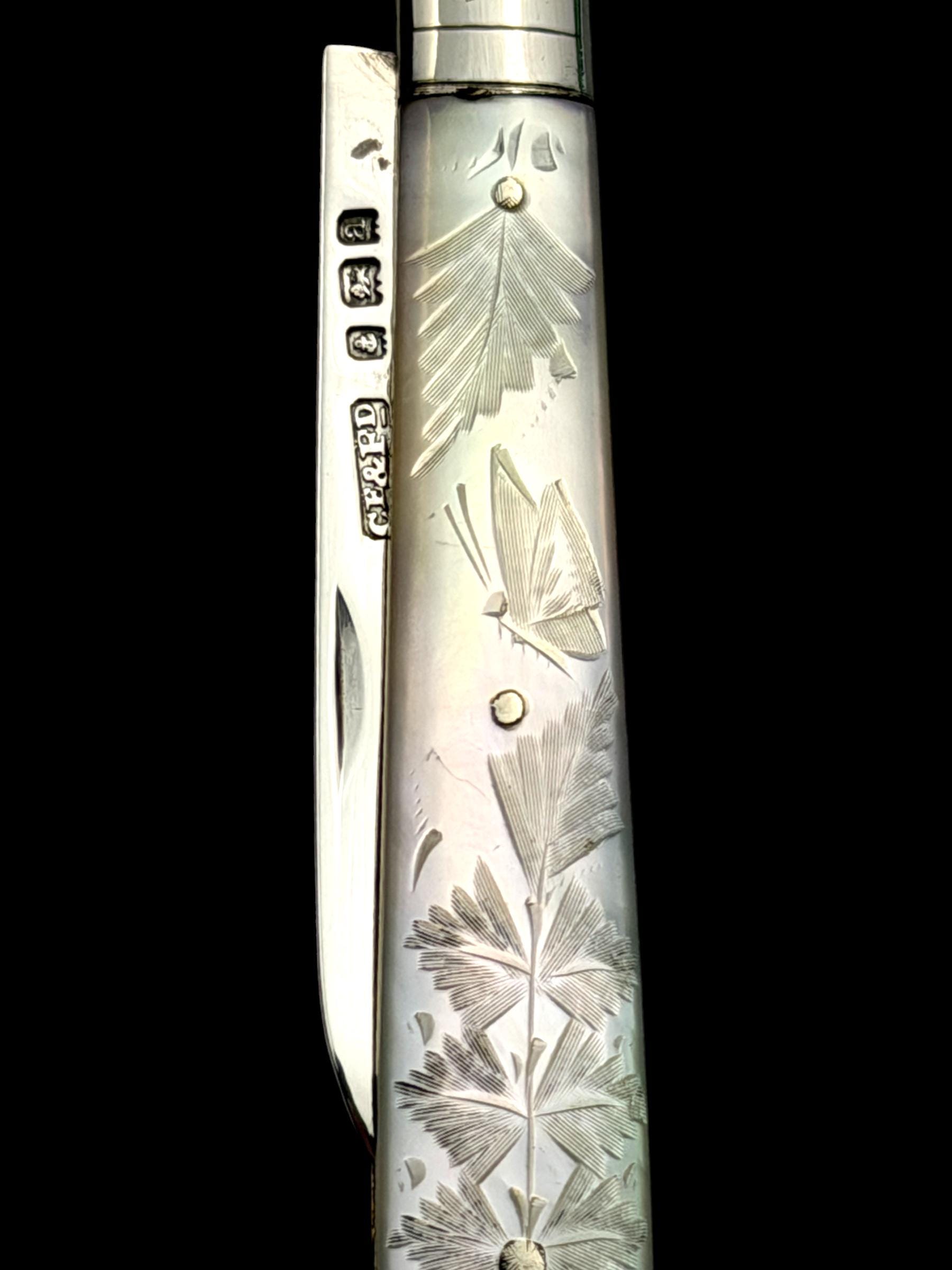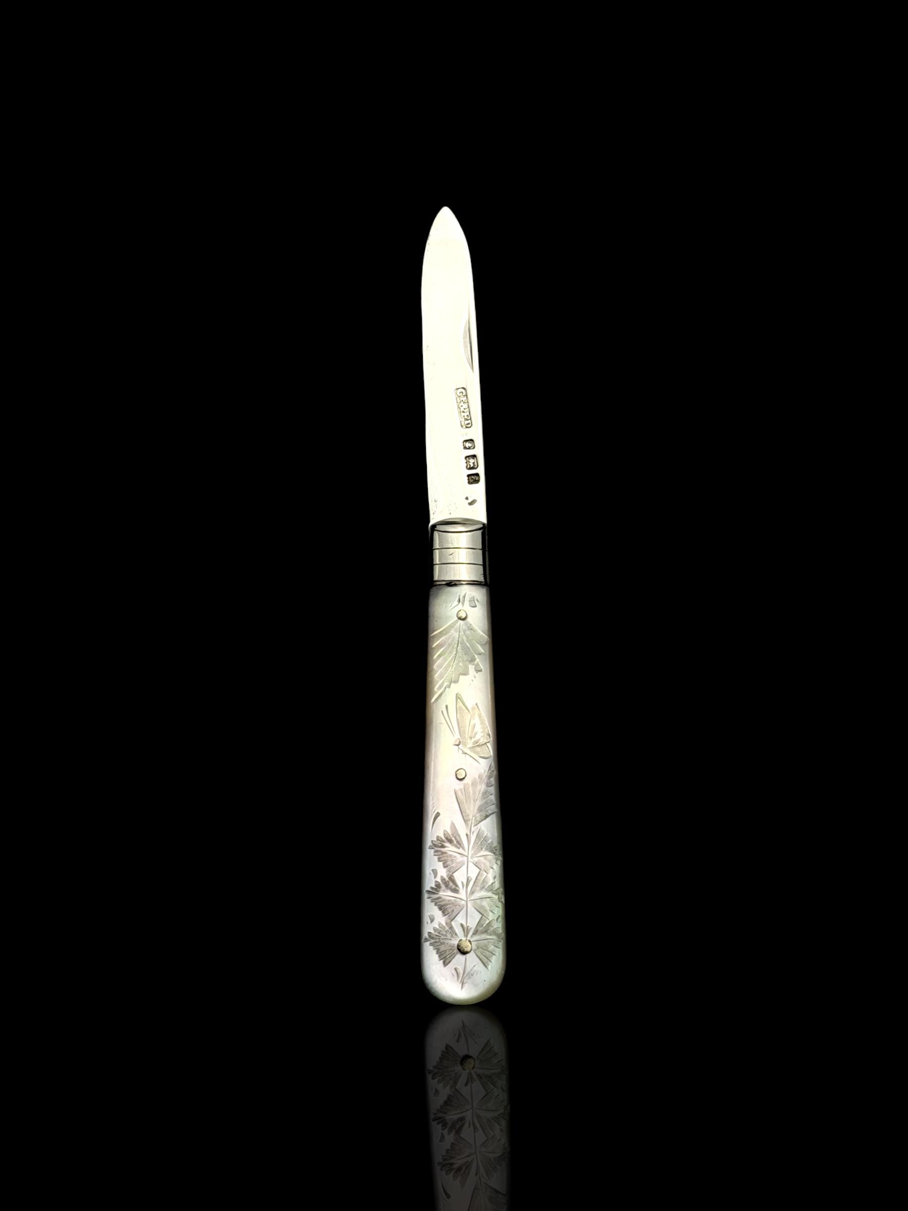 Made by English Silversmith Constantine & Floyd. A standout feature of this knife is it fine condition and the beautifully hand-carved handle featuring a butterfly. It is high quality mother of pearl which almost certainly would have been carved from Australian pearl shell which were exported to England from the 1800s.