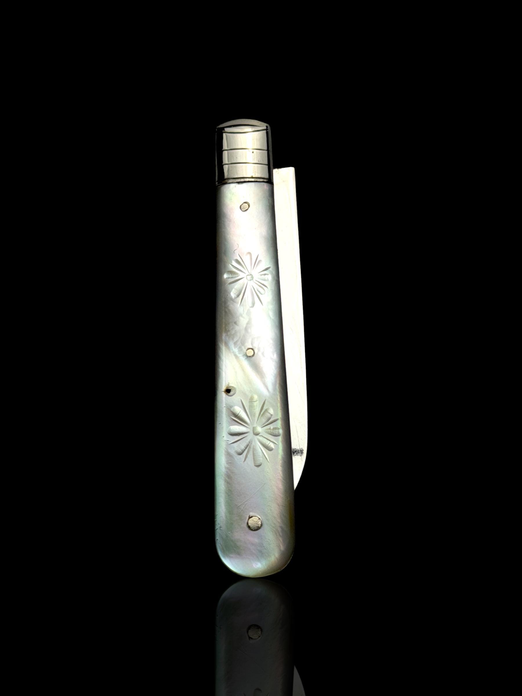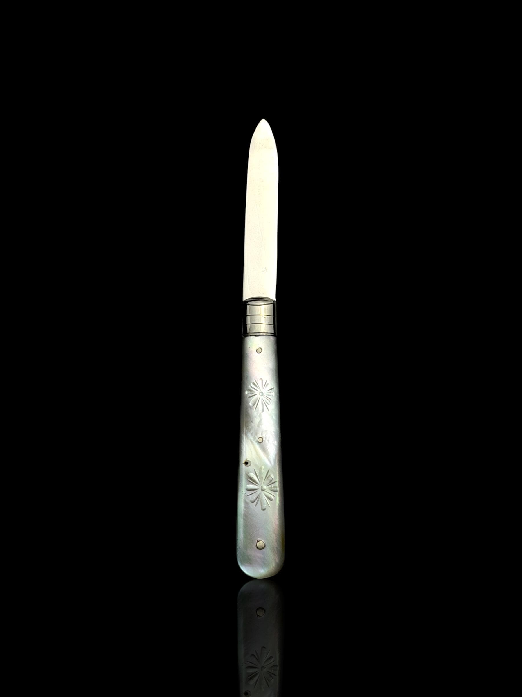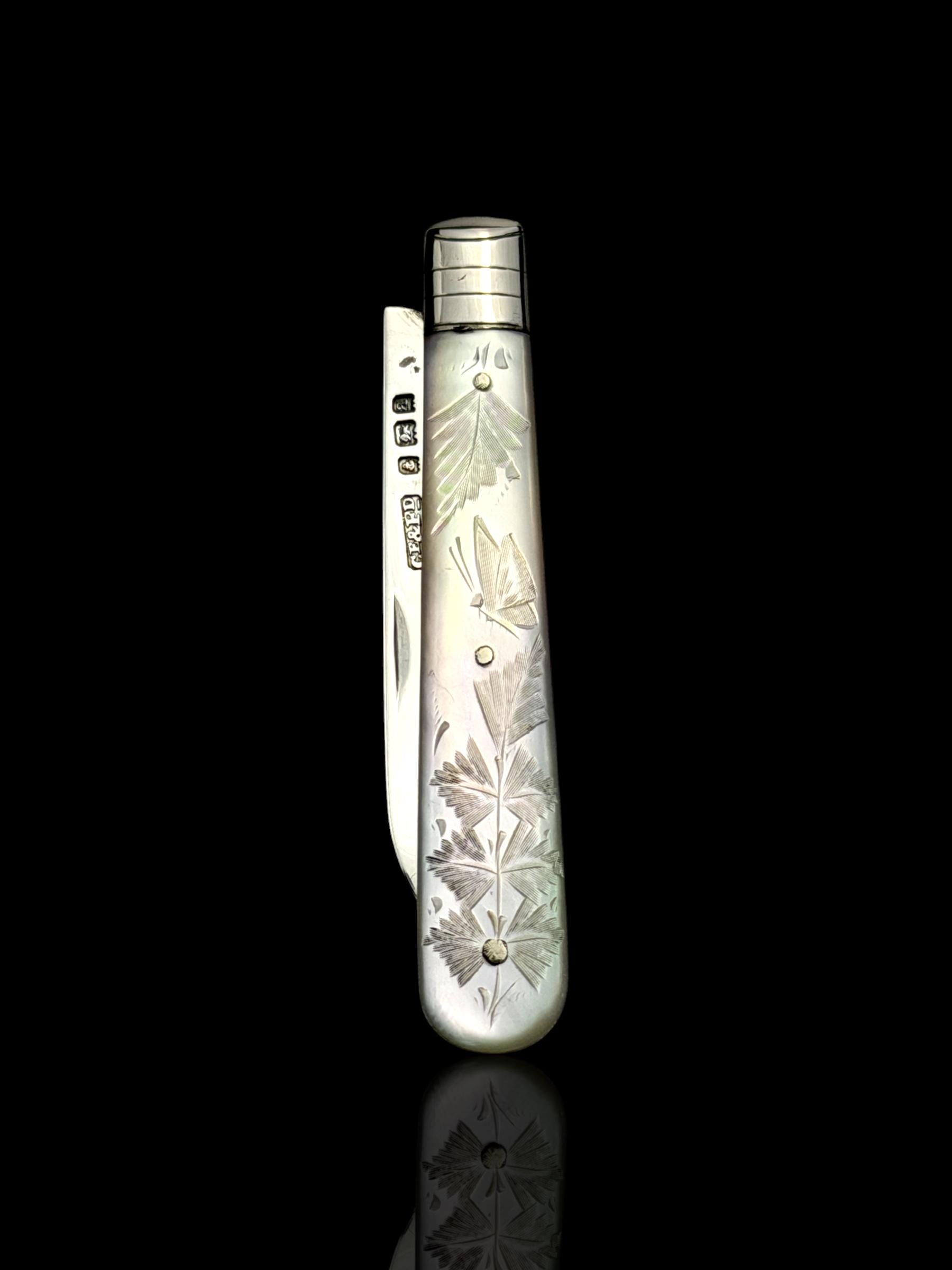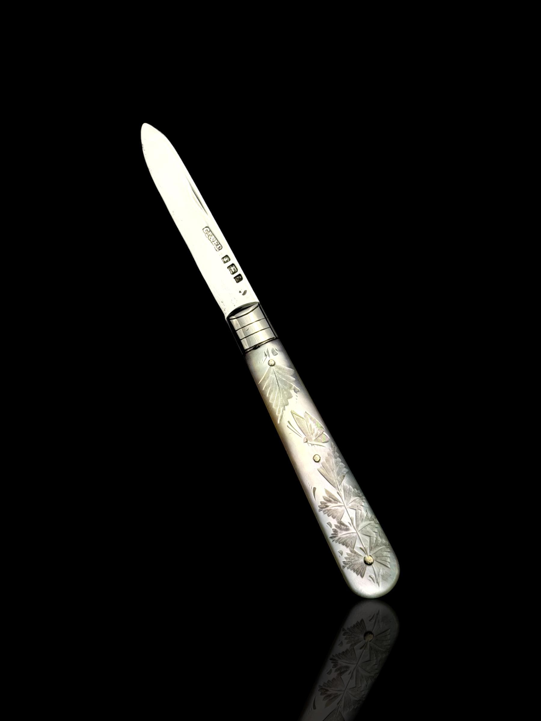Made by English Silversmith Constantine & Floyd. A standout feature of this knife is it fine condition and the beautifully hand-carved handle featuring a butterfly. It is high quality mother of pearl which almost certainly would have been carved from Australian pearl shell which were exported to England from the 1800s.