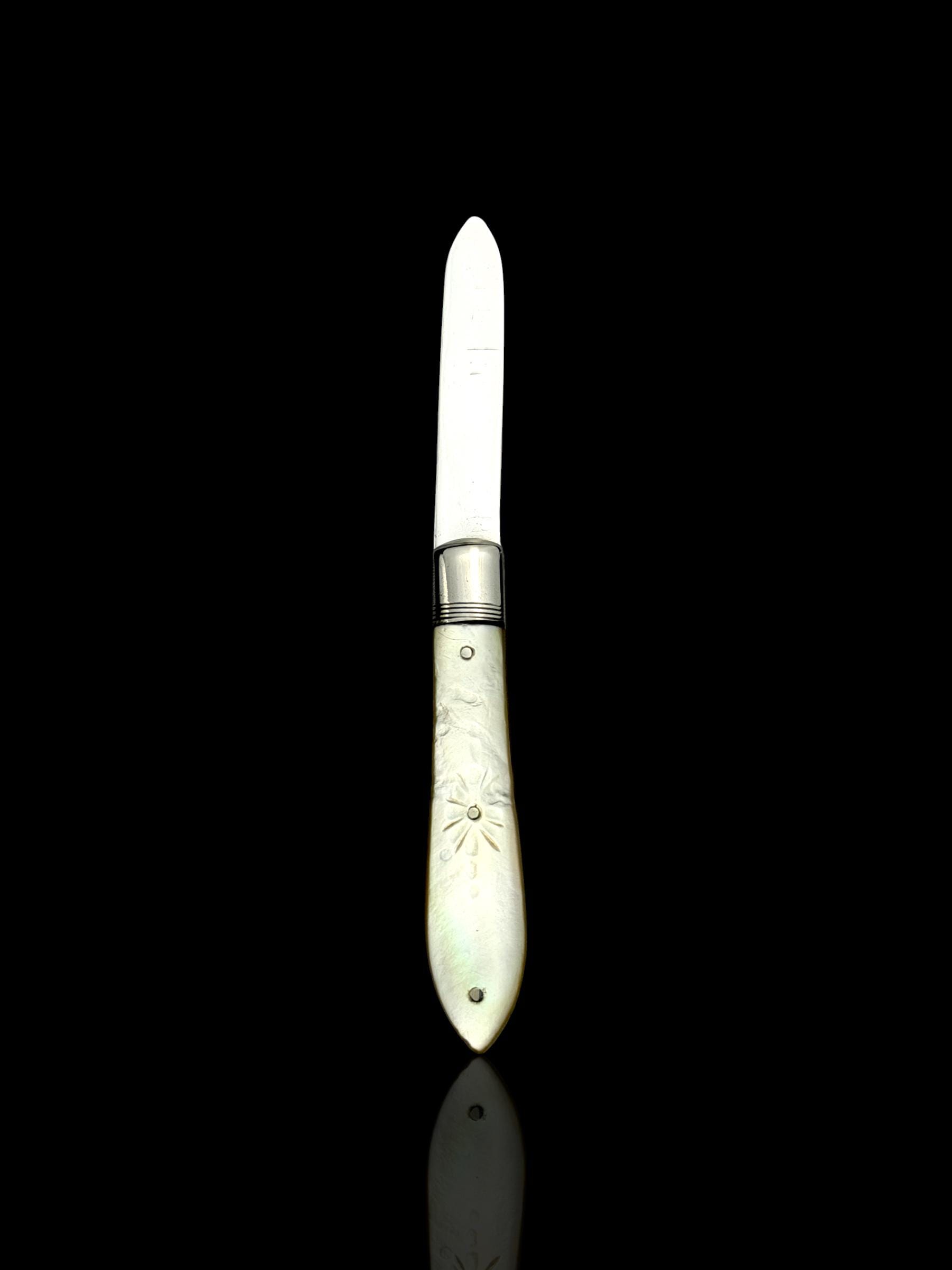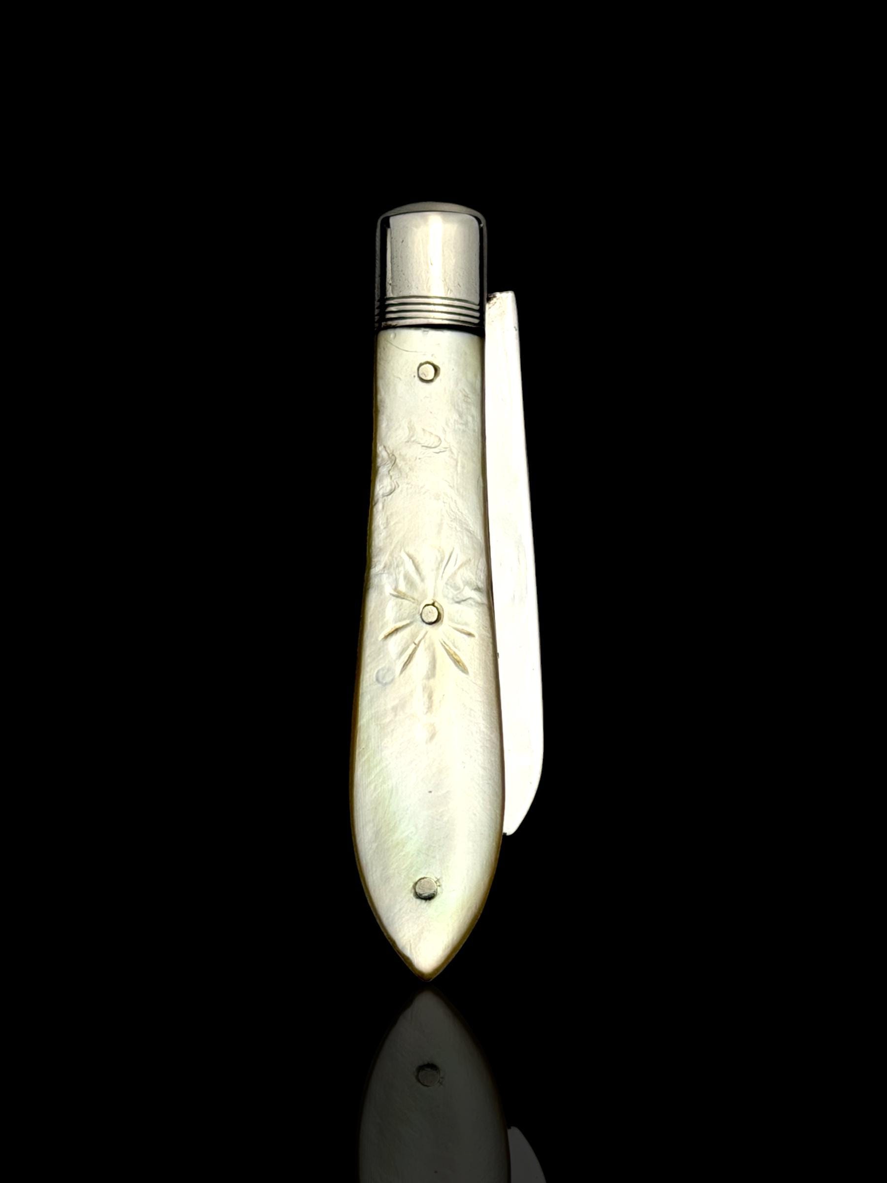 Made by English Silversmith William Needham. The fine condition is the stand out feature of this pocket knife which was made exactly 100 years ago. The hand-carved handle is high quality mother of pearl which almost certainly would have been carved from Australian pearl shell which were exported to England from the 1800s.