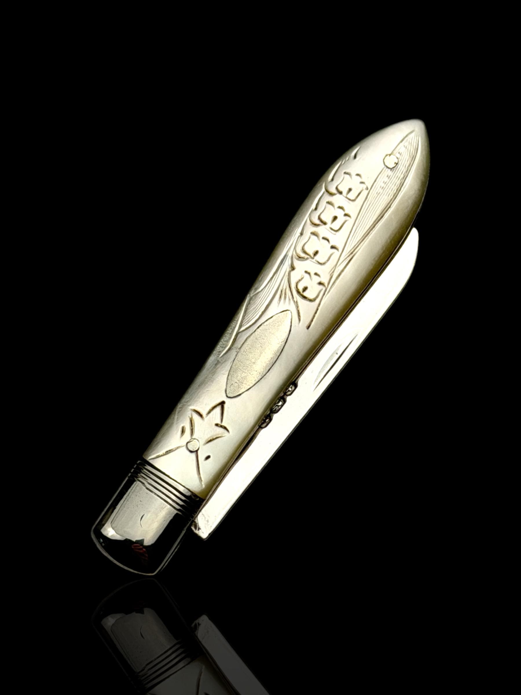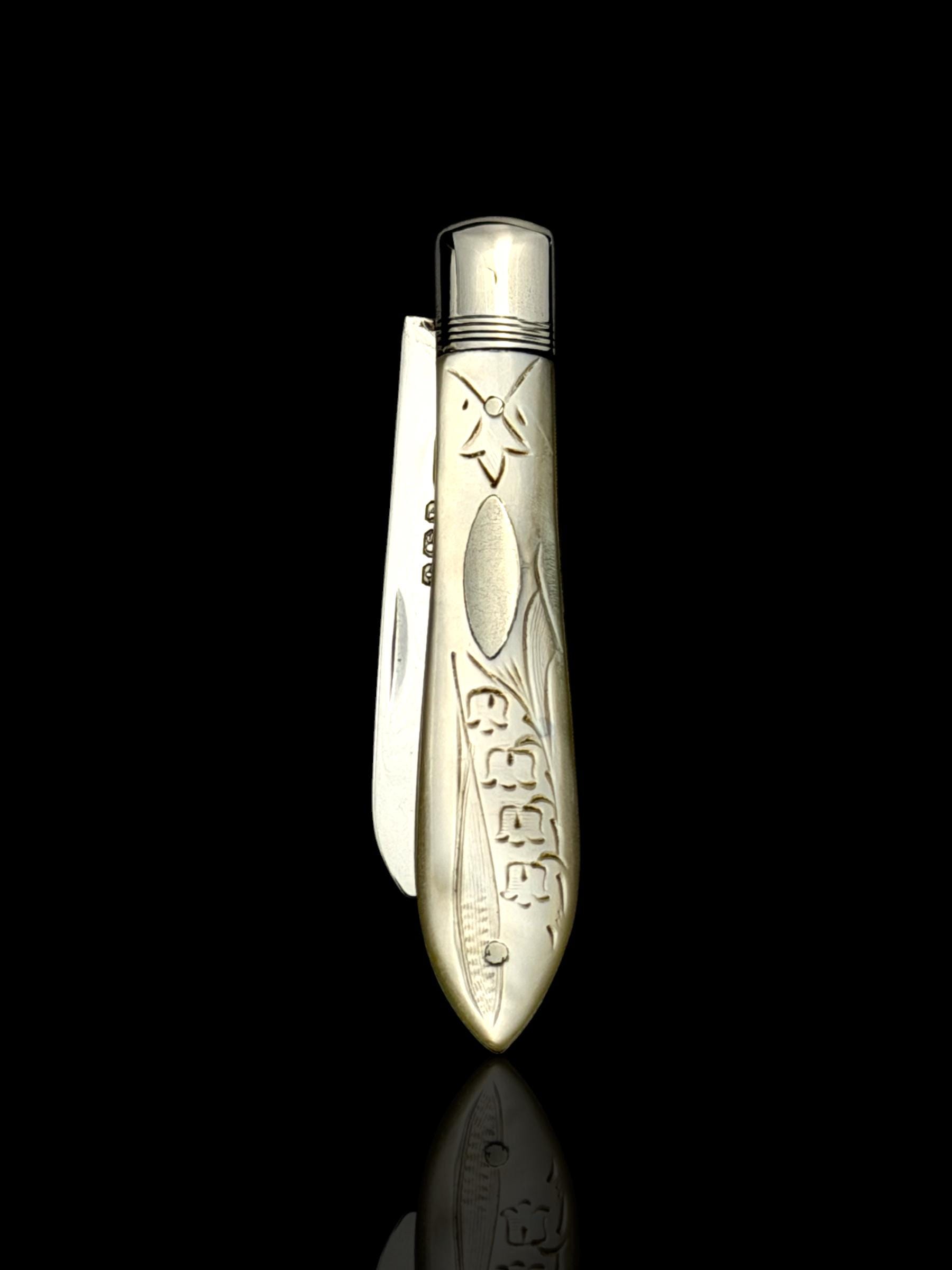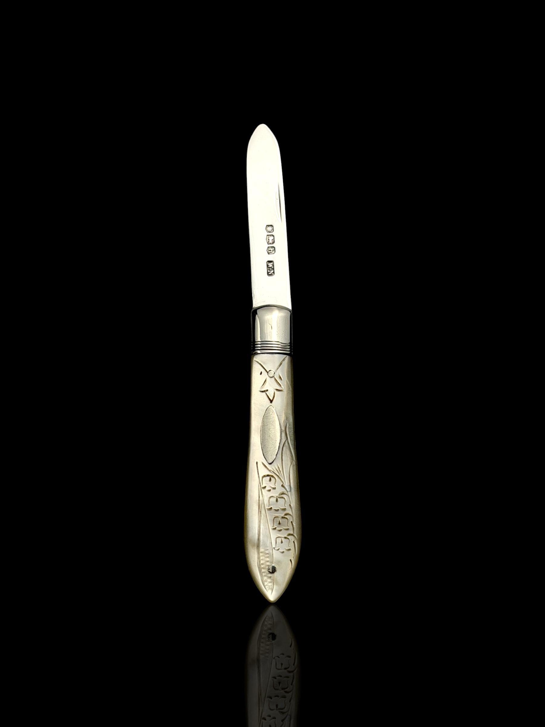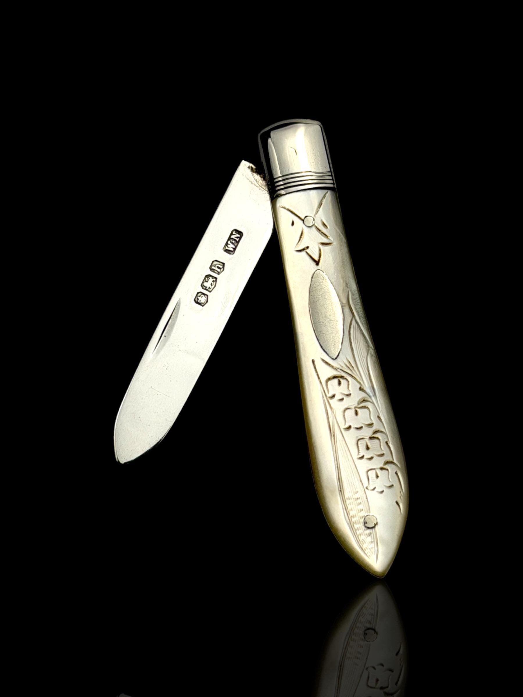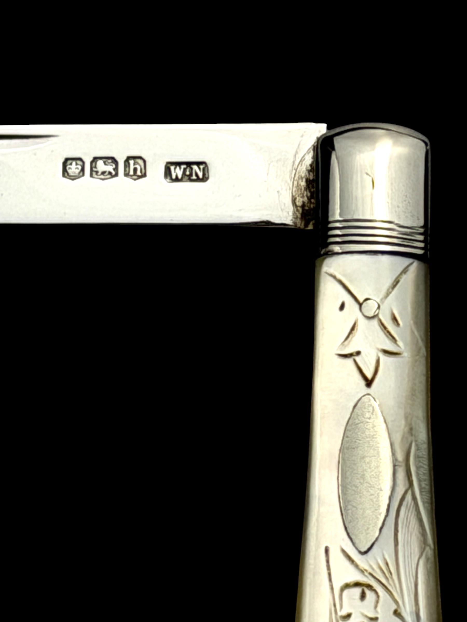 The hallmarks are well-defined and confirm its date, maker and that it is genuine sterling silver; not silver-plate or stainless steel which are obviously significantly cheaper. As the blade is solid silver, which is softer than stainless steel, it cannot be used on hard objects. Such pocket knives would often be carried to cut and peel fruit which is why they are sometime called fruit knives.