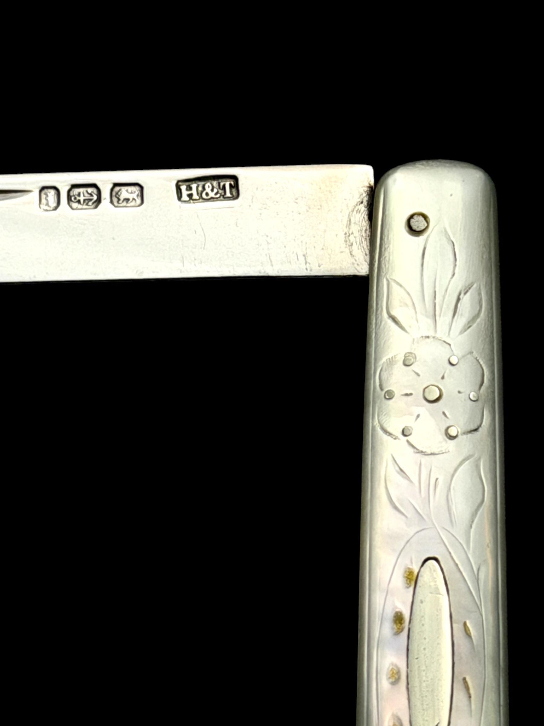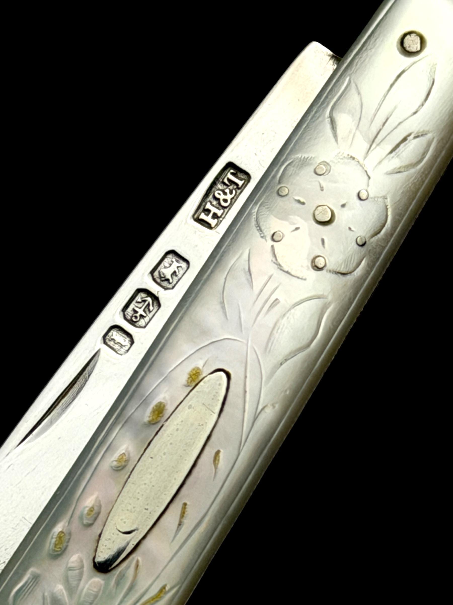 Made by English Silversmith Hilliard & Thomoson. A elegantly designed piece. The hand-carved handle is high quality mother of pearl which almost certainly would have been carved from Australian pearl shell which were exported to England from the 1800s.