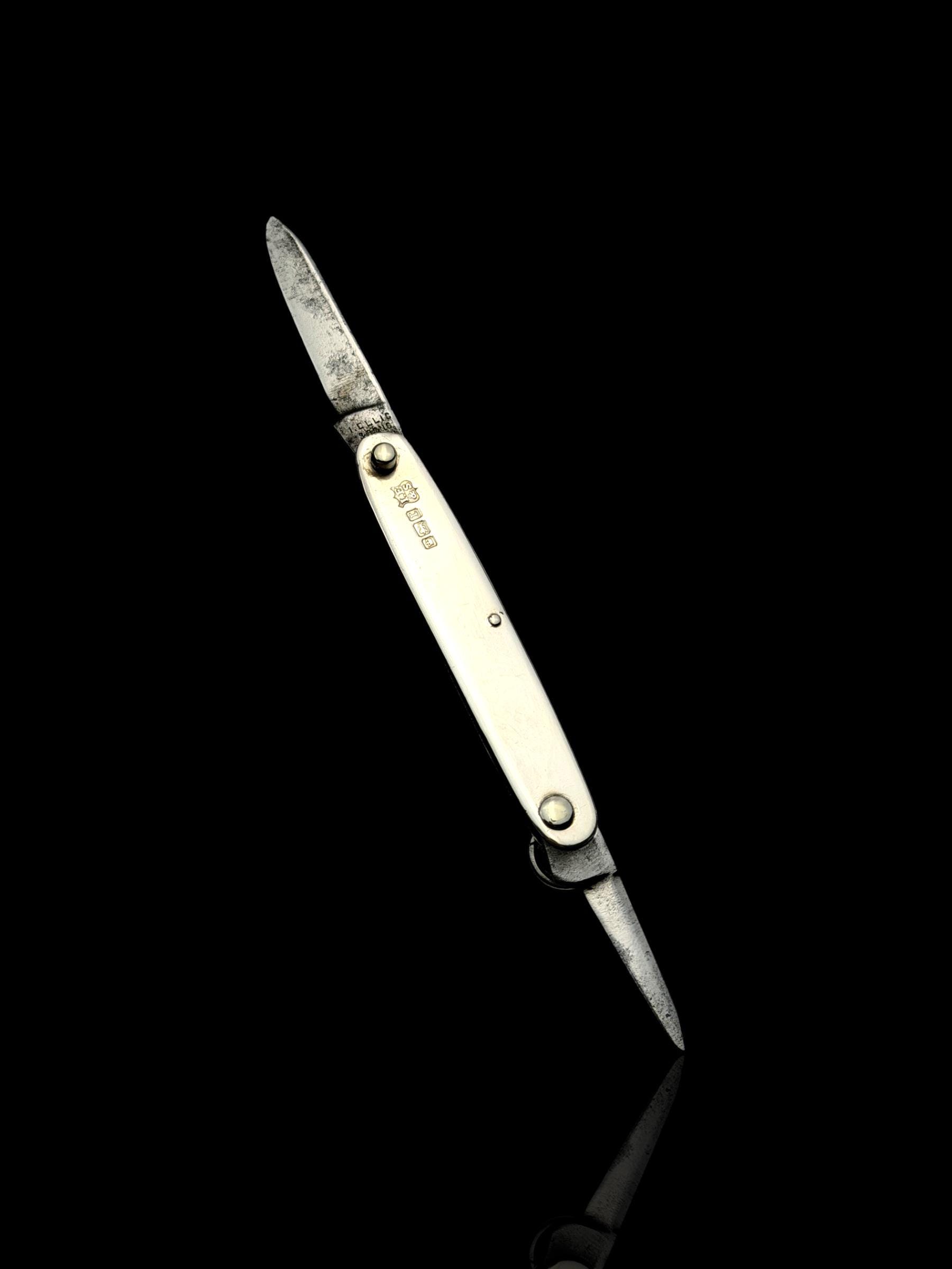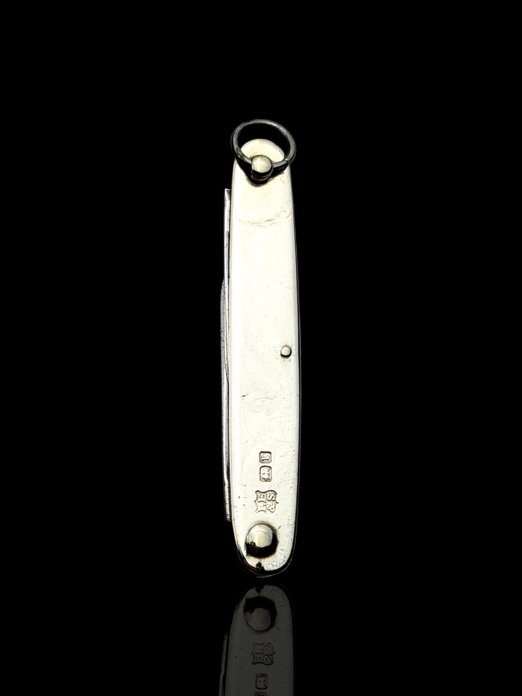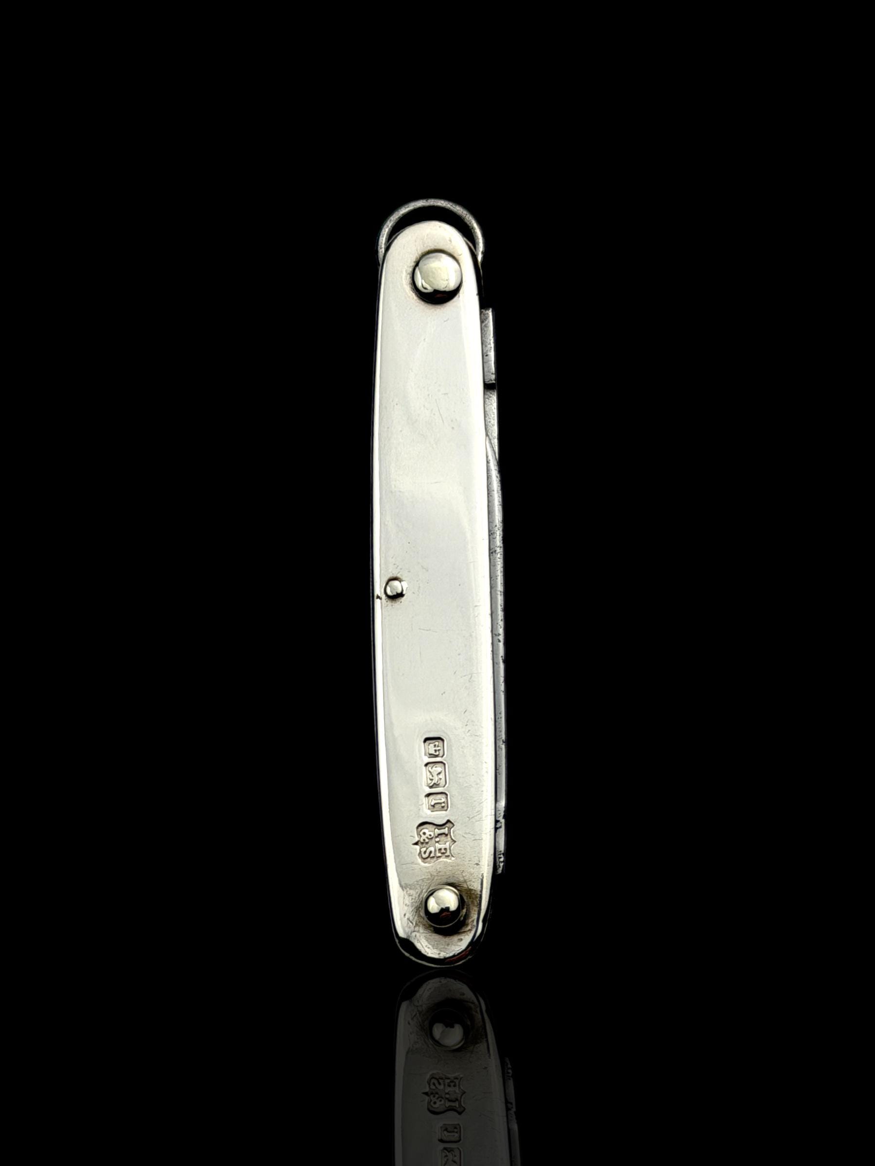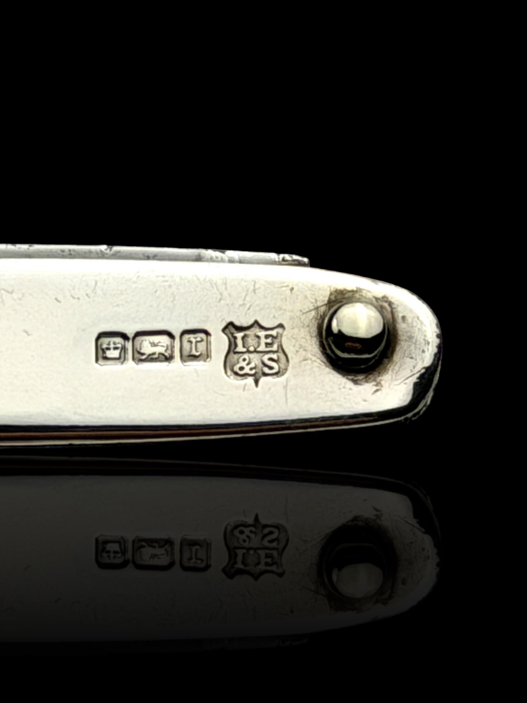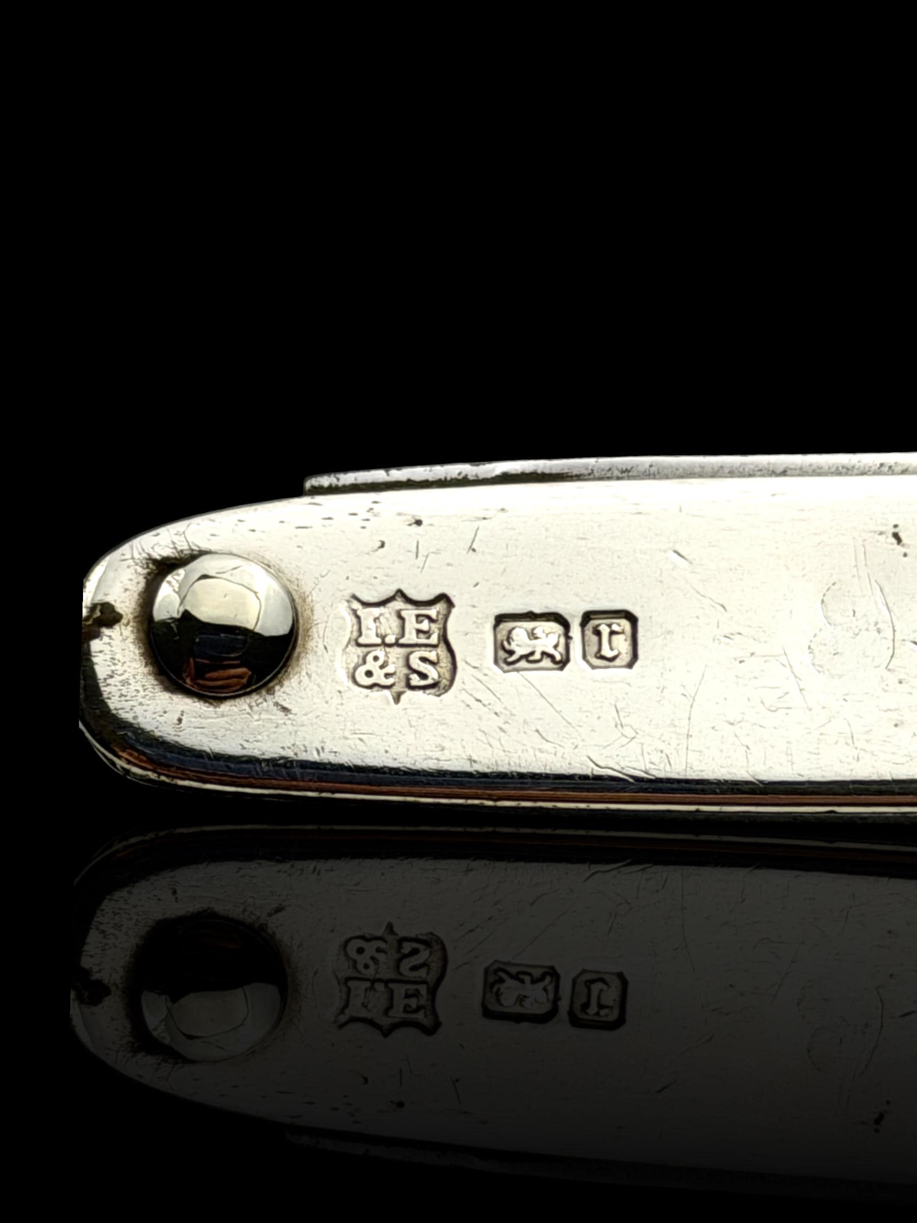 The hallmarks are well-defined and confirm its date, maker and that it is a genuine sterling silver handle on both side of the knife. The blades are steel which are much harder than silver but are also prone to rust damage over the course of the century since is was made.