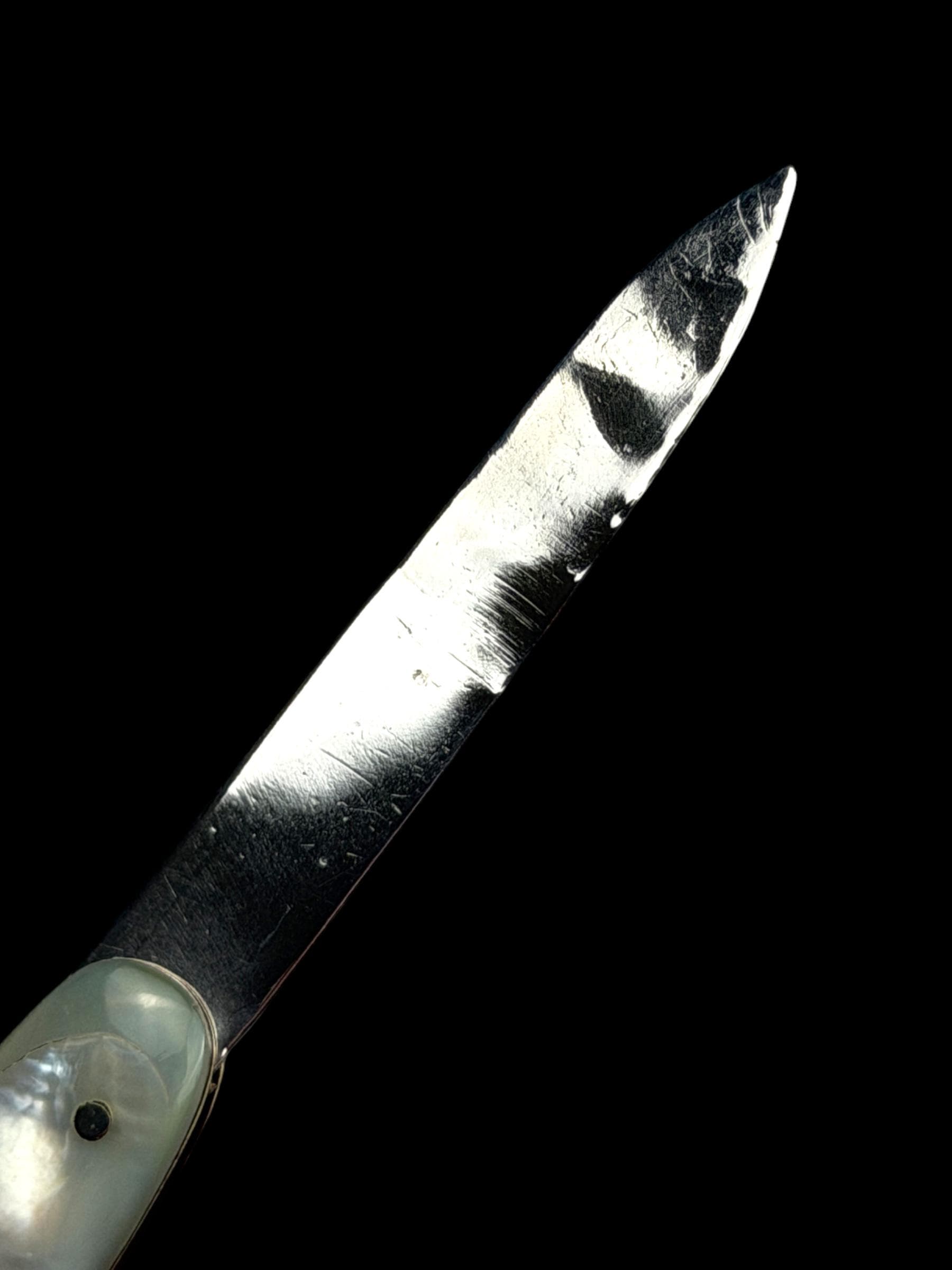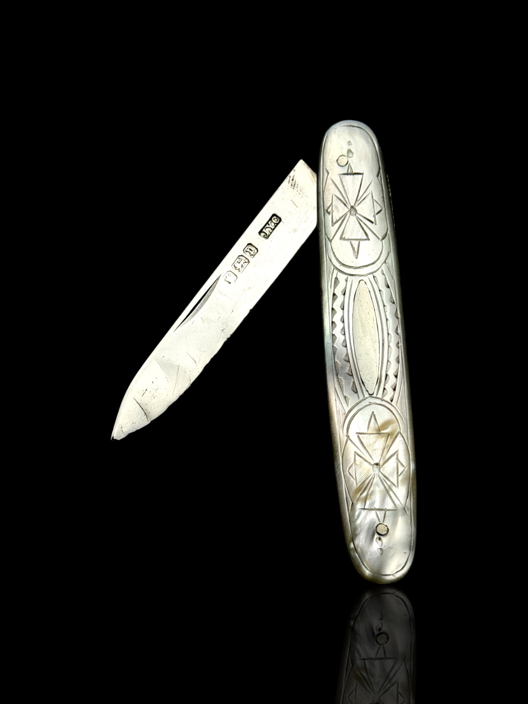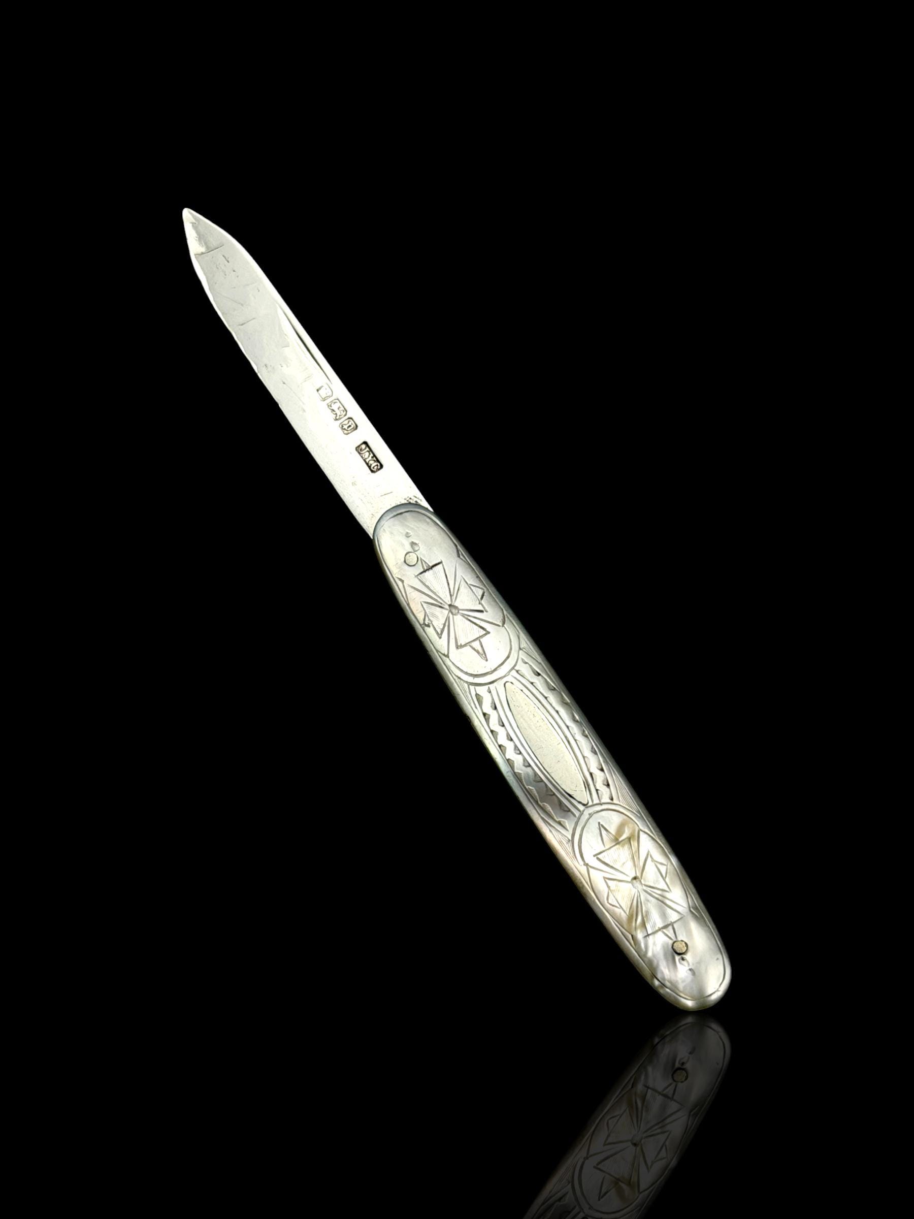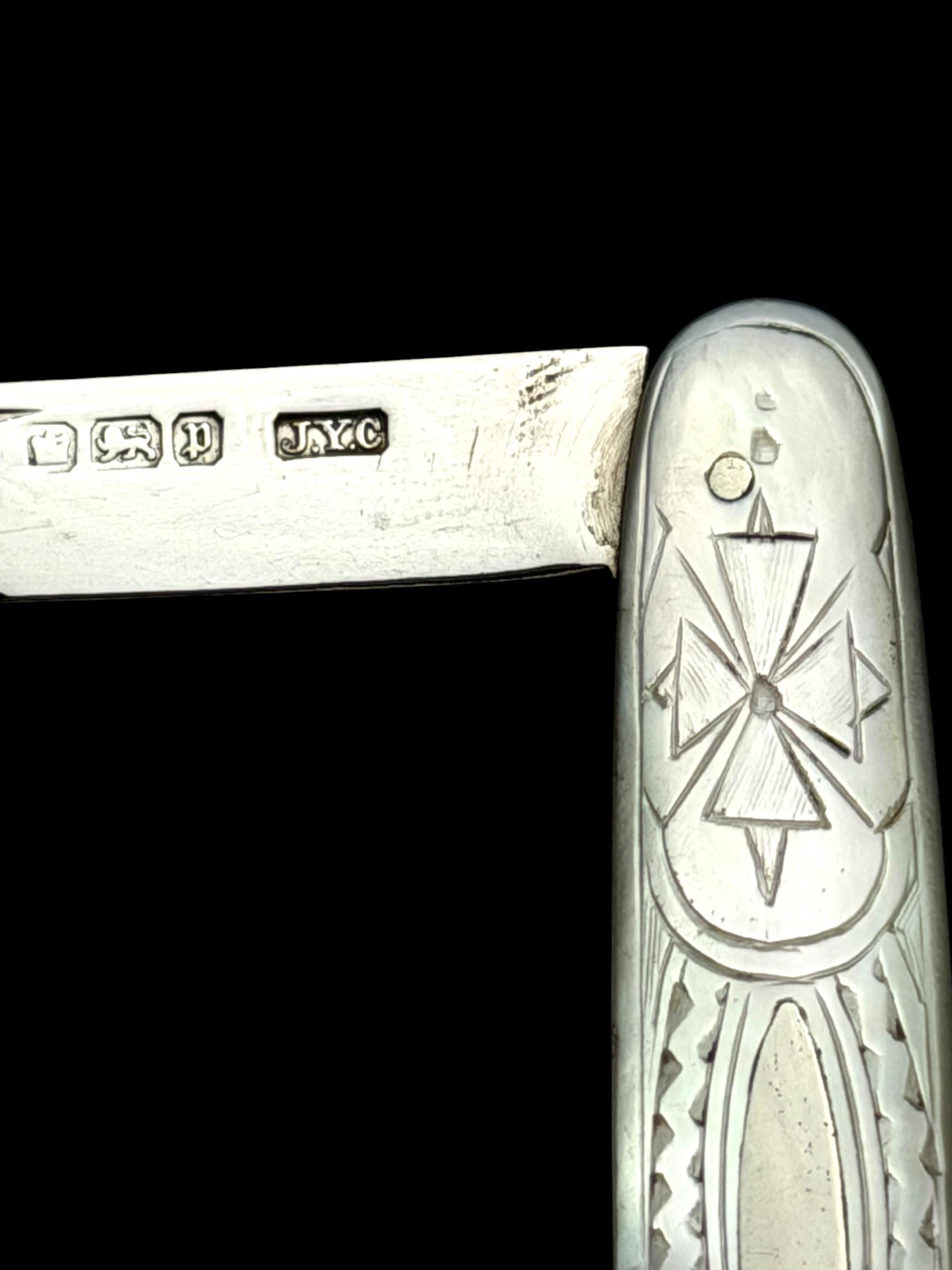 The hallmarks are well-defined and confirm its date, maker and that it is genuine sterling silver; not silver-plate or stainless steel which are obviously significantly cheaper. As the blade is solid silver, which is softer than stainless steel, it cannot be used on hard objects. Such pocket knives would often be carried to cut and peel fruit which is why they are sometime called fruit knives.