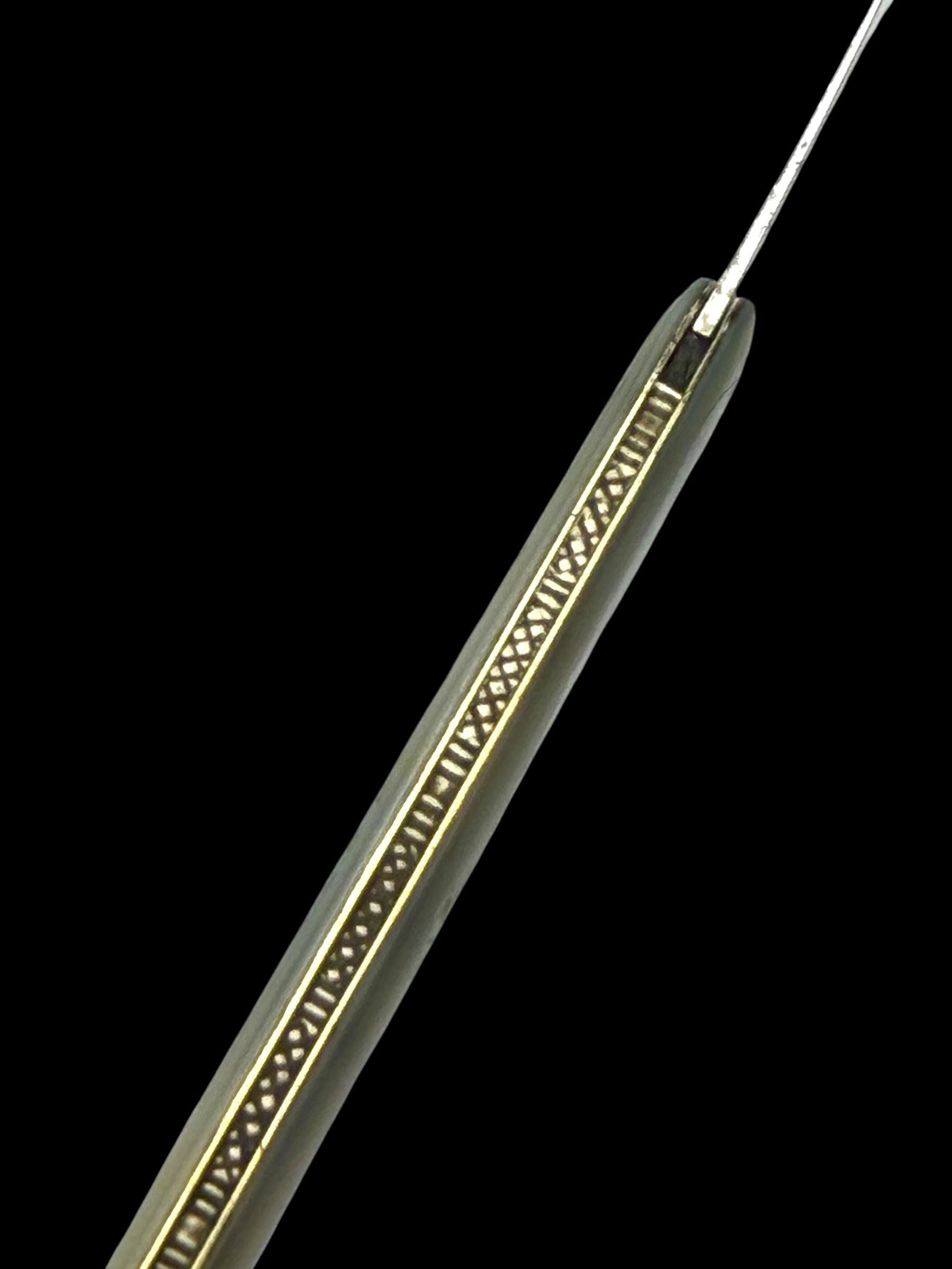 The action is nice and tight and the blade straight with the handle when open and flush when closed. The blade is has a number of bends which although somewhat subtle by degrees of variation, are really very obvious in the way the light interacts with each bend. Is it therefore discounted accordingly. The knife is 115mm in length when open.