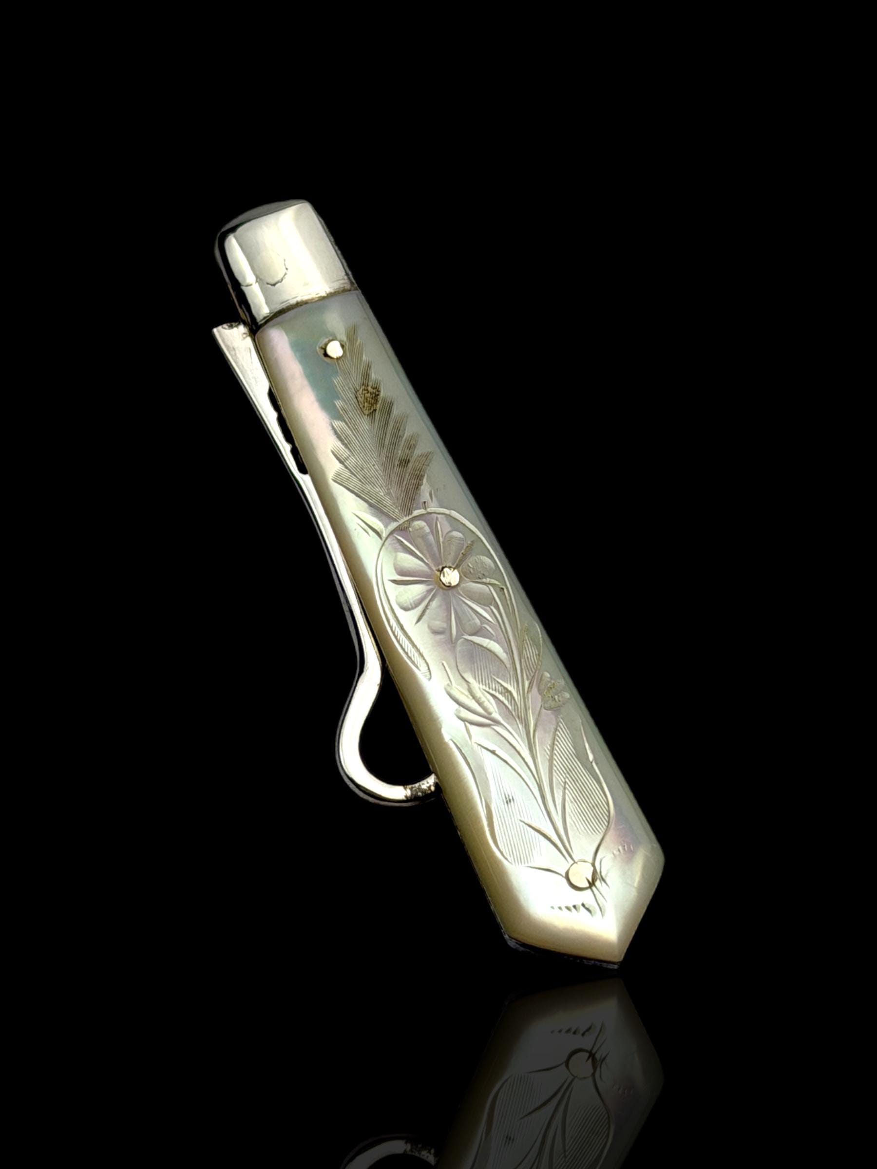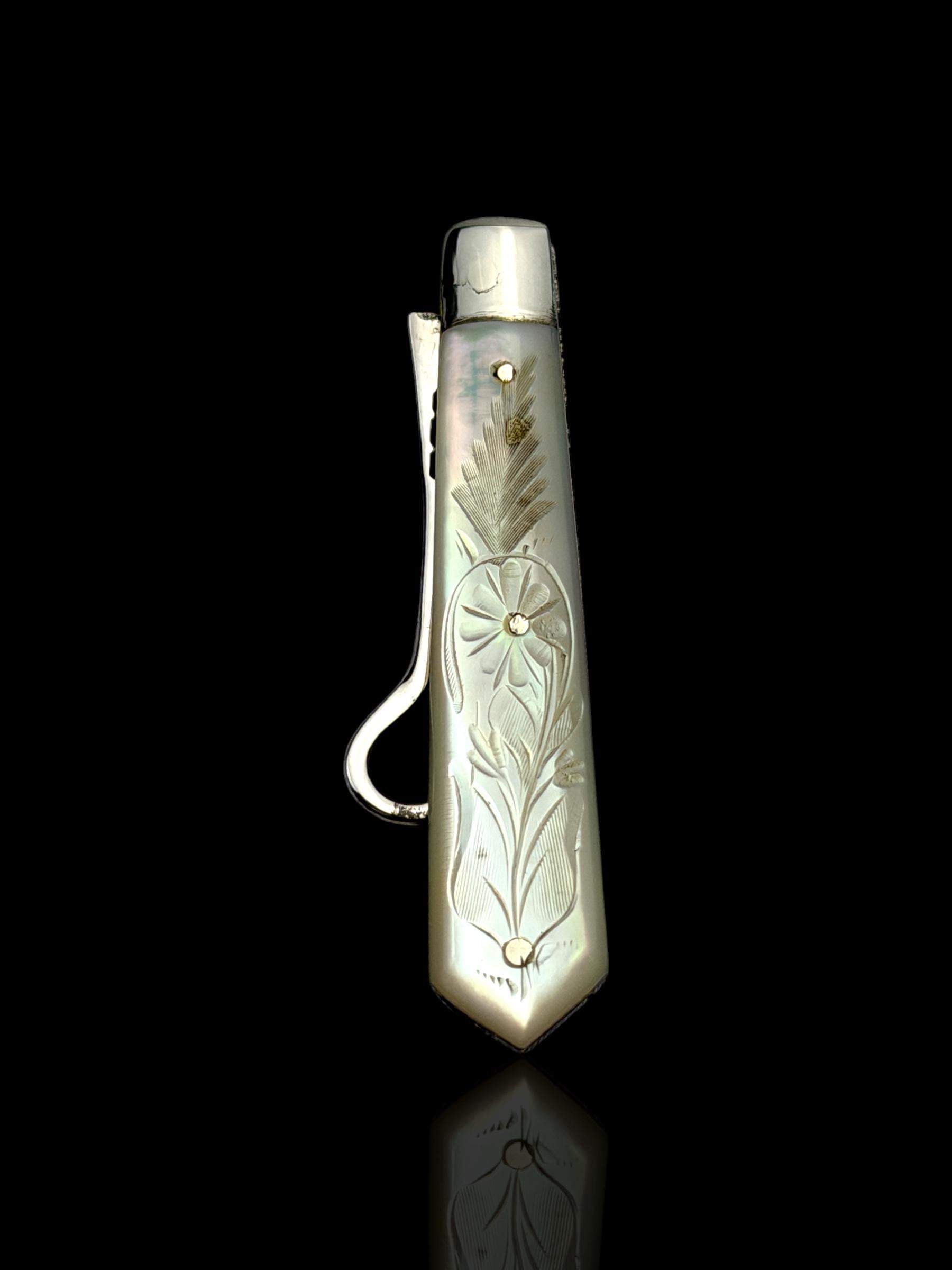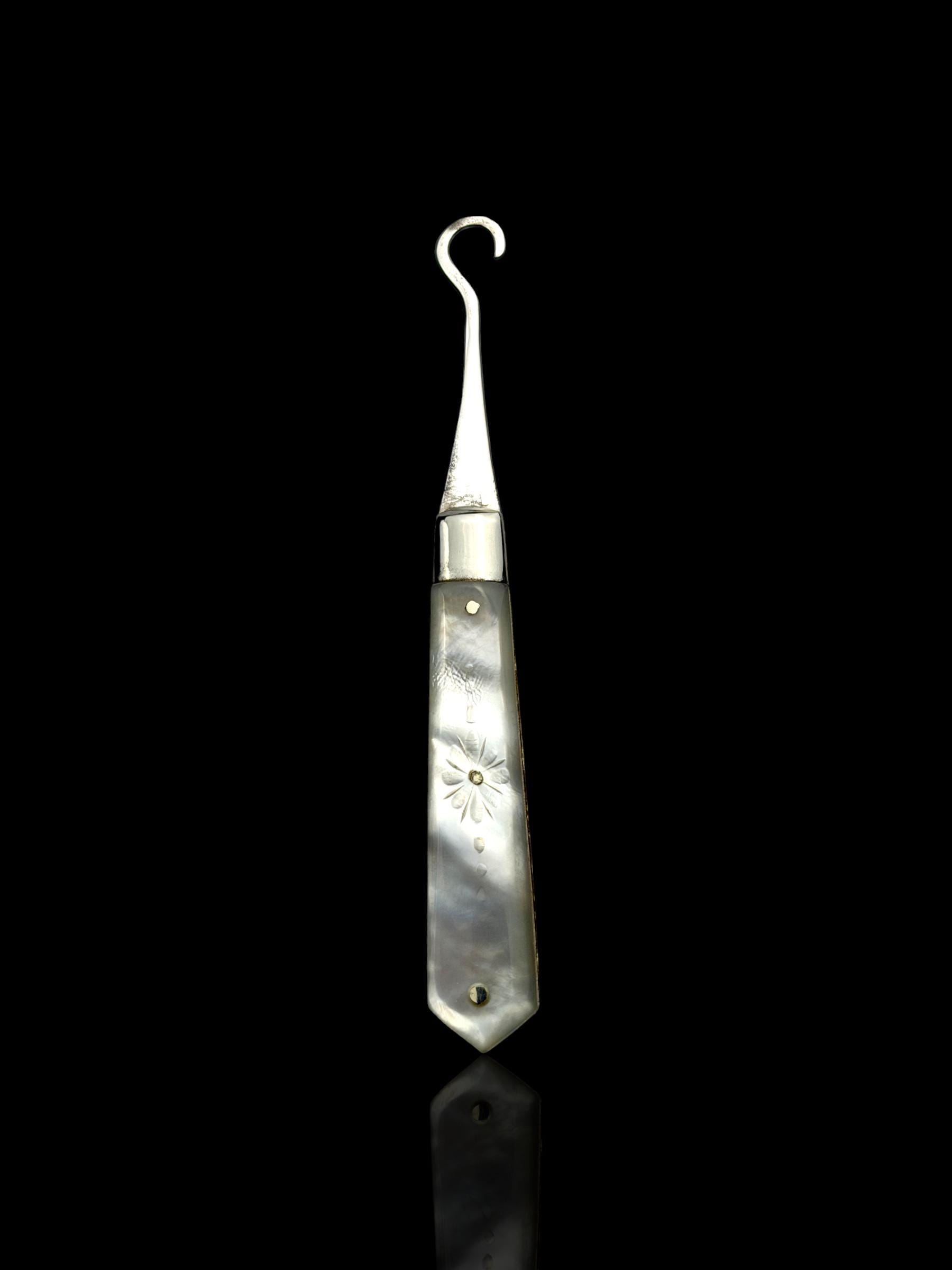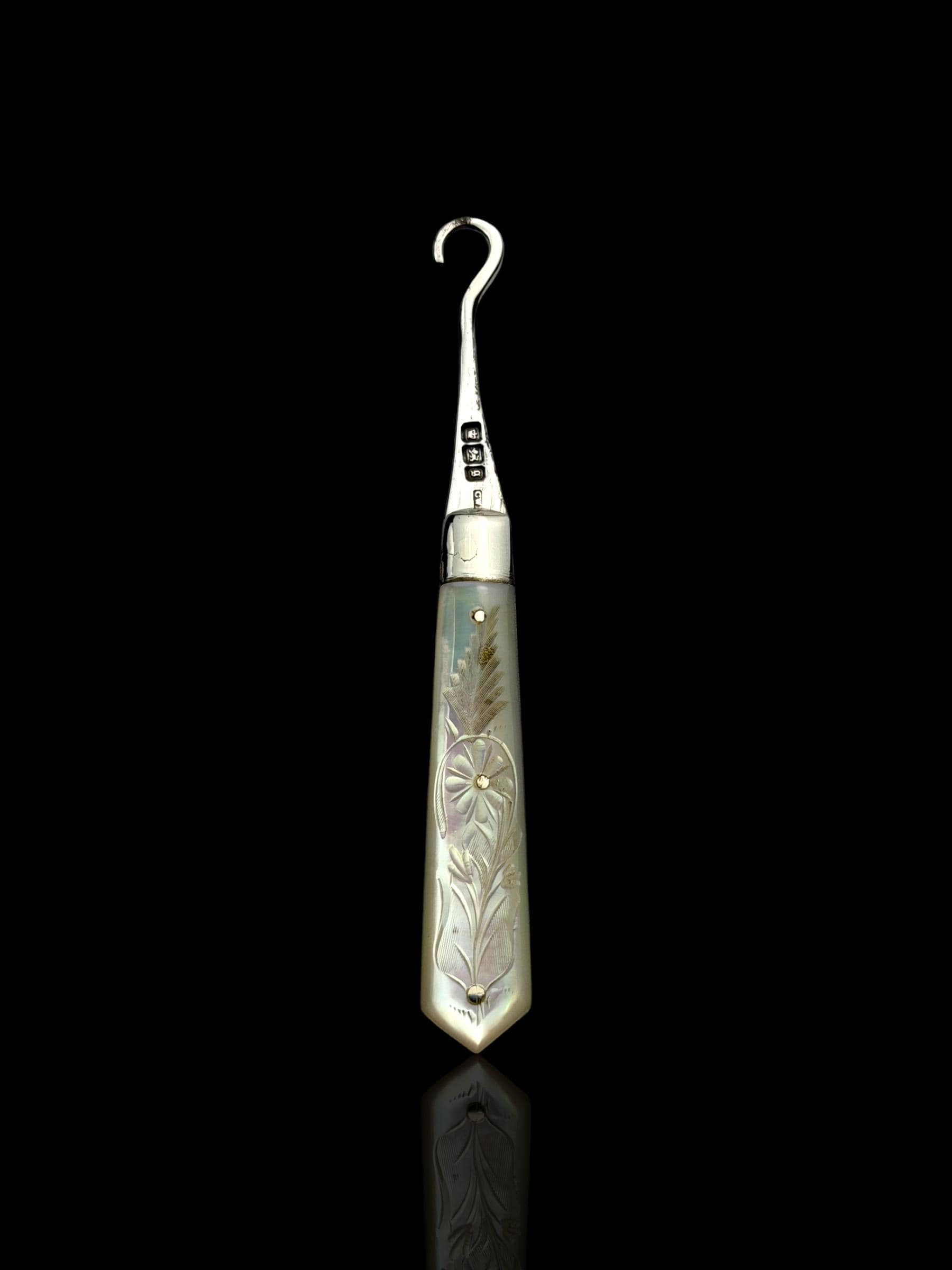Made by English Silversmith Charles William Fletcher. A rare button hook made with silver rather than steel. The hand-carved handle is high quality mother of pearl which almost certainly would have been carved from Australian pearl shell which were exported to England from the 1800s.