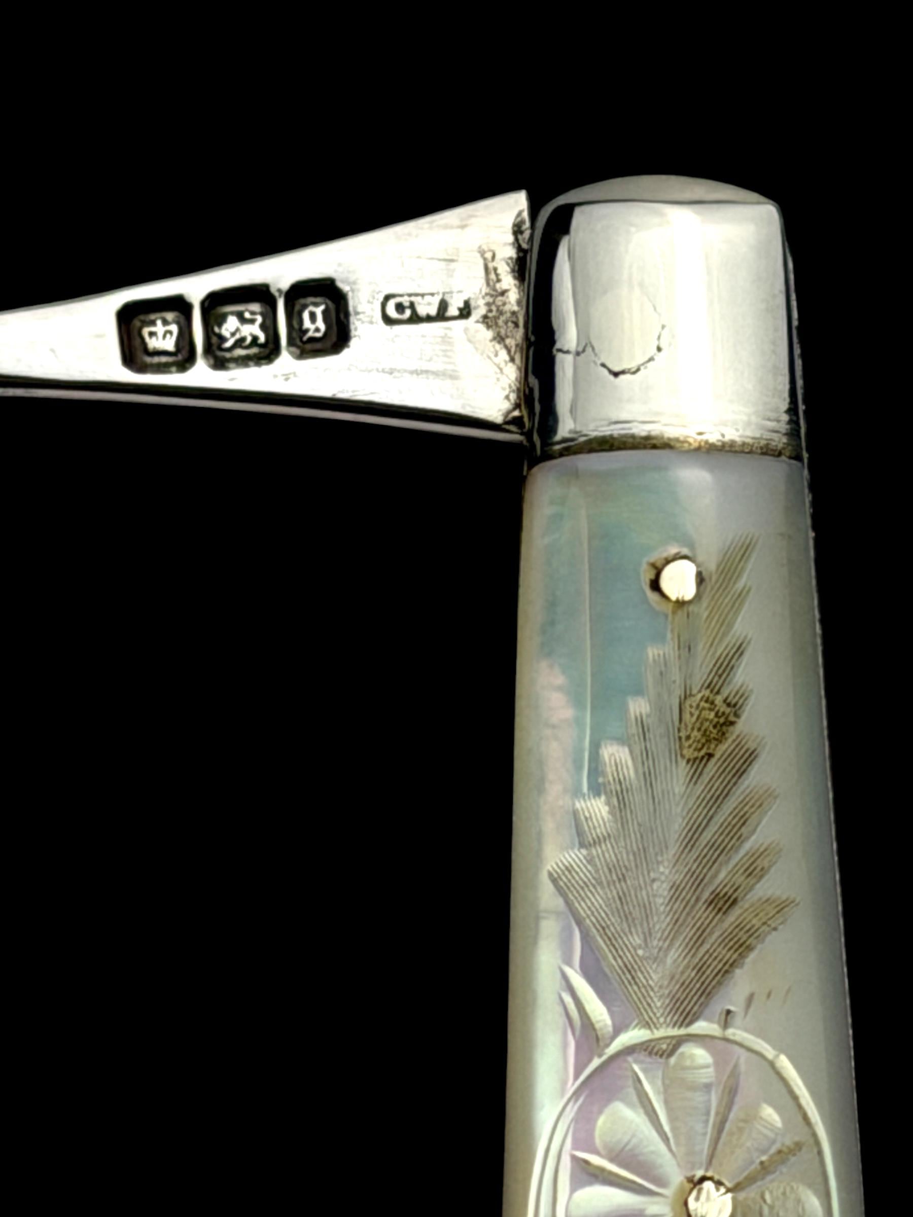 The hallmarks are well-defined and confirm its date, maker and that it is genuine sterling silver; not silver-plate or stainless steel which are obviously significantly cheaper. As the blade is solid silver, which is softer than stainless steel, it cannot be used on hard objects.