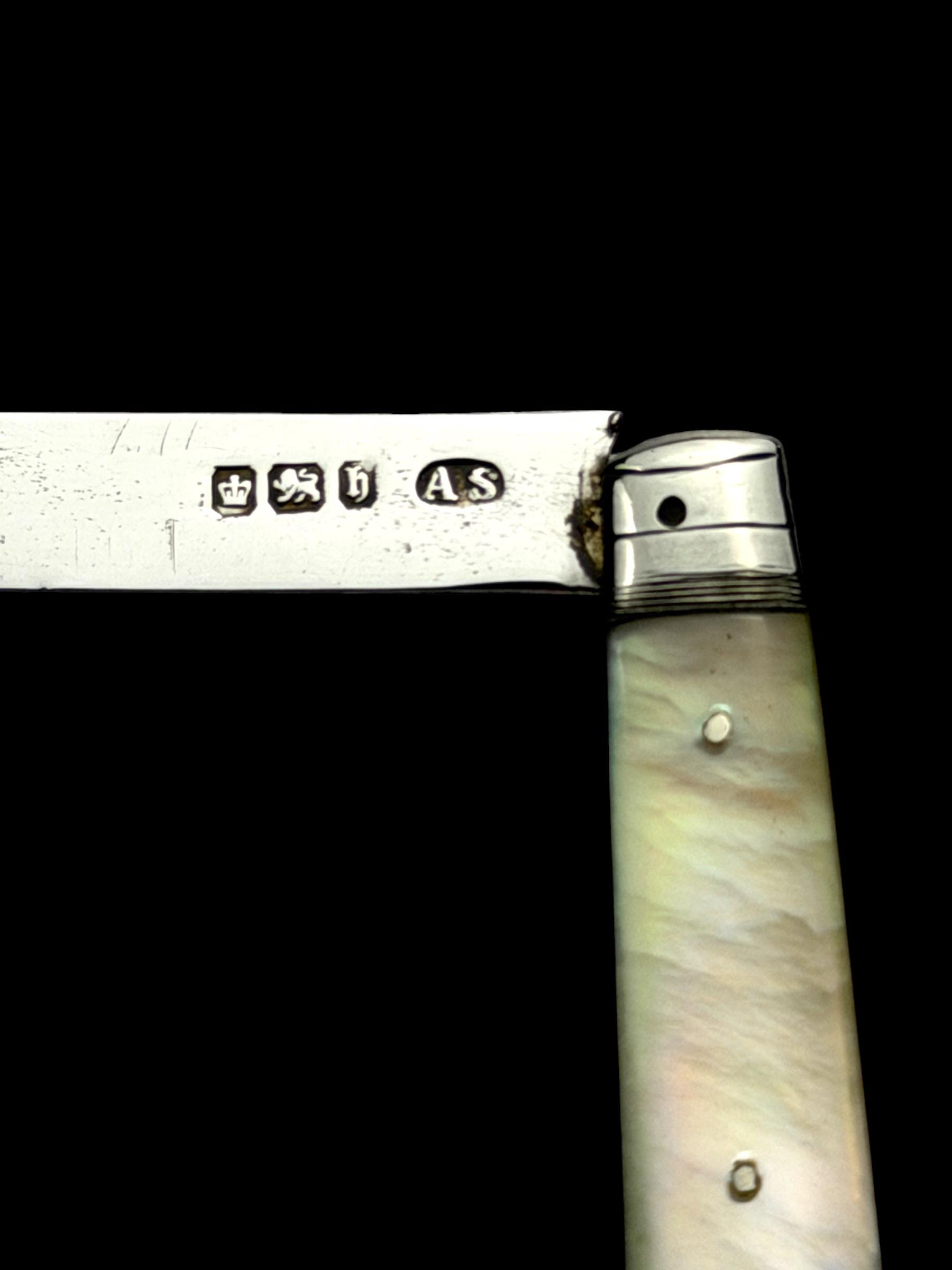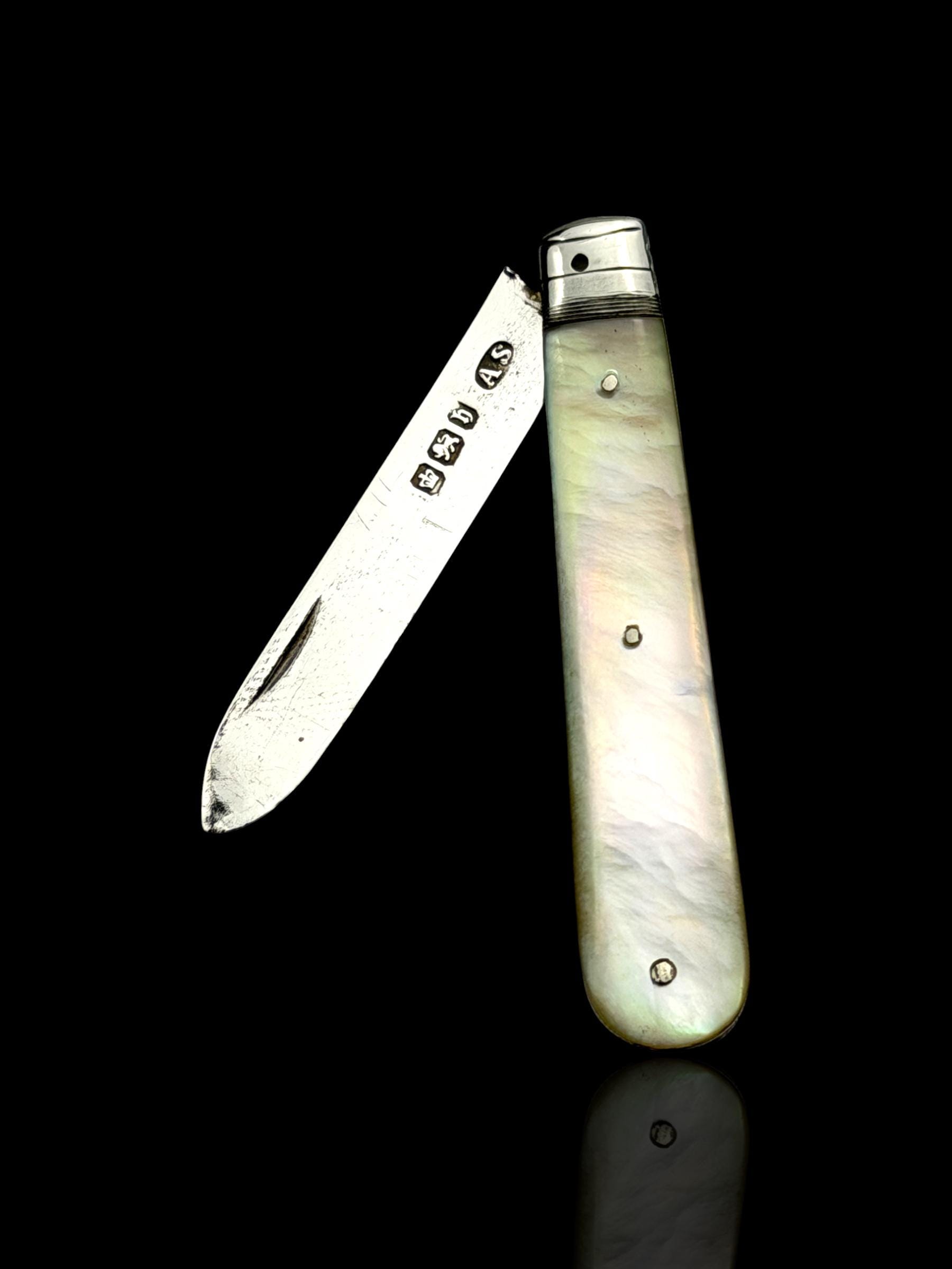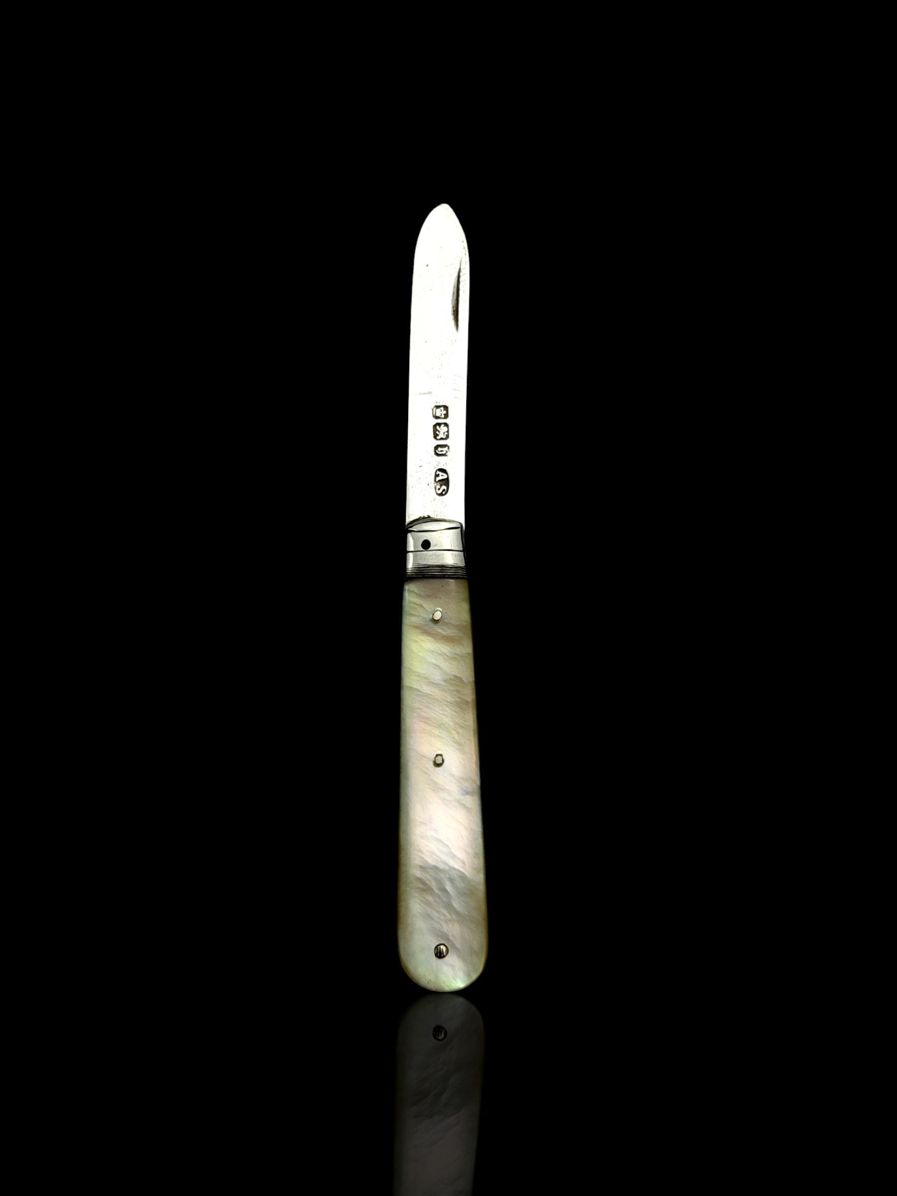 The hallmarks are well-defined and confirm its date, maker and that it is genuine sterling silver; not silver-plate or stainless steel which are obviously significantly cheaper. As the blade is solid silver, which is softer than stainless steel, it cannot be used on hard objects. Such pocket knives would often be carried to cut and peel fruit which is why they are sometime called fruit knives.