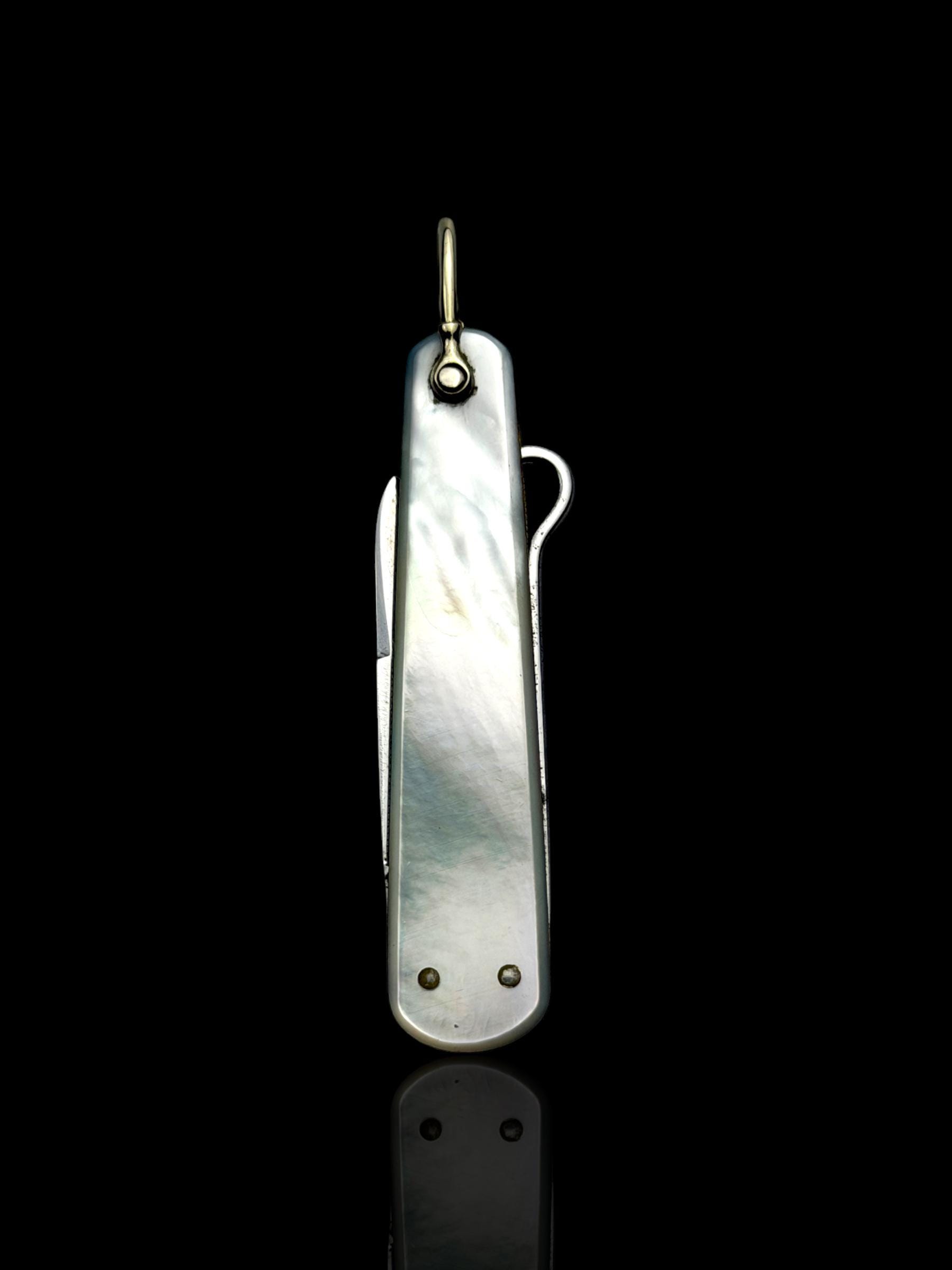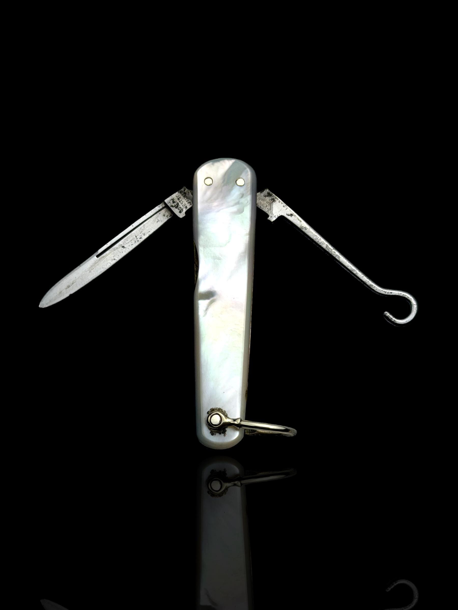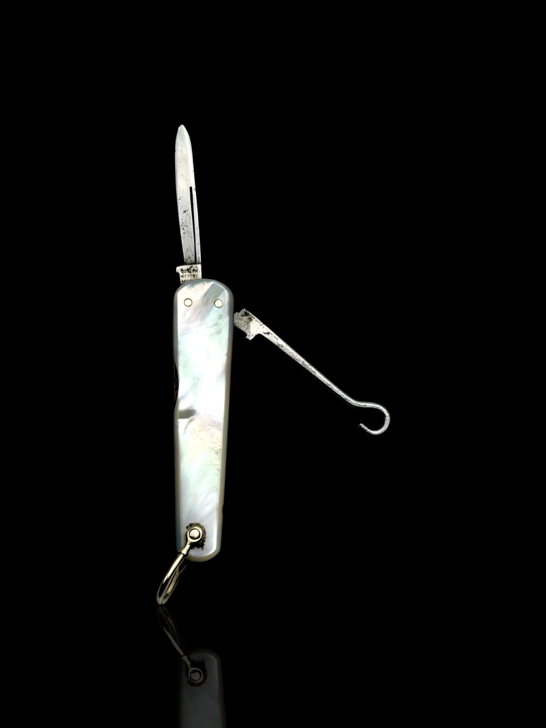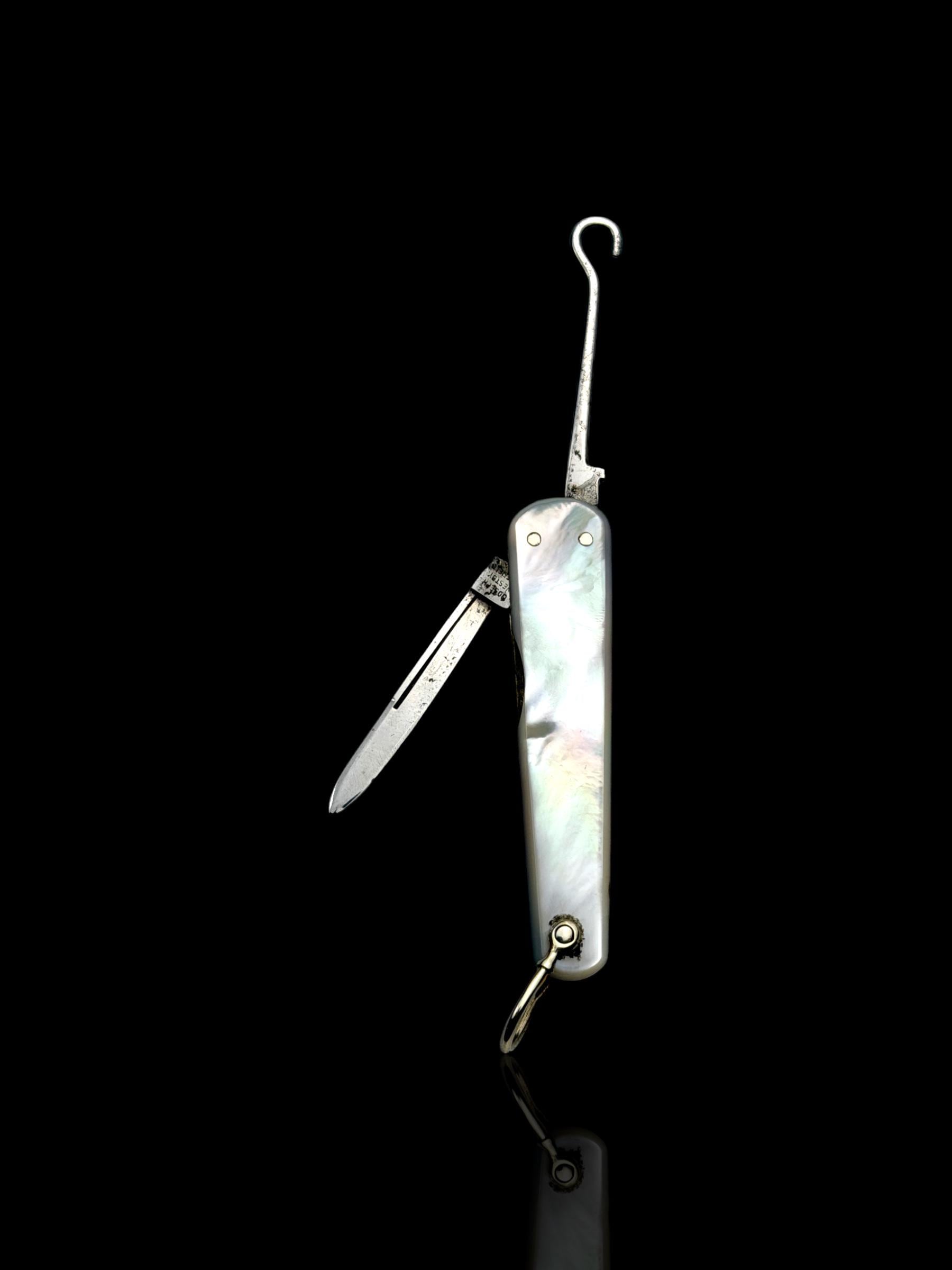 The thin blade and button hook are stainless steel and therefore lack the hallmarks required on silver blades. The exact date of manufacture and the maker is therefore unknown. However, it would have been produced in England in the early 1900s. The advantage of stainless steel is that it is much harder than silver and is able to maintain a sharper edge.