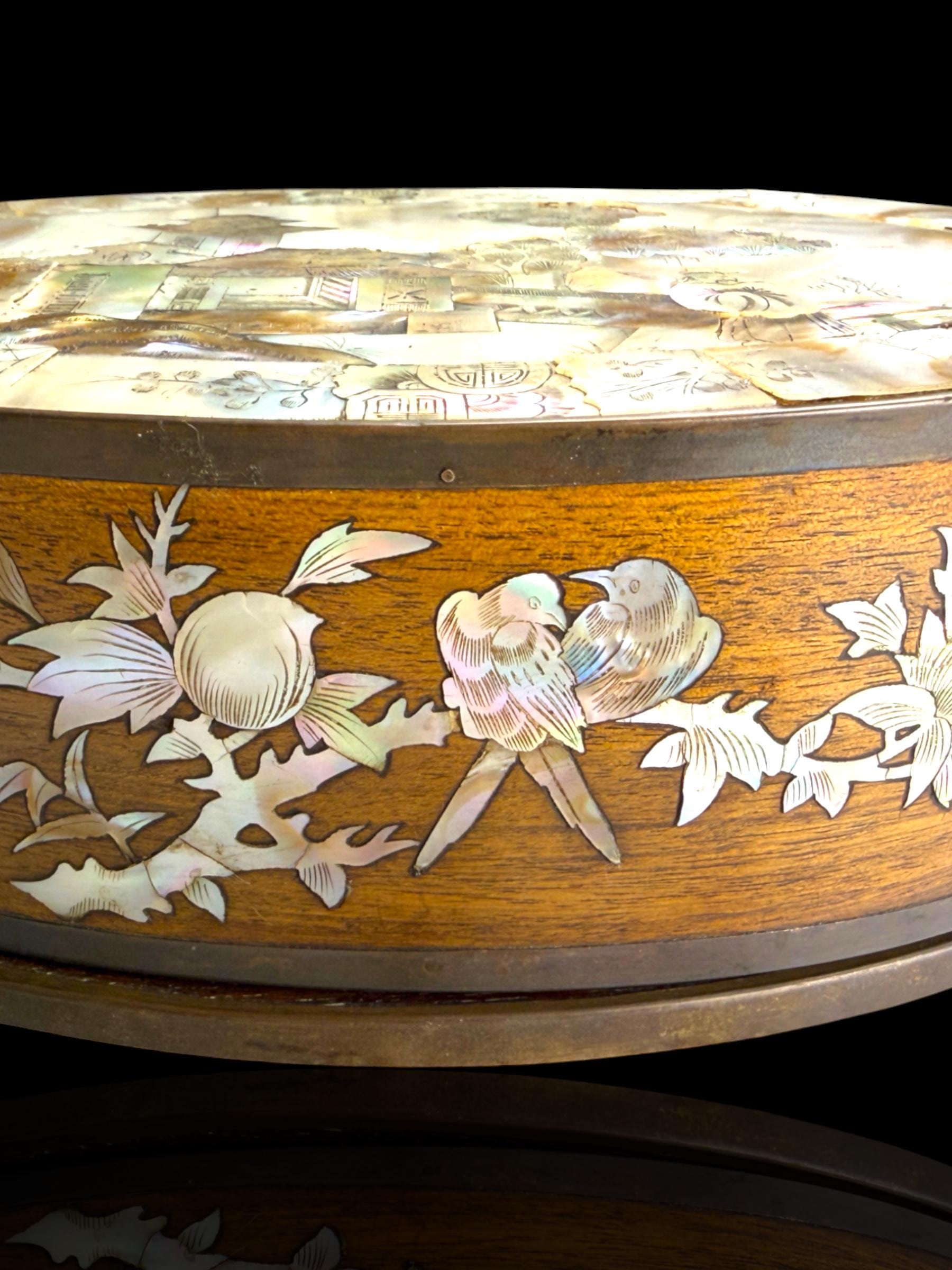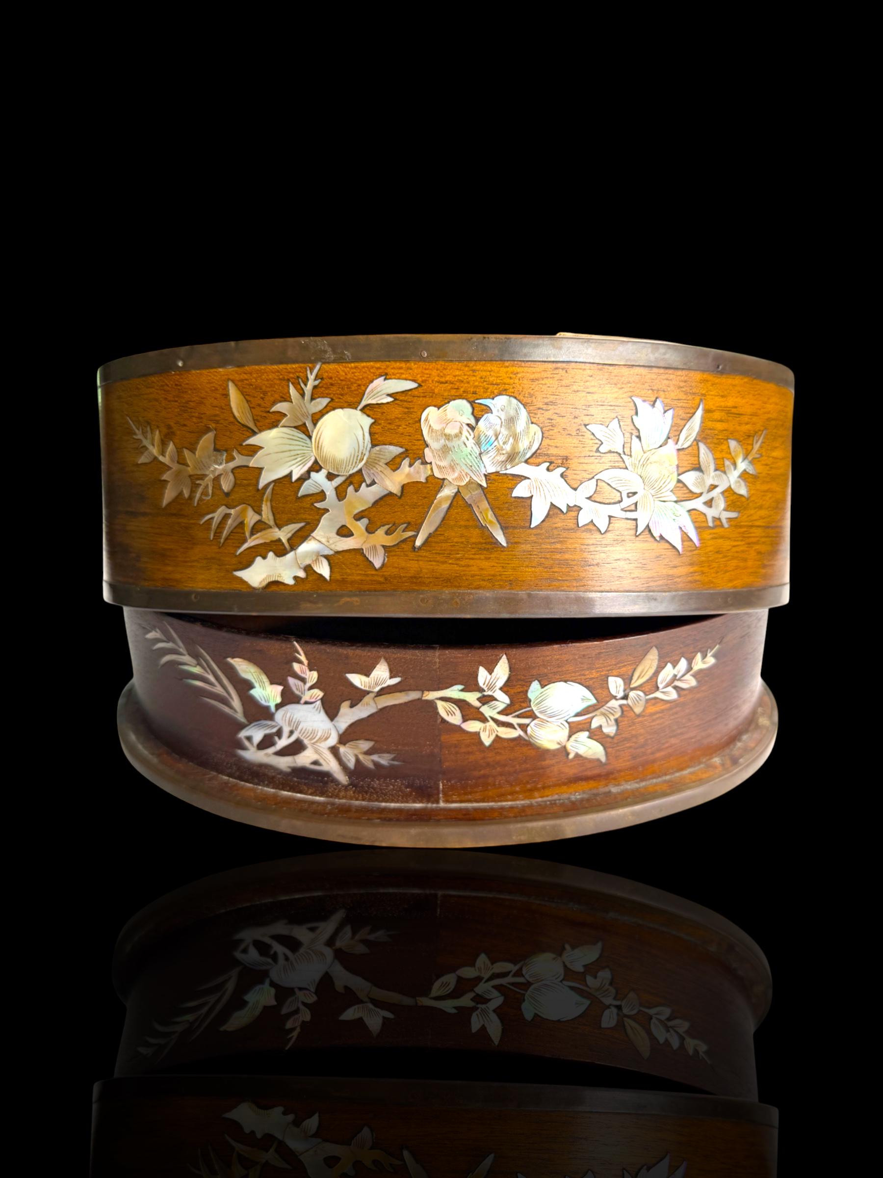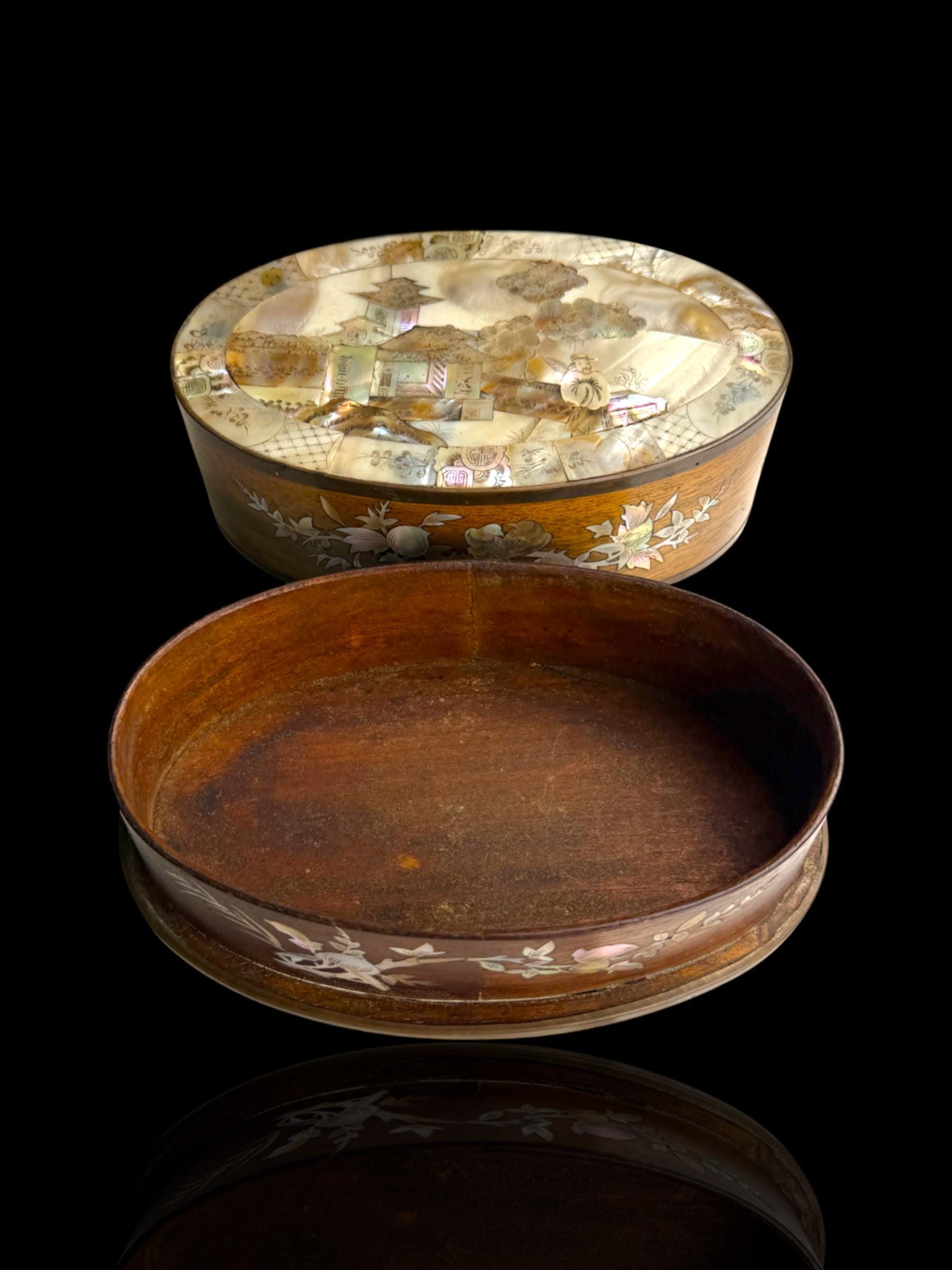 Elegant oval wooden box finely inlaid with mother-of-pearl. Crafted in Vietnam during the French Colonial era for the export market. This is why such pieces are occasionally found in estate sales in France more so that any other country.