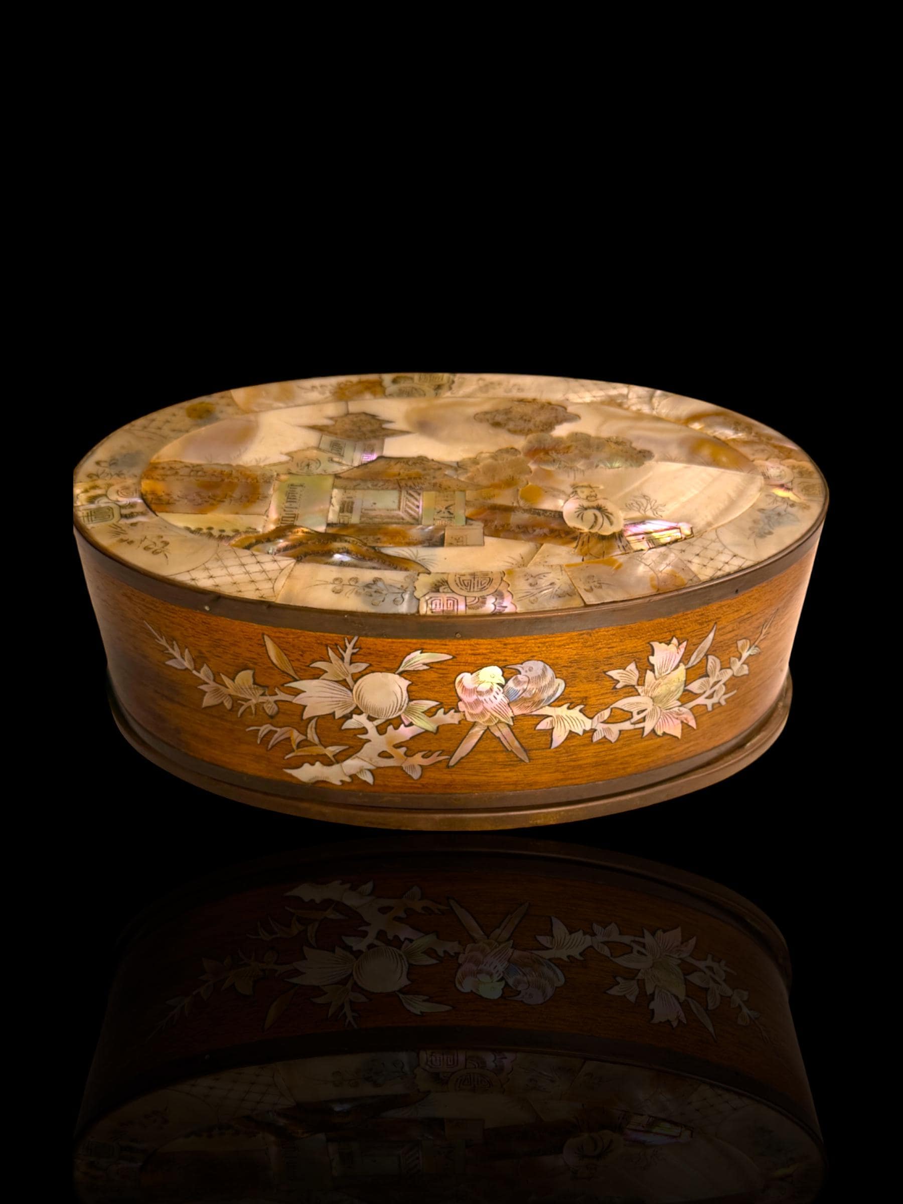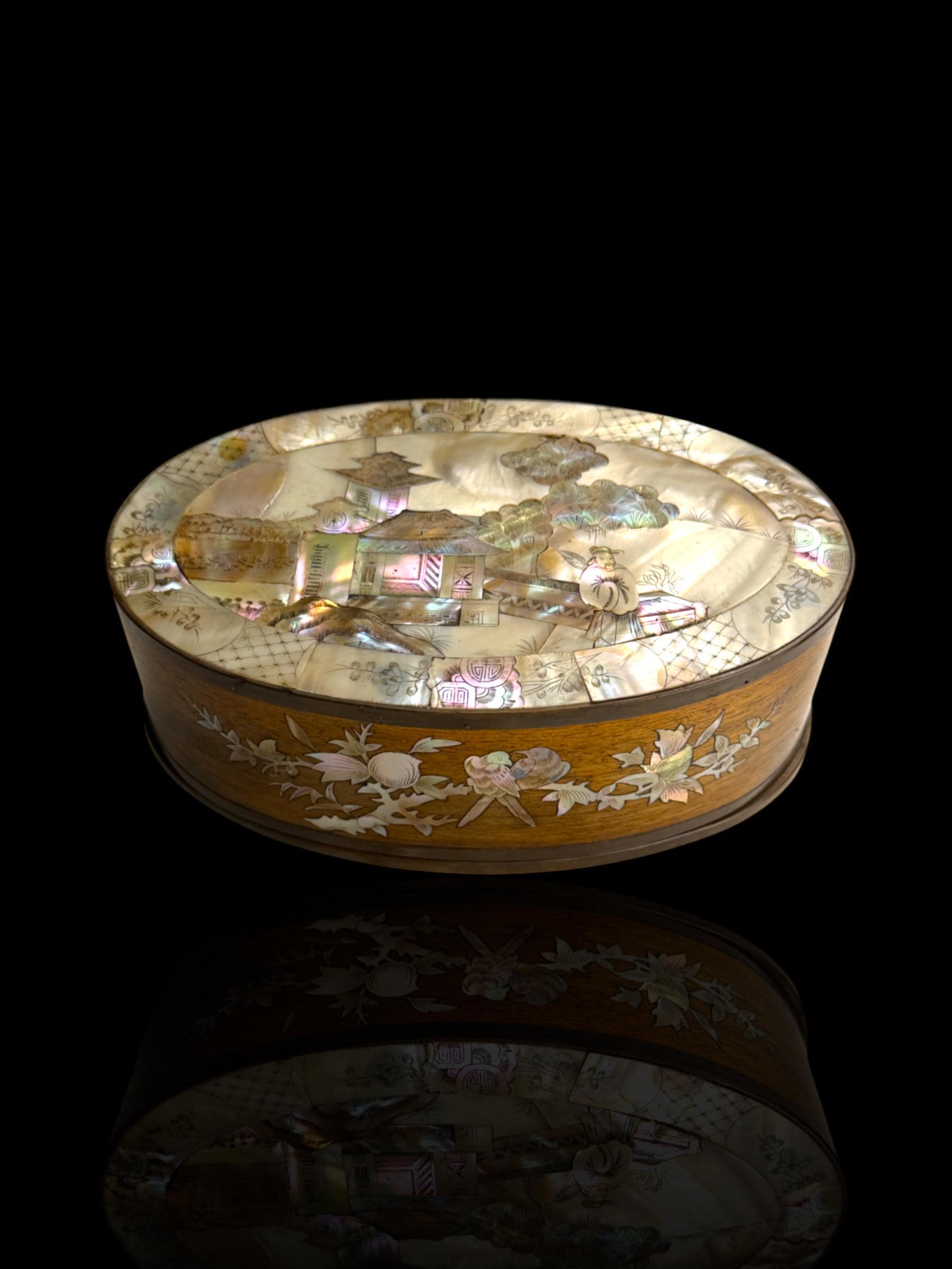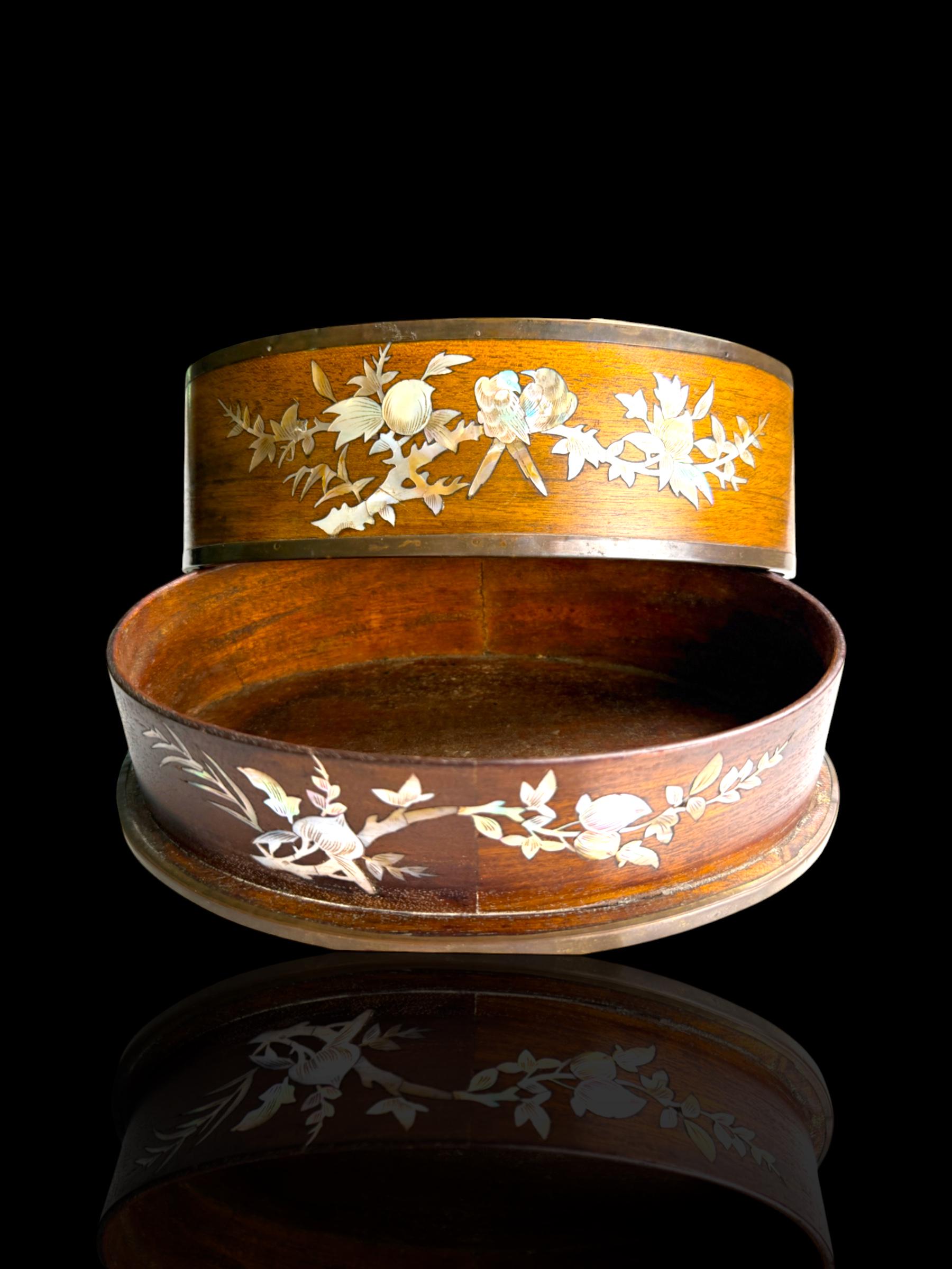 Elegant oval wooden box finely inlaid with mother-of-pearl. Crafted in Vietnam during the French Colonial era for the export market. This is why such pieces are occasionally found in estate sales in France more so that any other country.