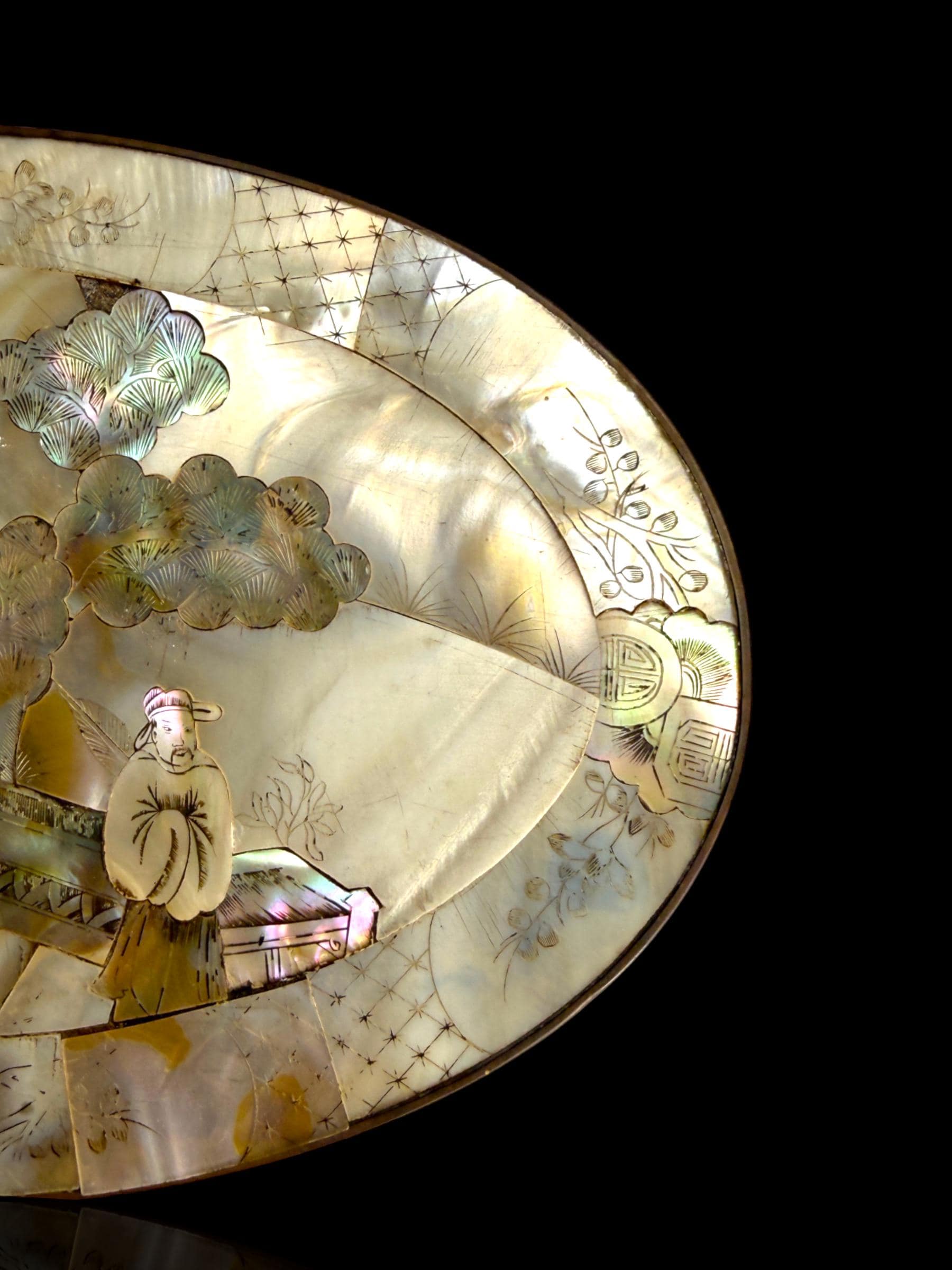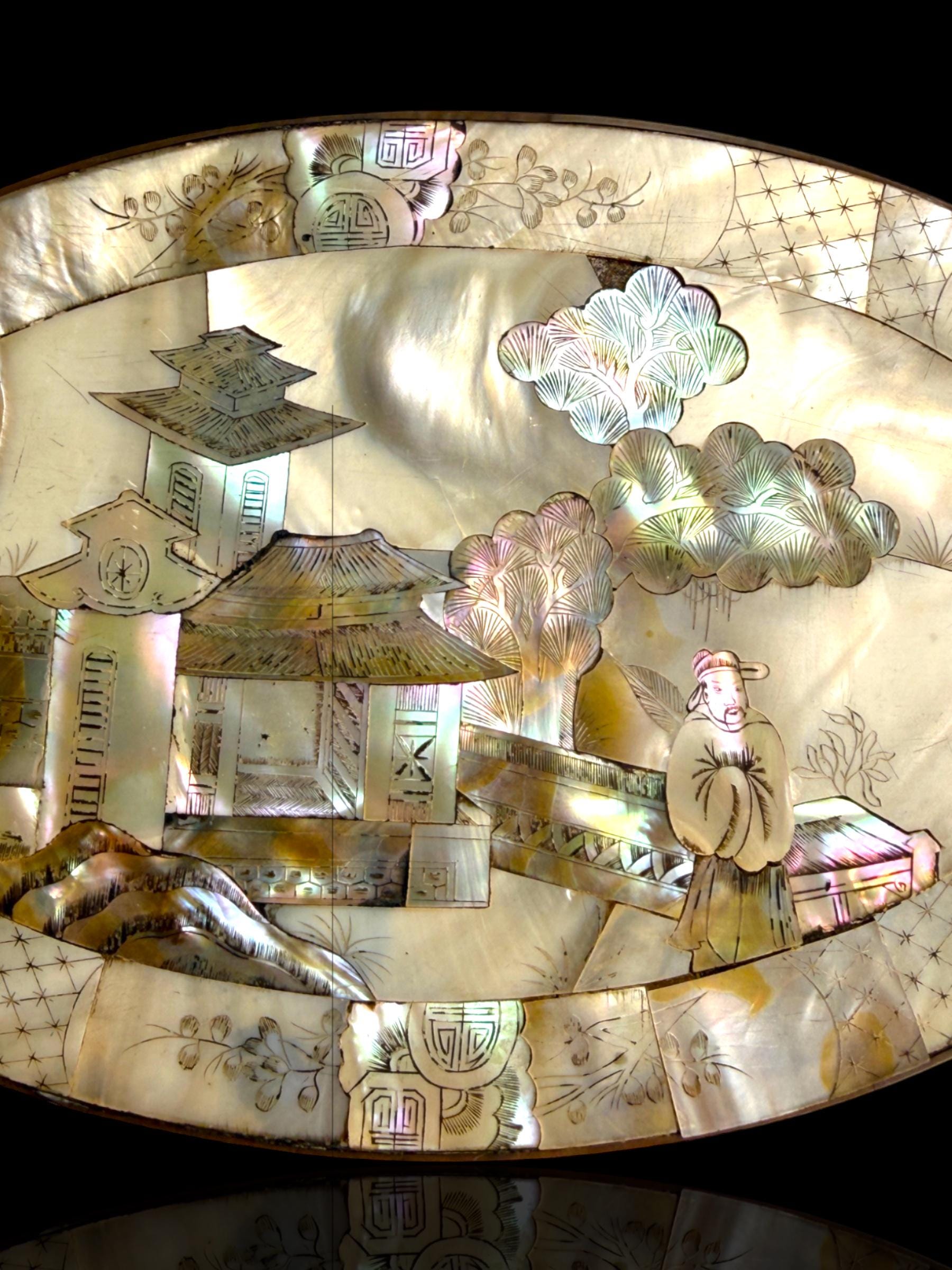 The lid features a traditional East Asian landscape with pavilion, bridge, trees and scholar figure, while the sides are decorated with birds and flowering branches. It exhibits high quality craftsmanship which is difficult to find today. A few small pieces of mother of pearl are missing but structurall solid and excellent conndition for its age.