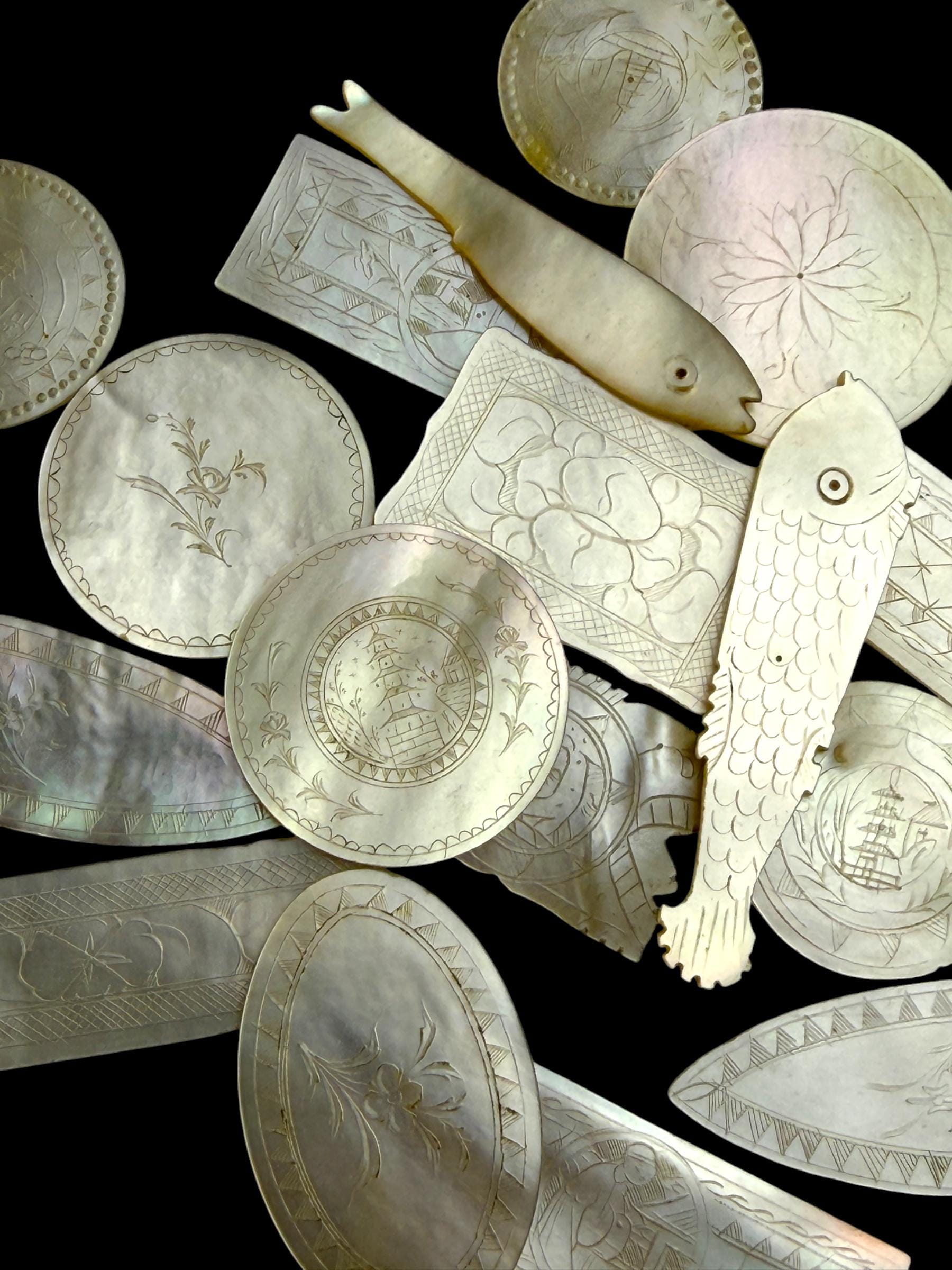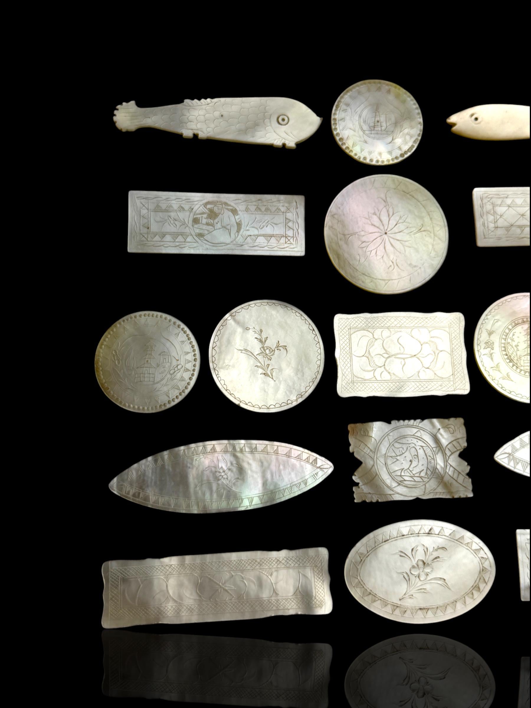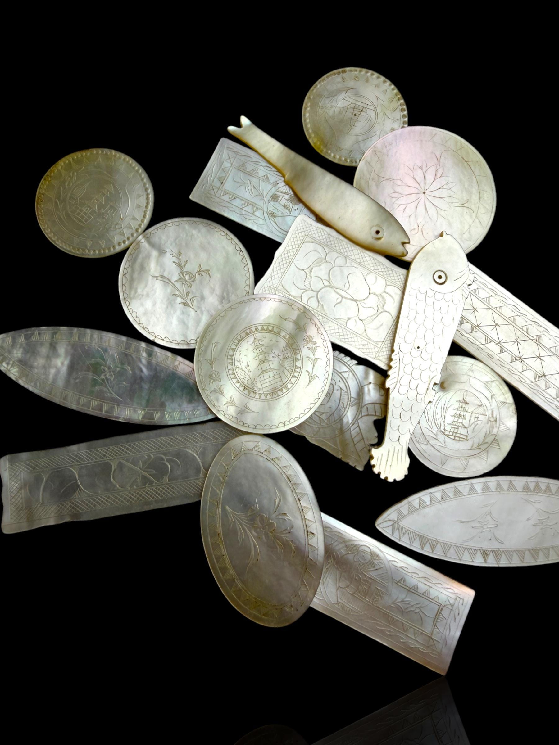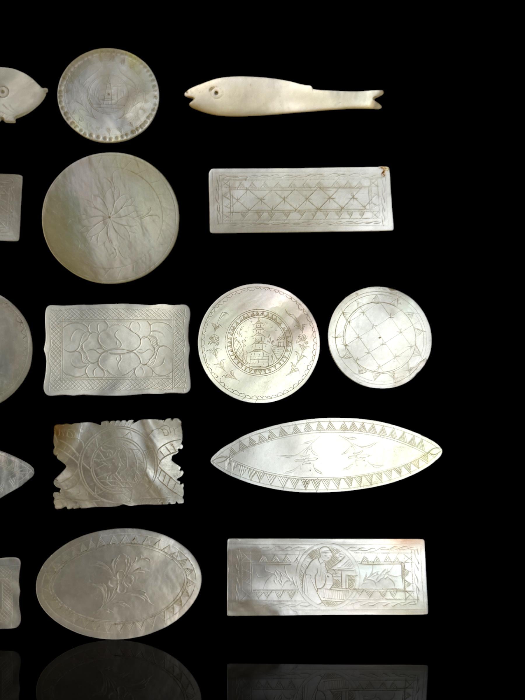 A wide collection of shapes inluding rectangular, circular, oval, scalloped, and novelty fish forms; finely engraved with floral patterns, geometric motifs, and village scenes. The largest piece just over 5cm in width. Each piece is pure mother of pearl, hand-carved from pearl shells approximately in the 18th and 19th century.