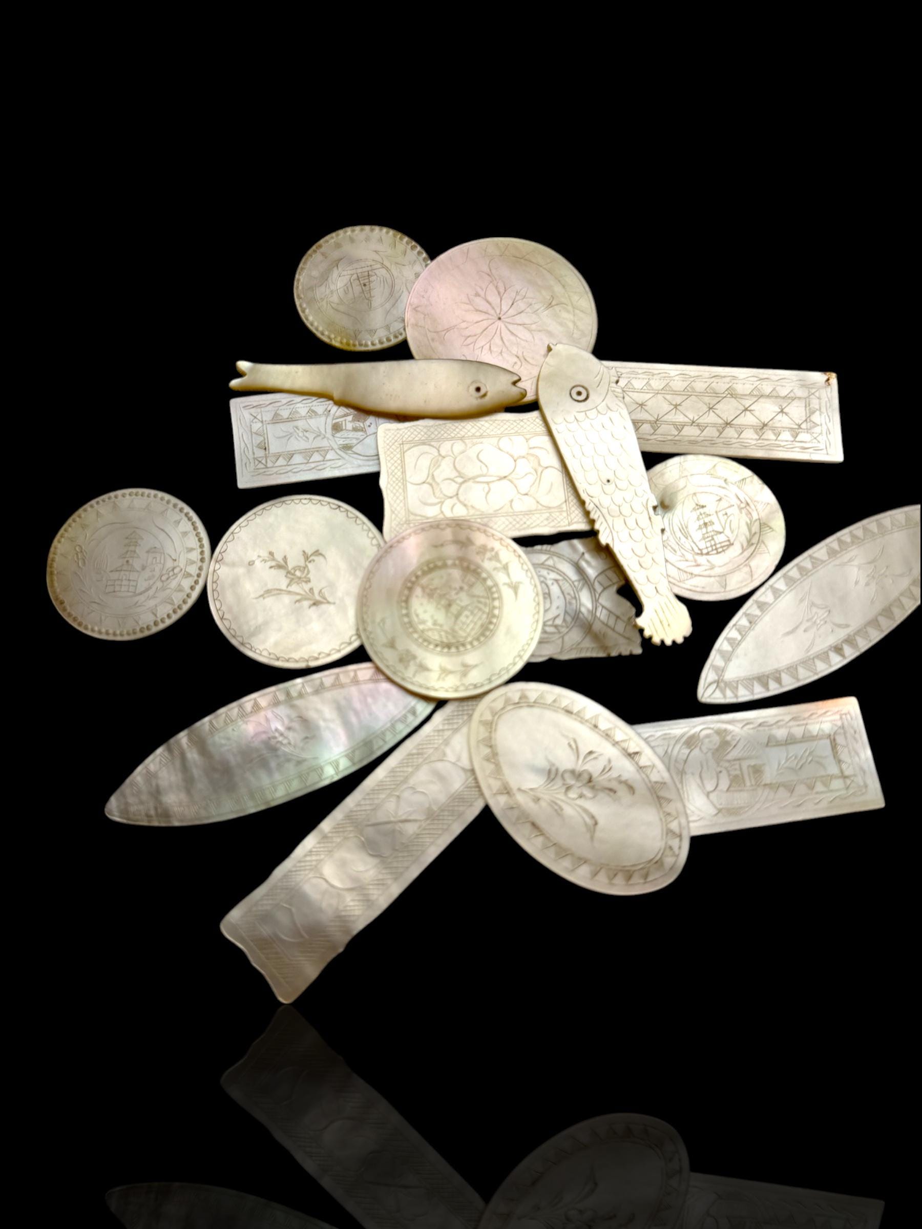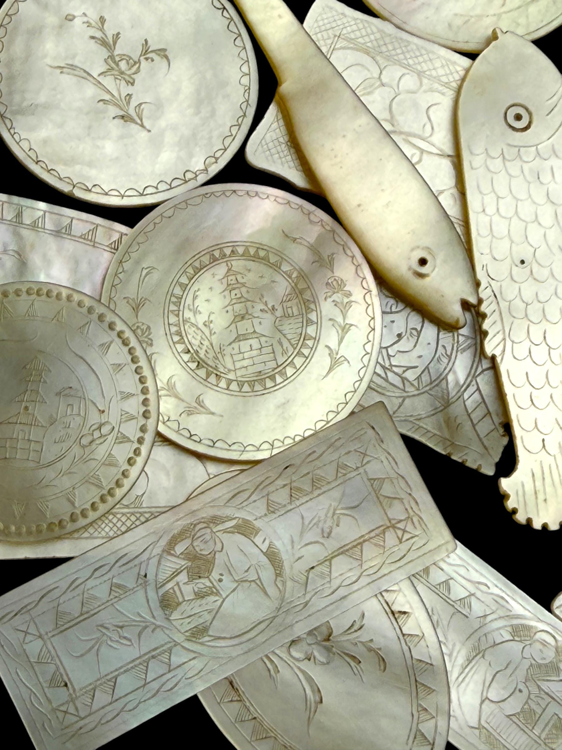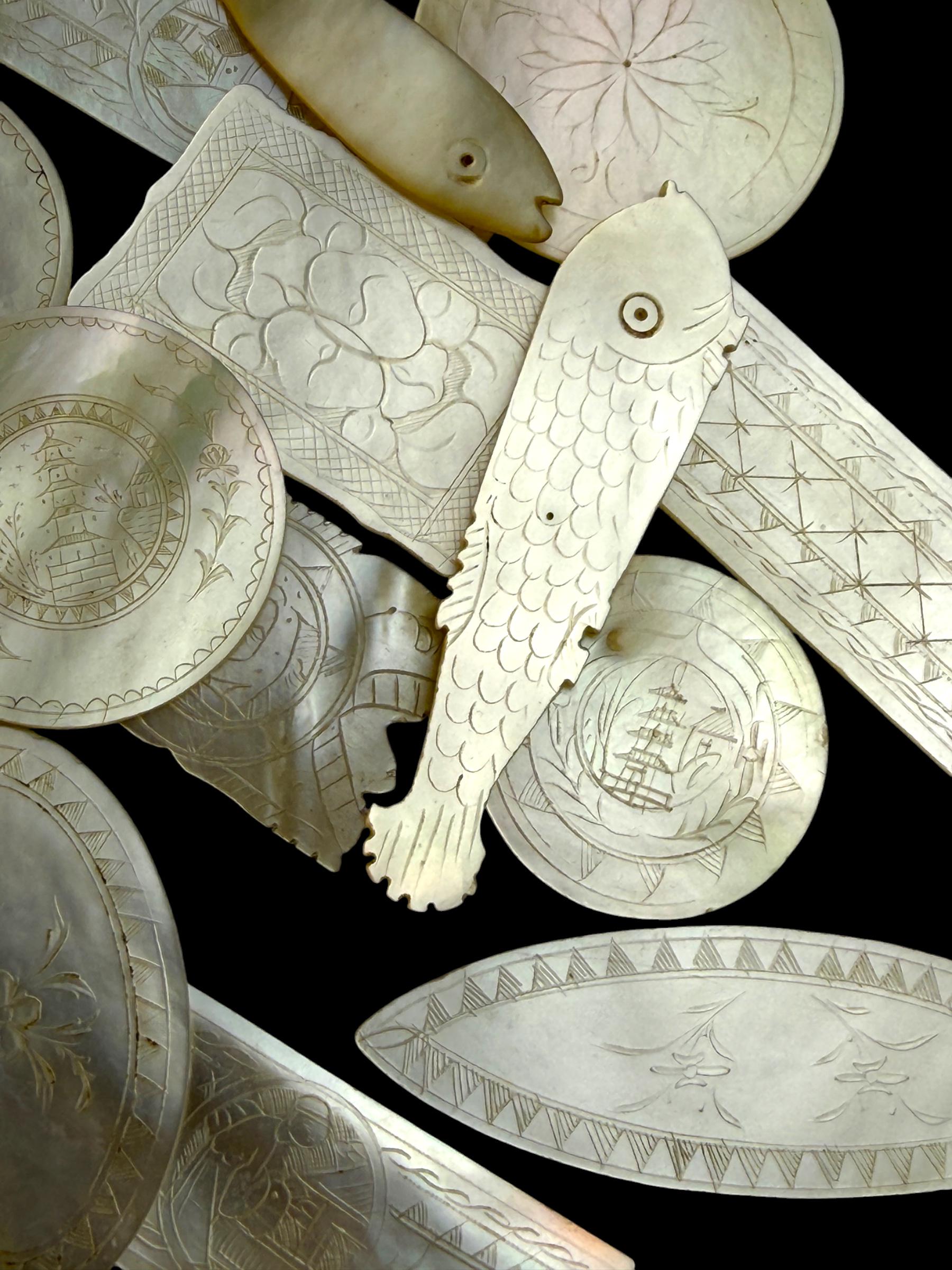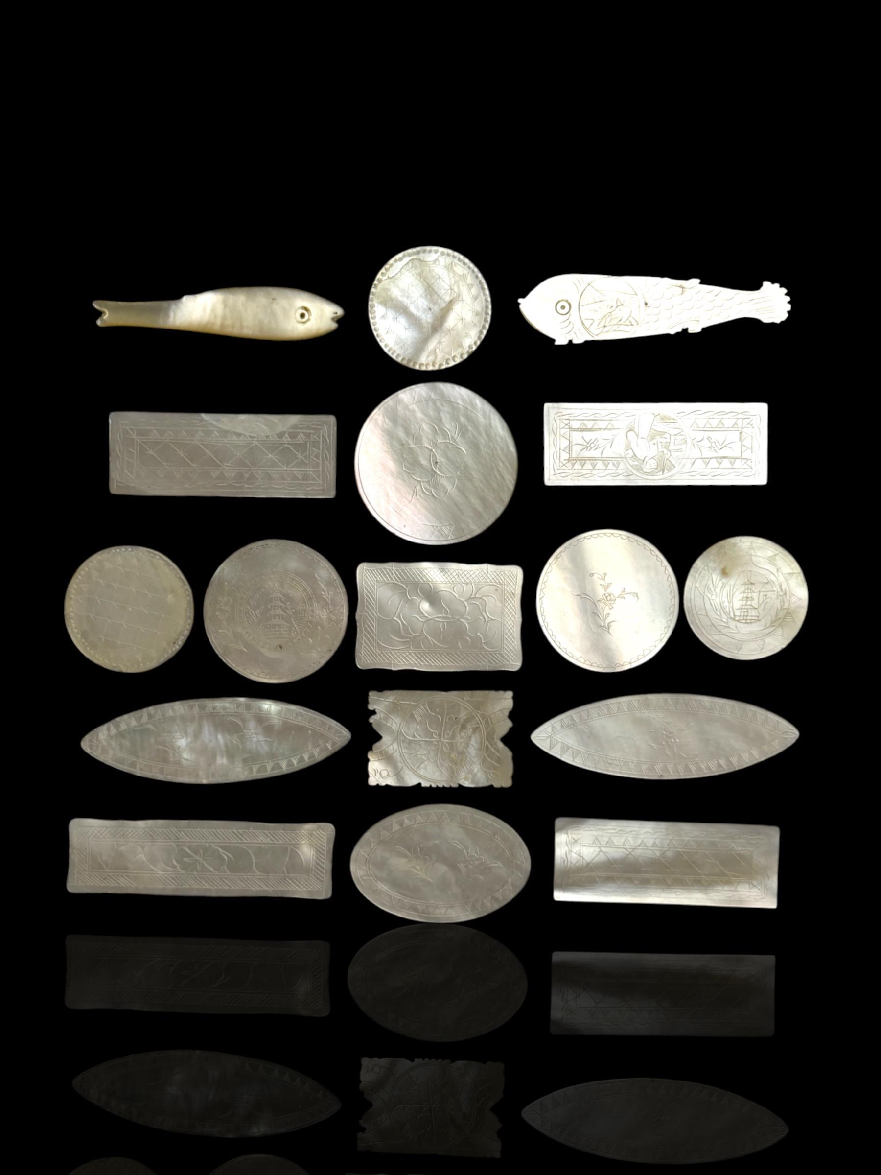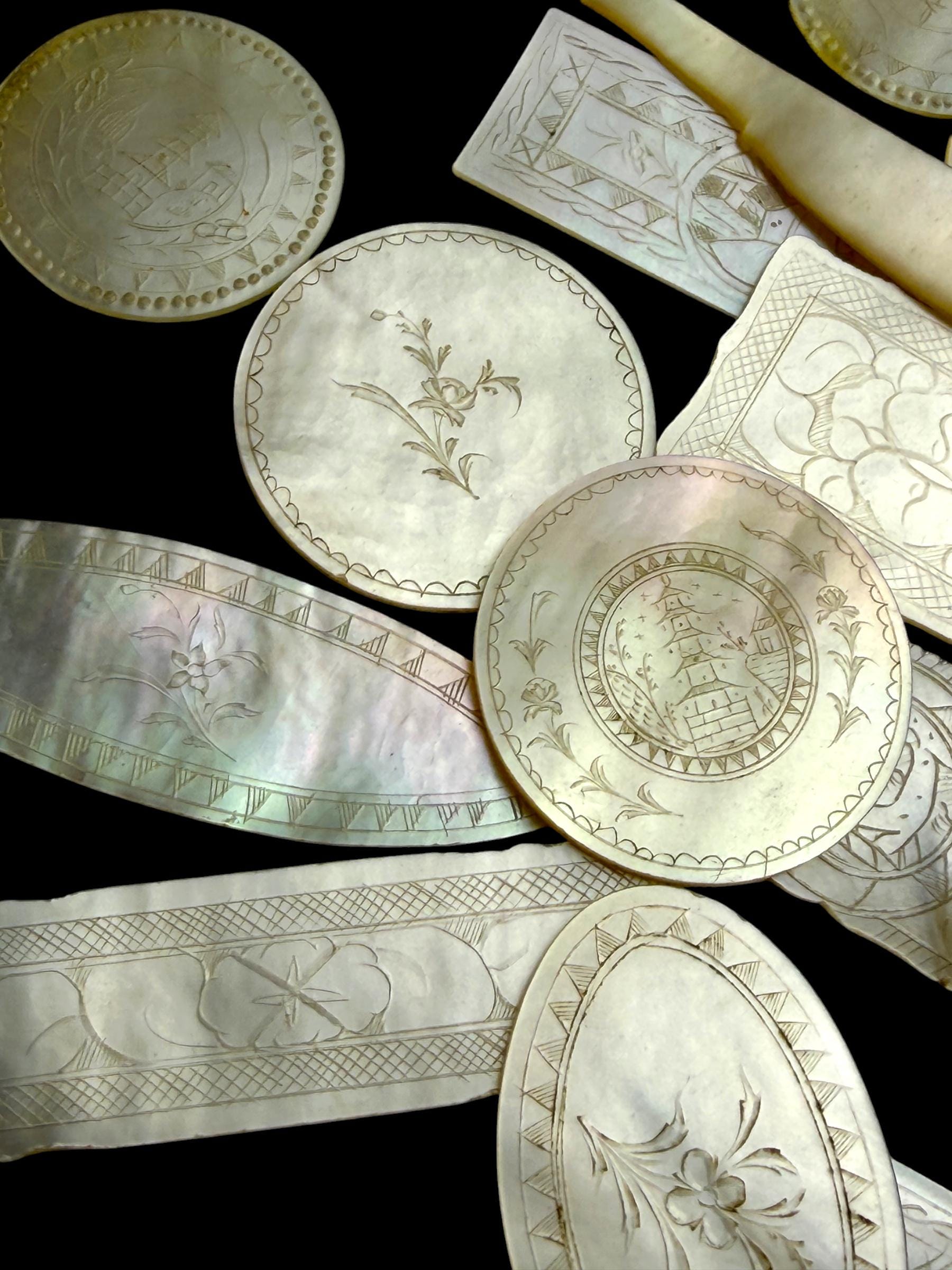 A wide collection of shapes inluding rectangular, circular, oval, scalloped, and novelty fish forms; finely engraved with floral patterns, geometric motifs, and village scenes. The largest piece just over 5cm in width. Each piece is pure mother of pearl, hand-carved from pearl shells approximately in the 18th and 19th century.