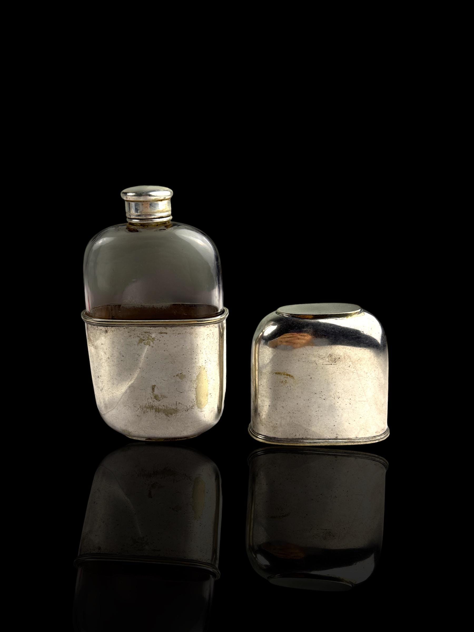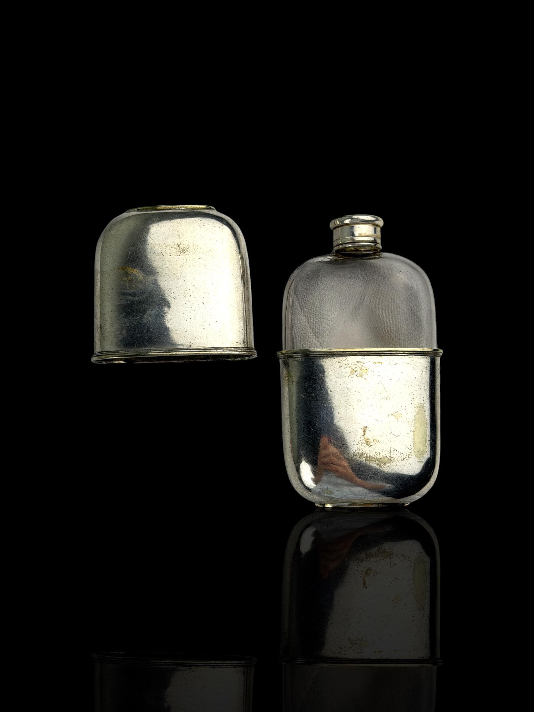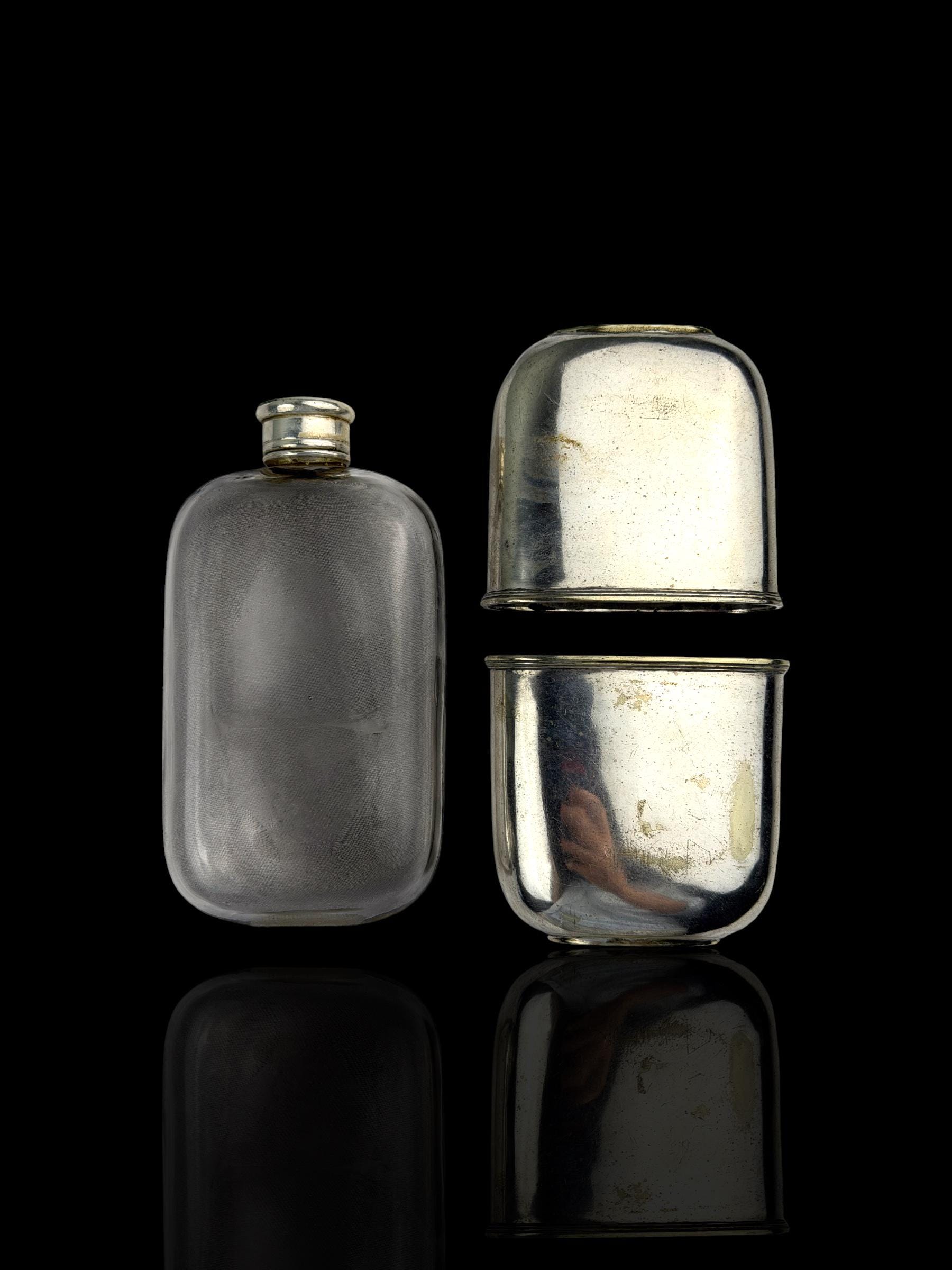 Every man loves a hip flask. This one is a particularly interesting design with two silver plate cups over each end ecompassing the glass interior.